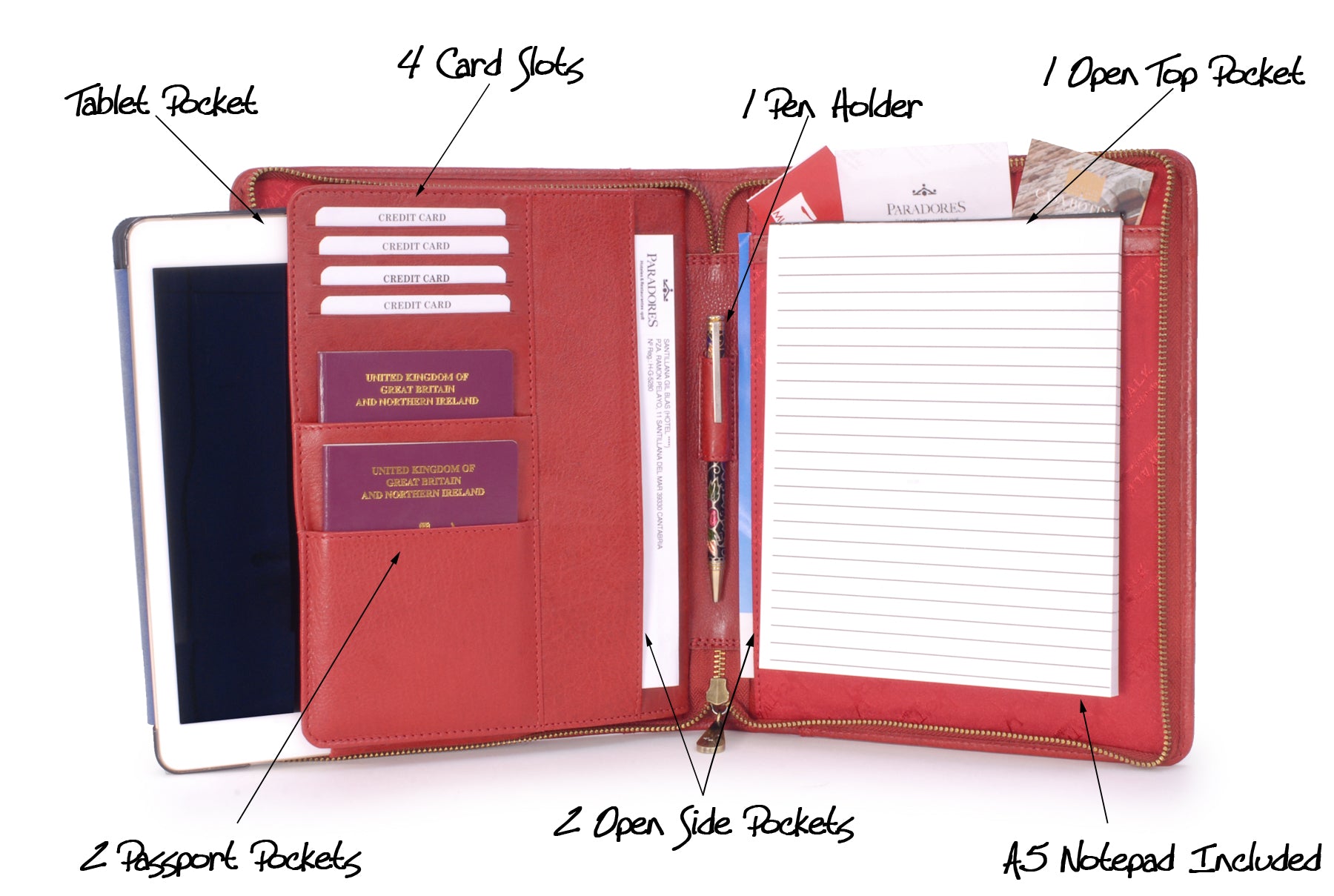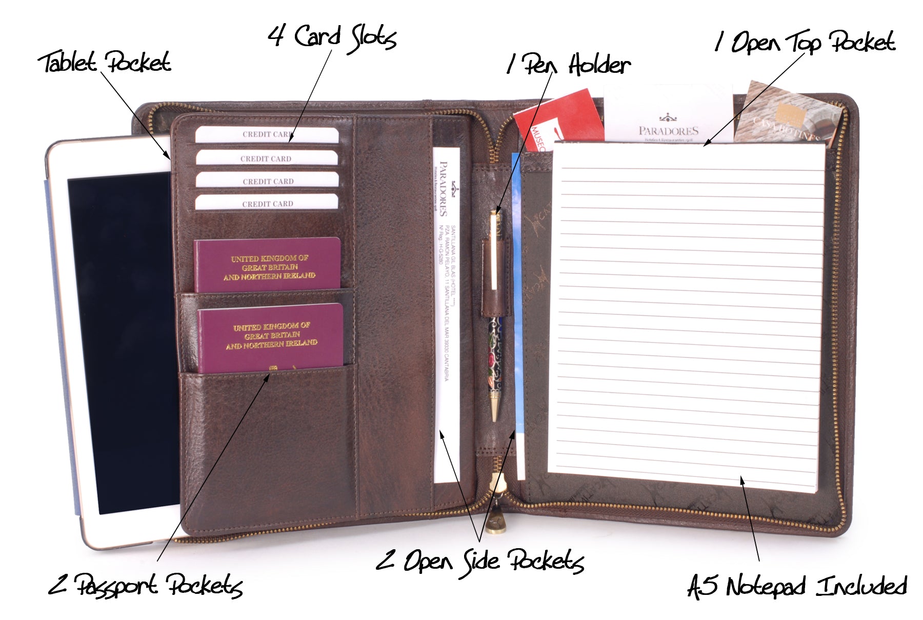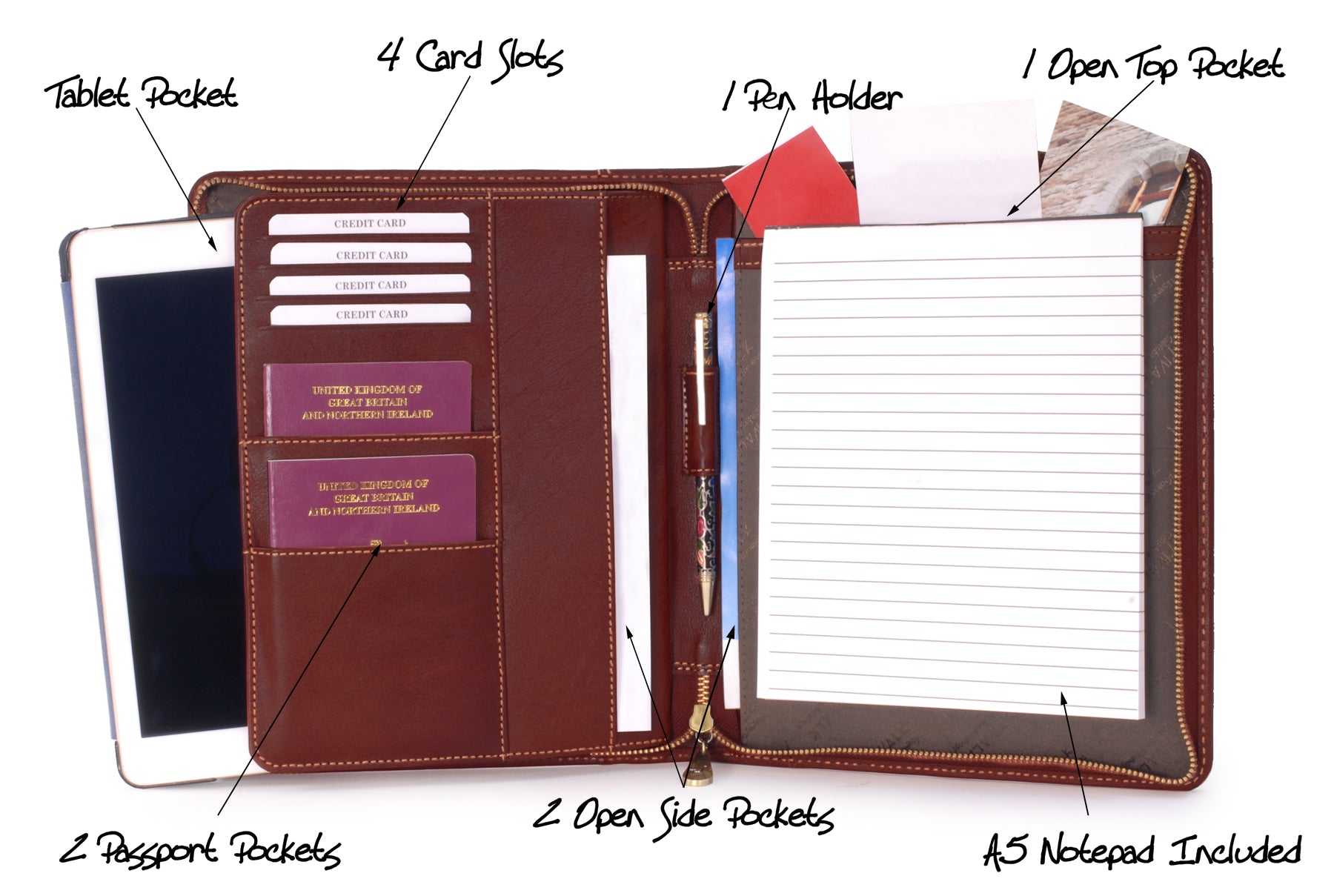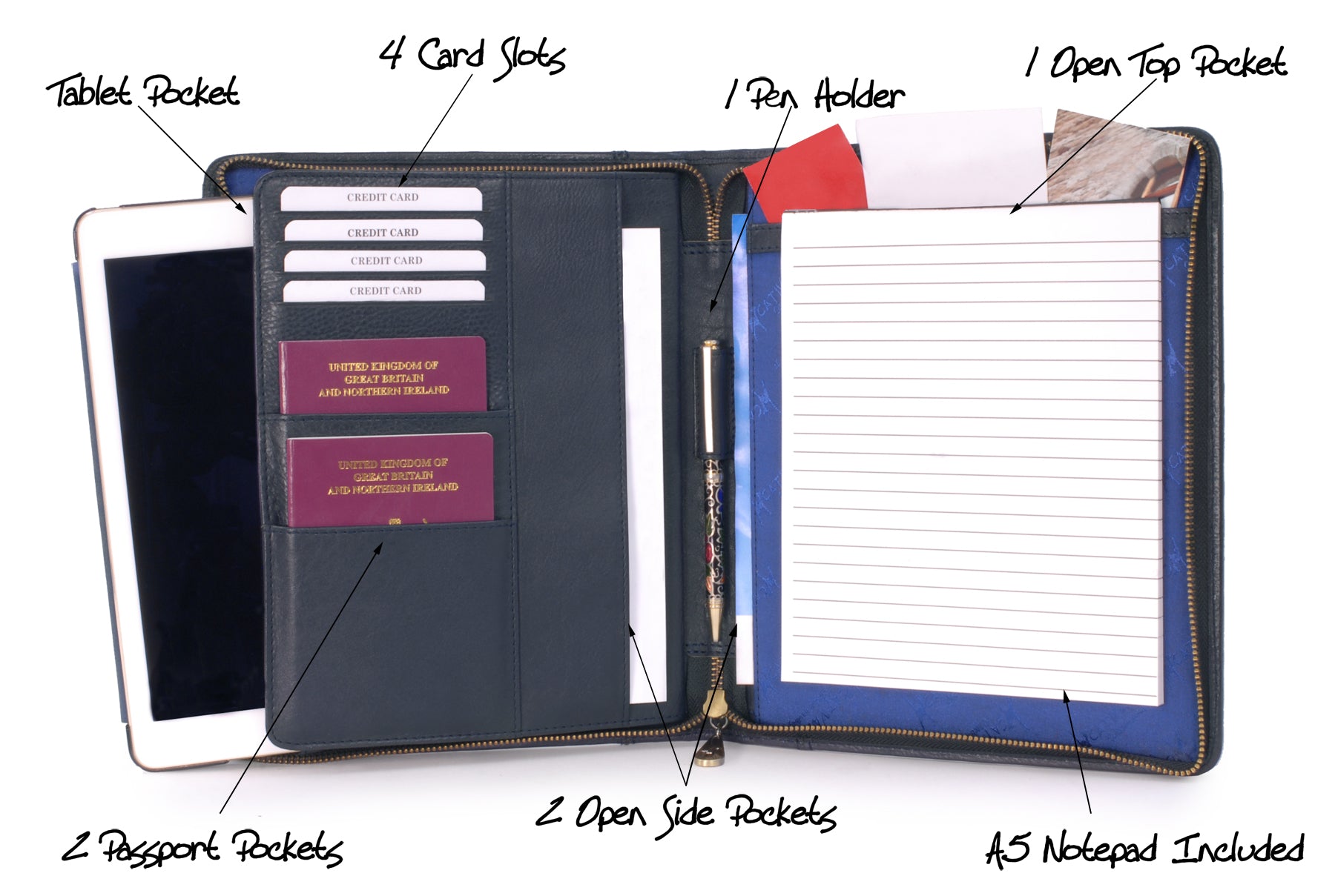 This neat zip folder is designed to be comfortably carried under the arm. Organisational features include pockets for pen, business cards and A5 notepad. You can tuck a tablet behind the interior leather sleeve.Fits: (iPad, iPad Mini, iPad Air, iPad Pro 11”, tablets, Galaxy Tab 3, 4, 5, A etc.)