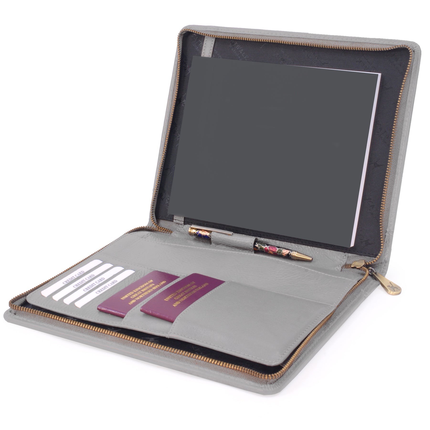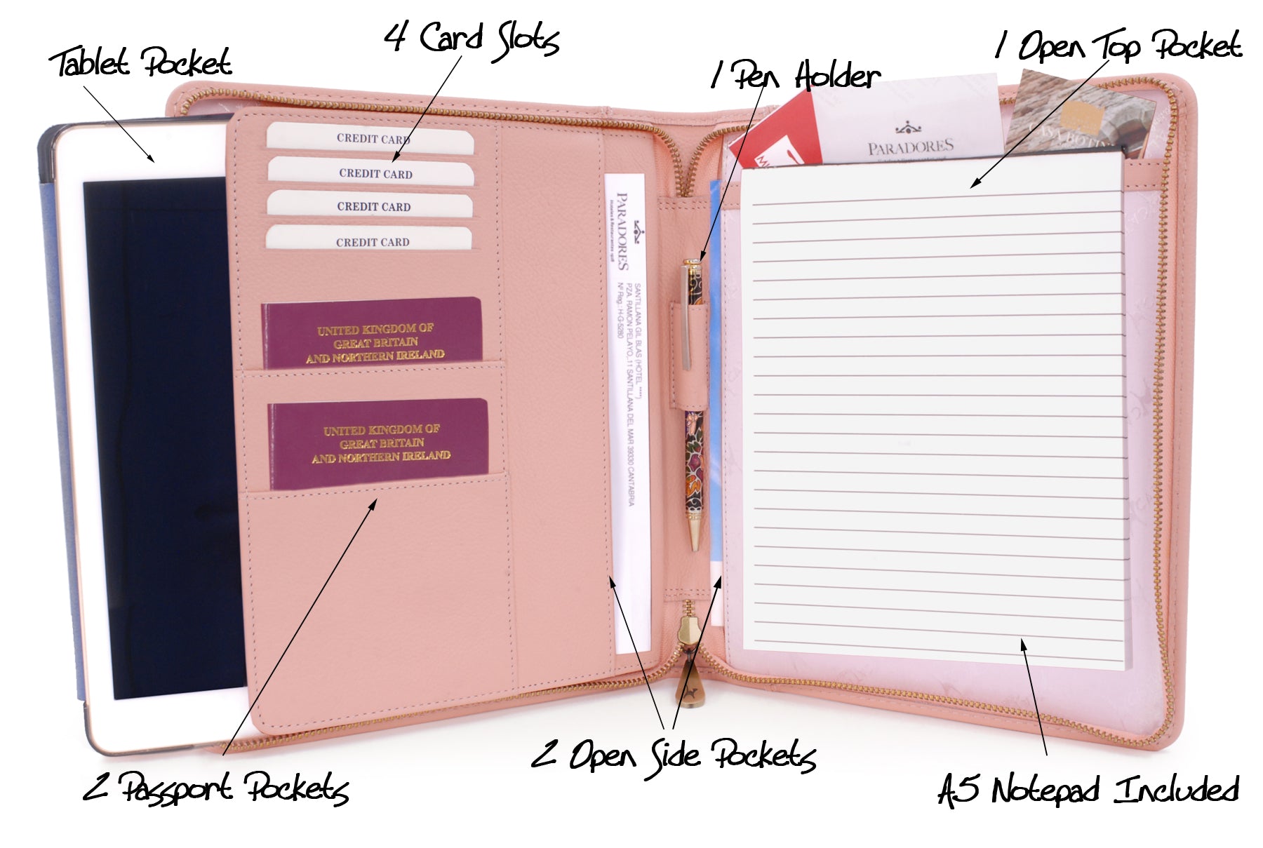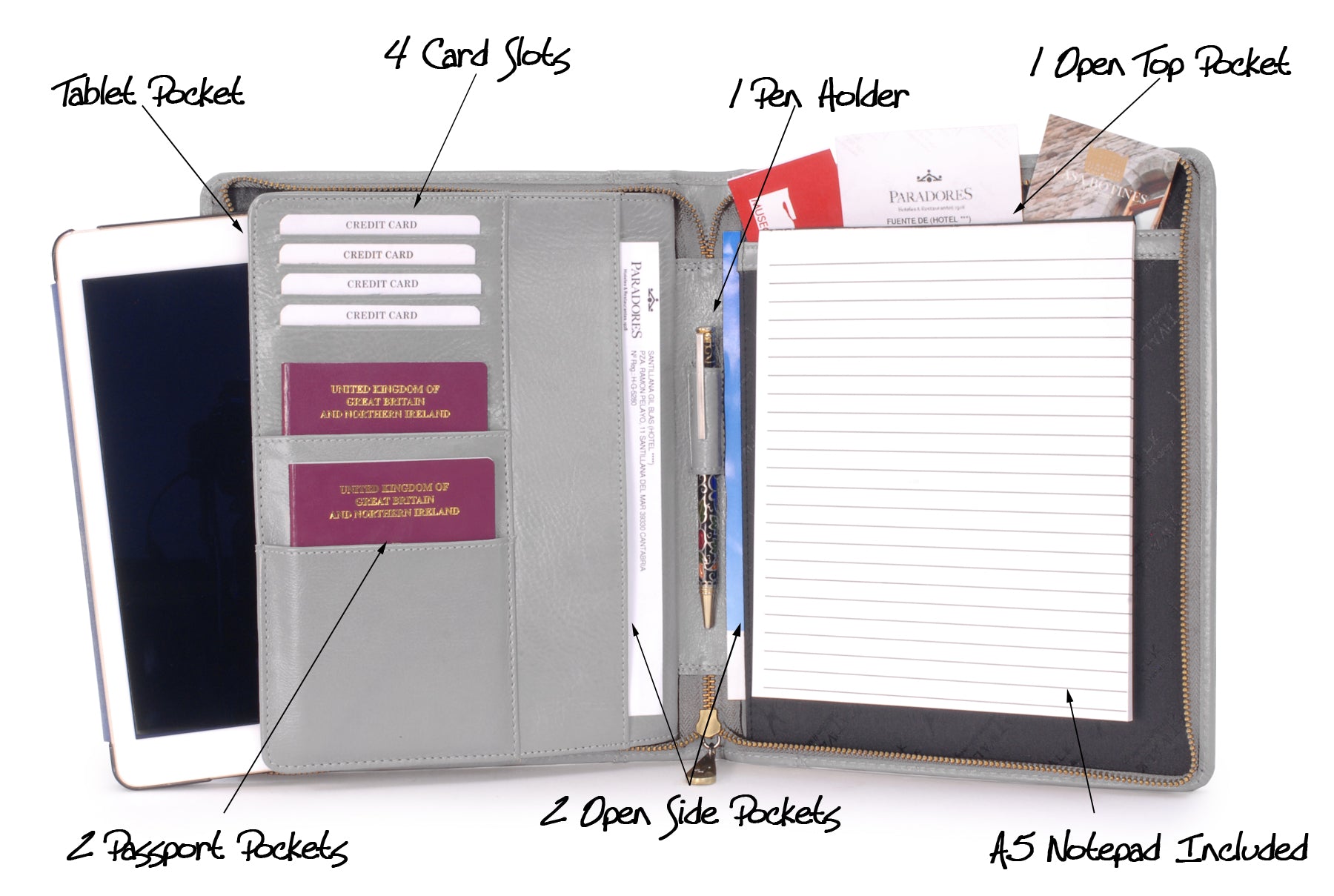 This neat zip folder is designed to be comfortably carried under the arm. Organisational features include pockets for pen, business cards and A5 notepad. You can tuck a tablet behind the interior leather sleeve.Fits: (iPad, iPad Mini, iPad Air, iPad Pro 11”, tablets, Galaxy Tab 3, 4, 5, A etc.)