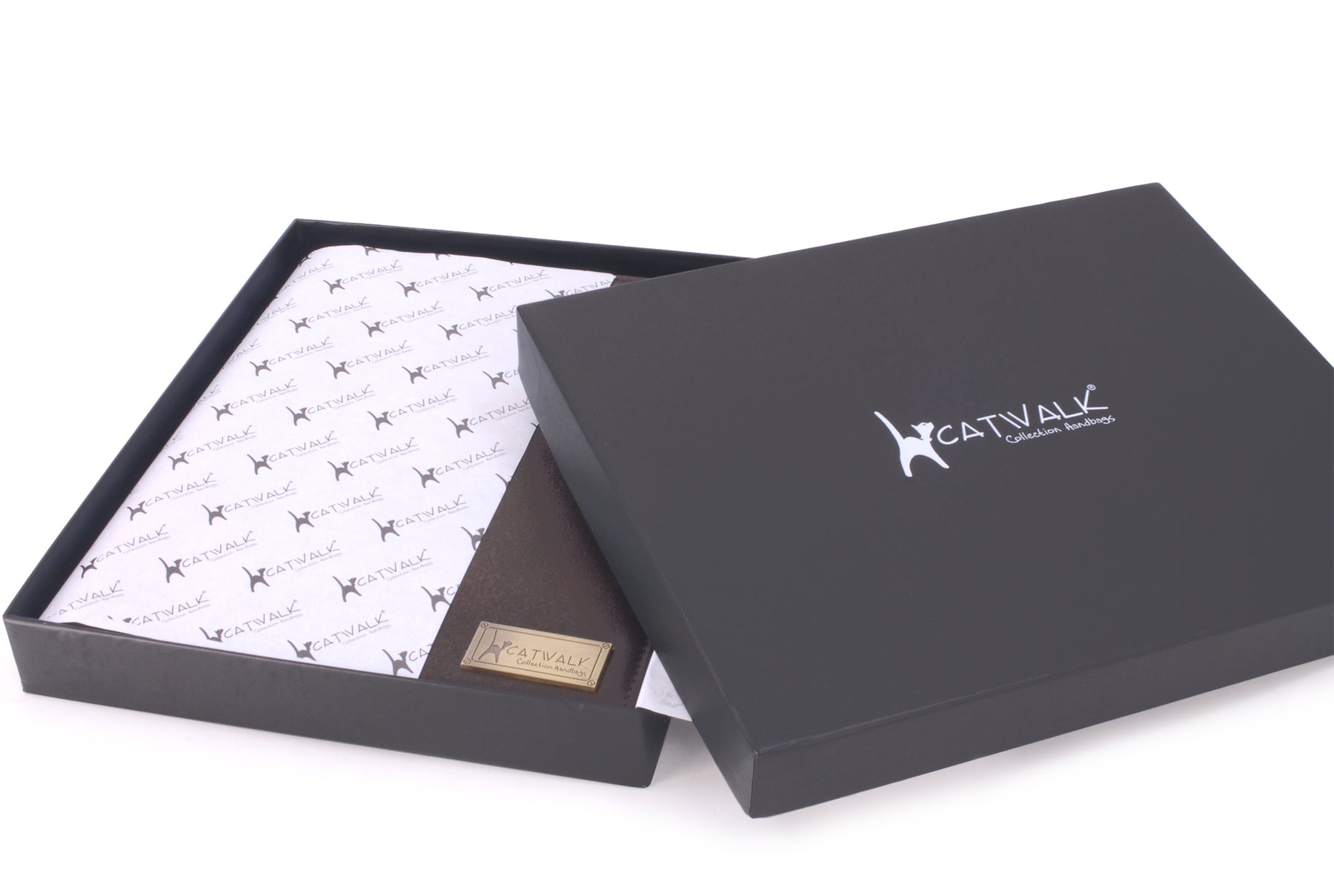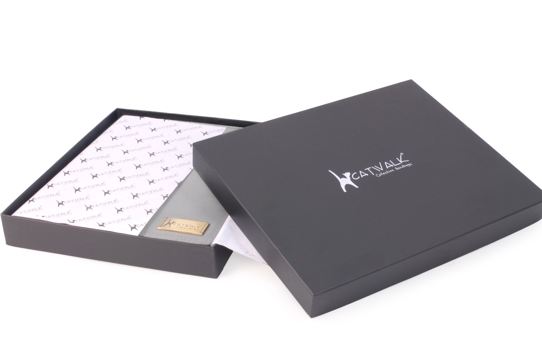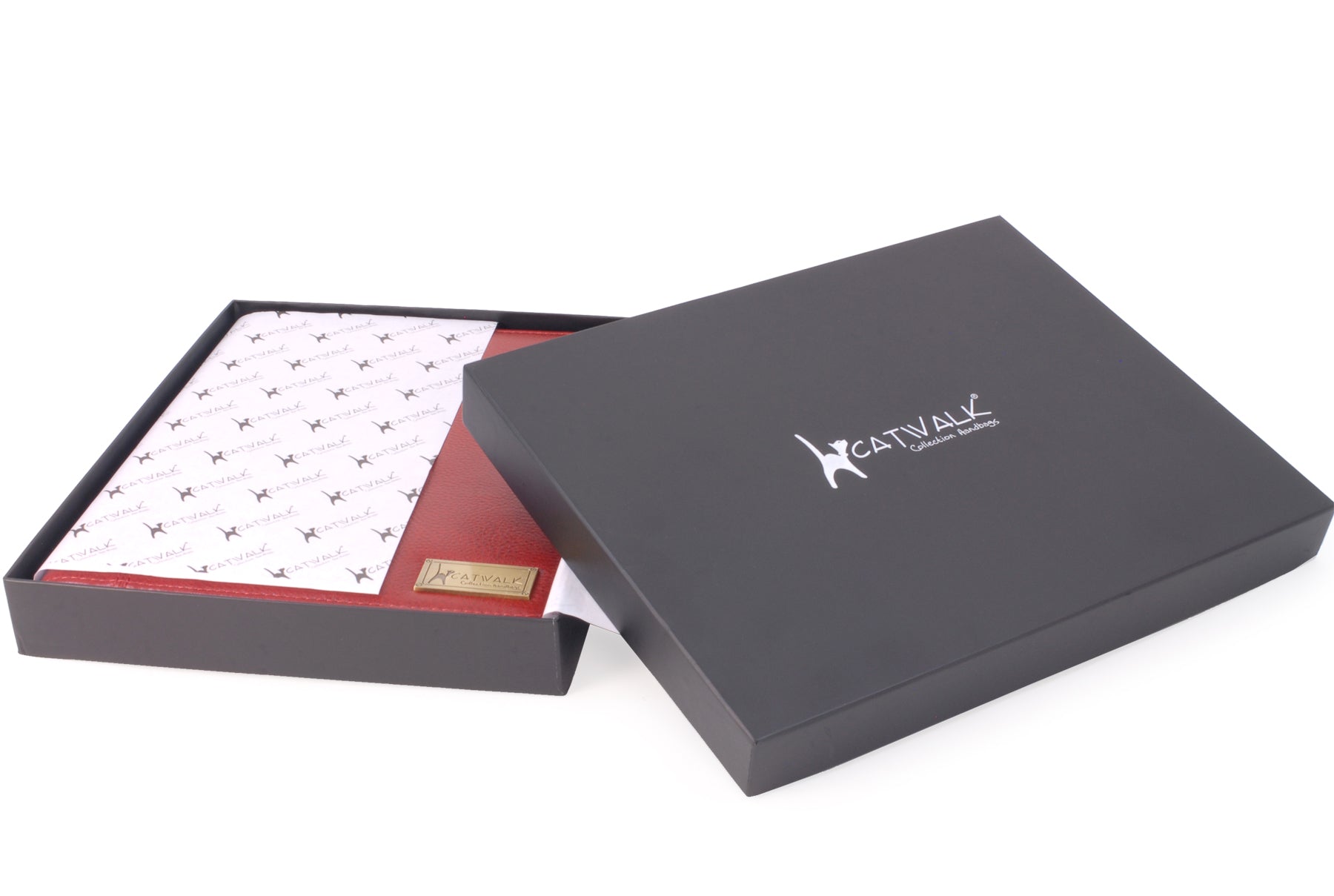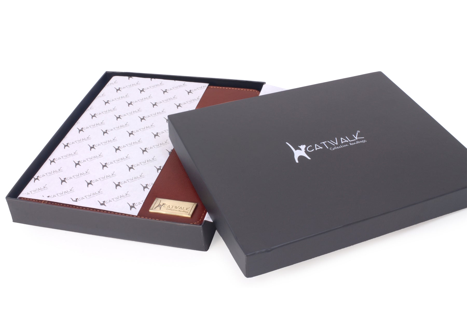 Each product comes in a stylish presentation gift box, notepad included.Leather outer and signature jacquard fabric interior.