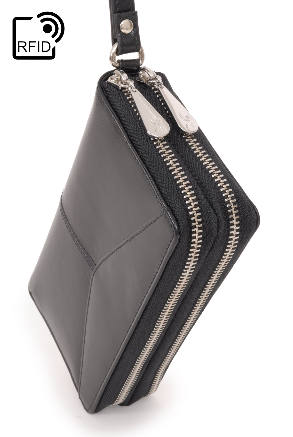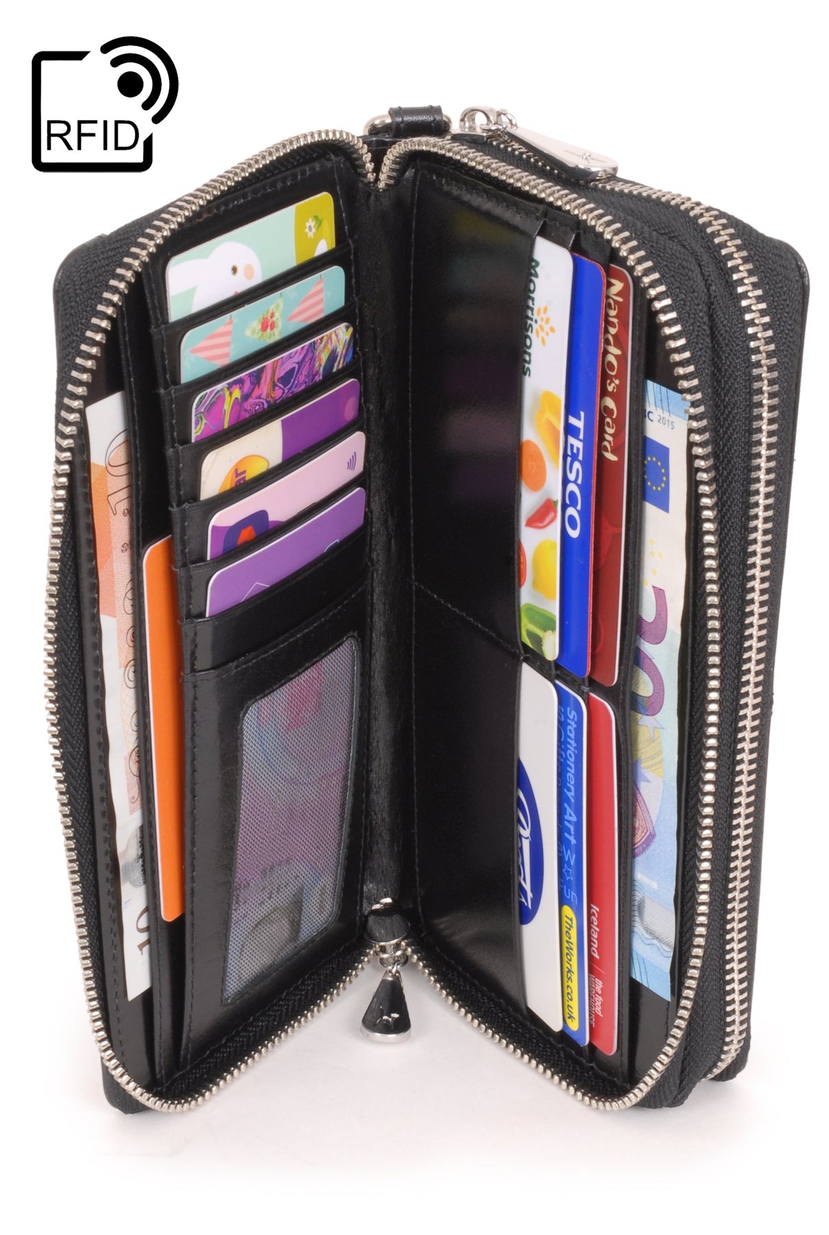 This purse features two main zipped sections for structured organisation. The front compartment includes space for receipts, notes, 13 credit cards including an ID window that can be used interchangeably for cards or identification. The rear section opens in a concertina style, with a secure zipped coin pocket and open compartments for accessories or a smartphone. The structured layout helps keep contents tidy and visible when opened.