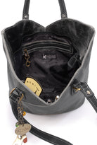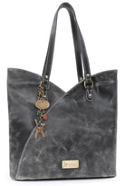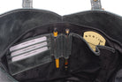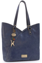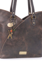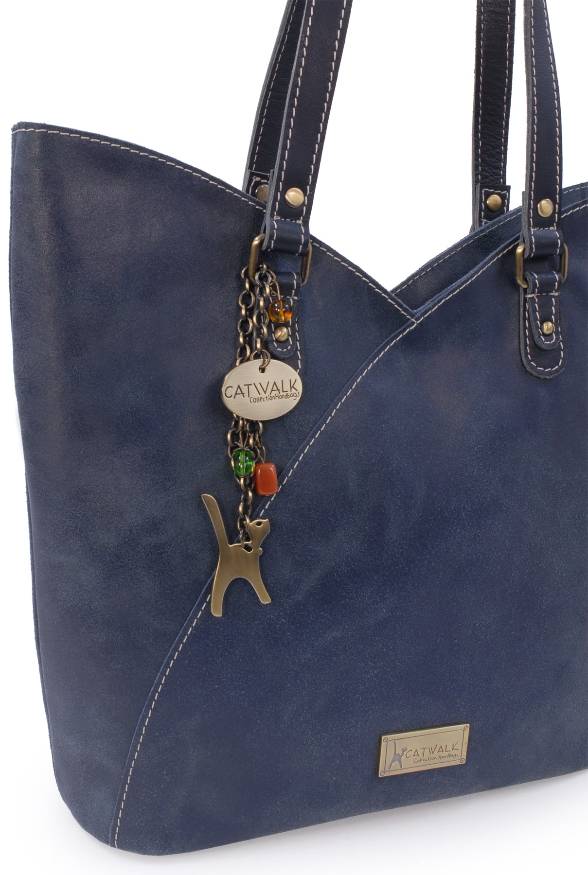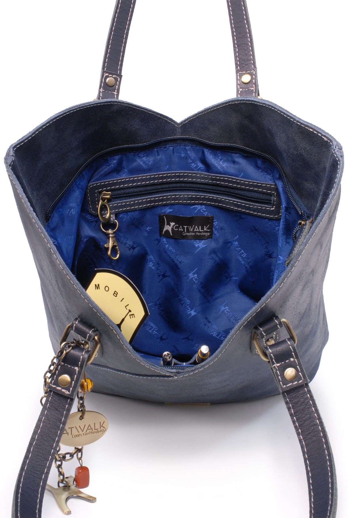 This large leather tote bag features a tulip-shaped silhouette and antique brass fittings, designed for everyday use.The bag can be carried over the shoulder or hooked over the lower arm.The leather is split, making the bag lighter than typical leather bags.With ample capacity, this handbag includes multiple compartments and pockets for organised storage.Organisational features include pockets for pens, credit cards, and mobile phones. The main compartment can hold notepads and magazines up to A4 size.Interior pockets are reinforced with leather trim. There is a zipped outer pocket on the rear of the bag for additional storage.The bag closes securely with a zip.A key fob clip is attached inside the bag to keep keys easily accessible and prevent them from getting lost at the bottom.A brass plate on the front panel features the Catwalk Collection Cat Logo. Contrast stitching defines the structure of the bag.The flat base provides stability when the bag is set down.This leather shoulder bag offers spacious, organised storage with a distinctive, classic shape.