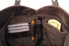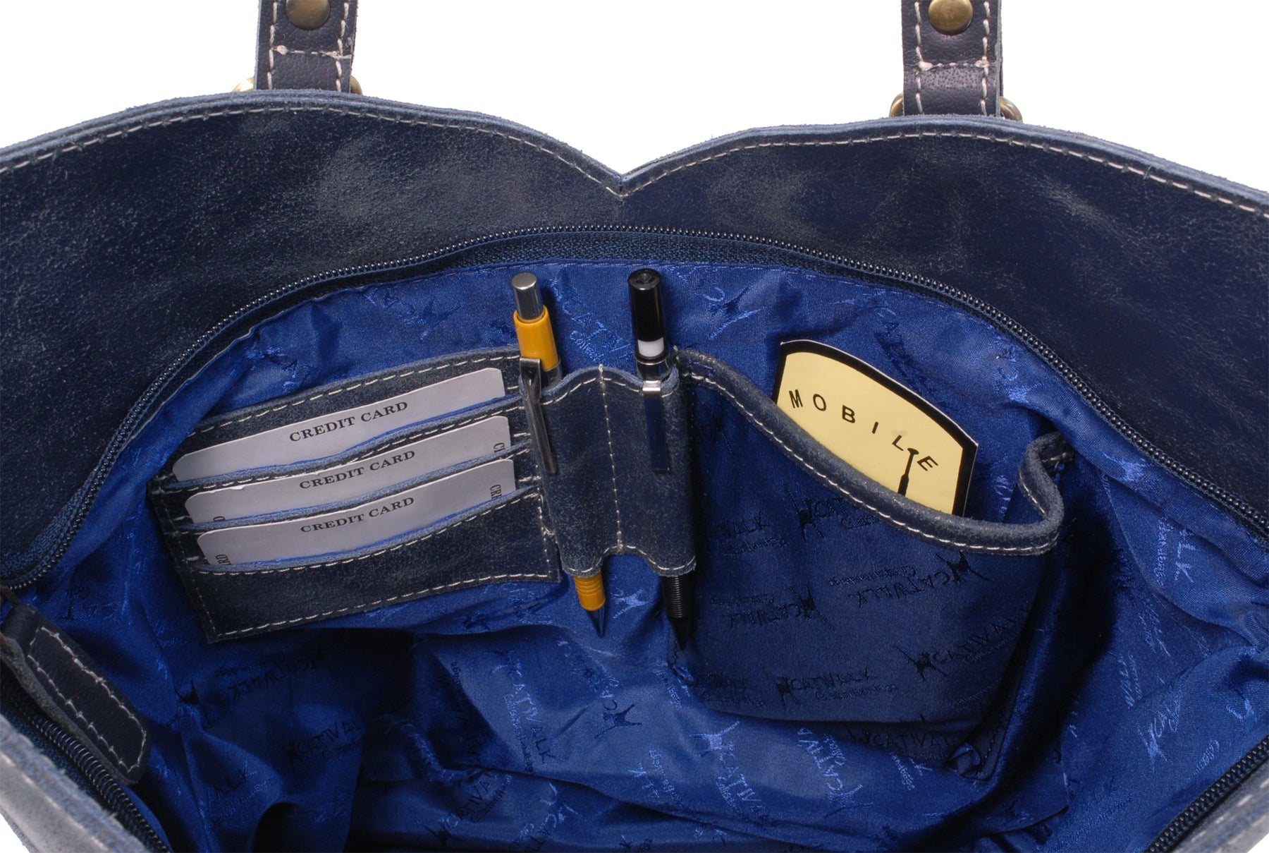 Pockets: 1 Main Compartment + 1 Interior Rear Zipped Pocket + 1 Leather topped Mobile Phone Holder + 2 Leather topped Pen Holders + 3 Credit Card Holders + 1 Spring Clip Key Fob + 1 Outer Rear Zipped Pocket