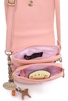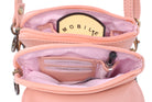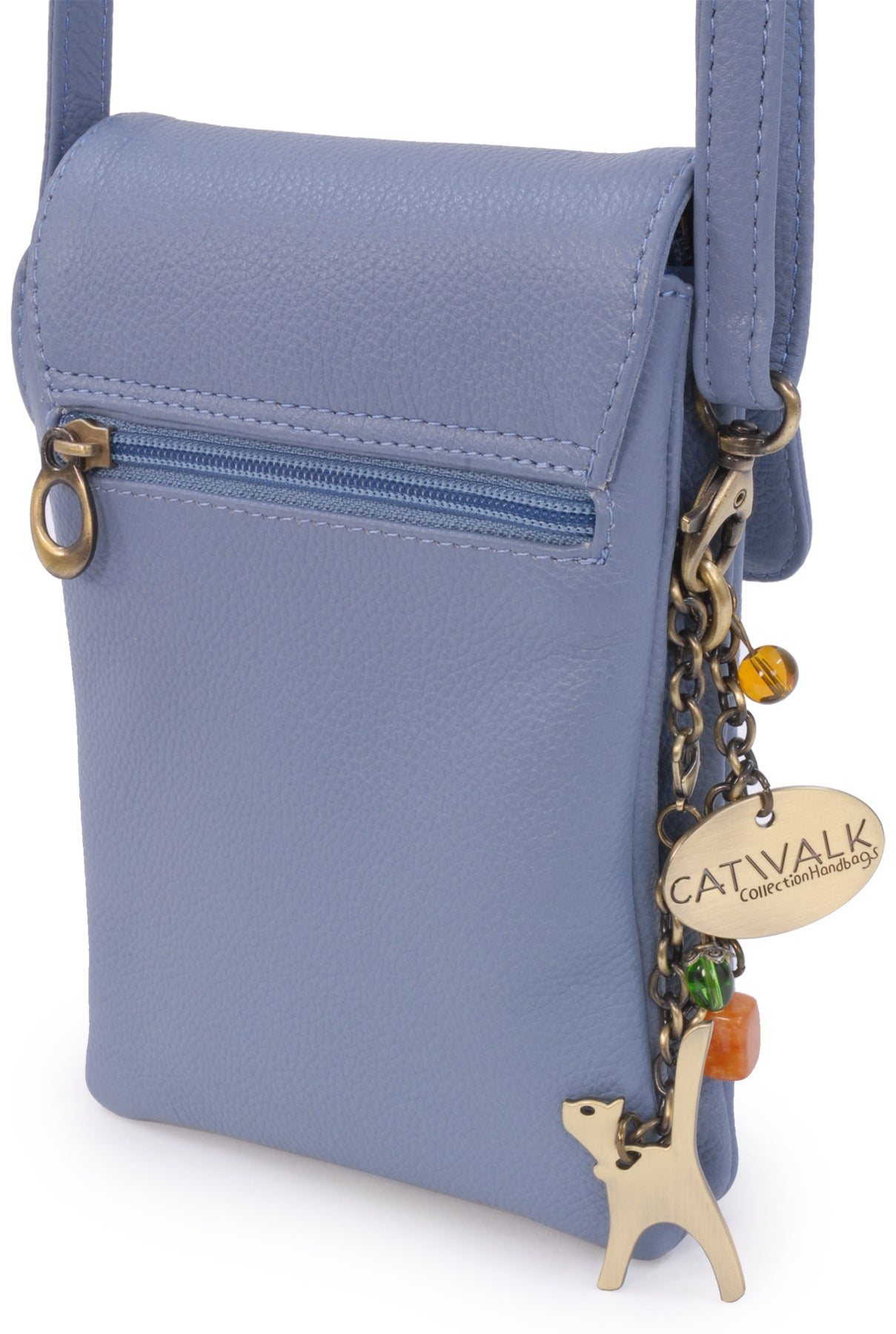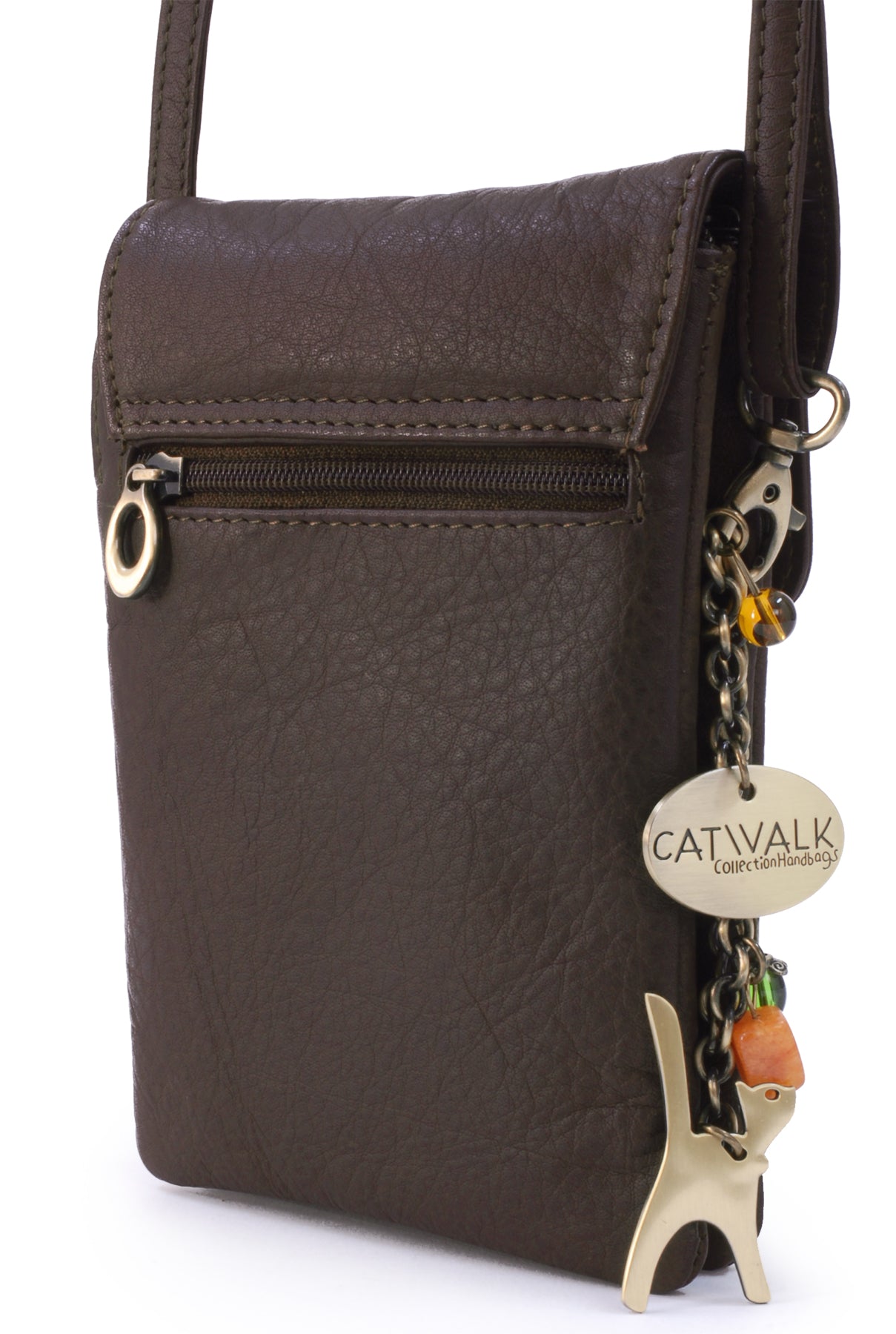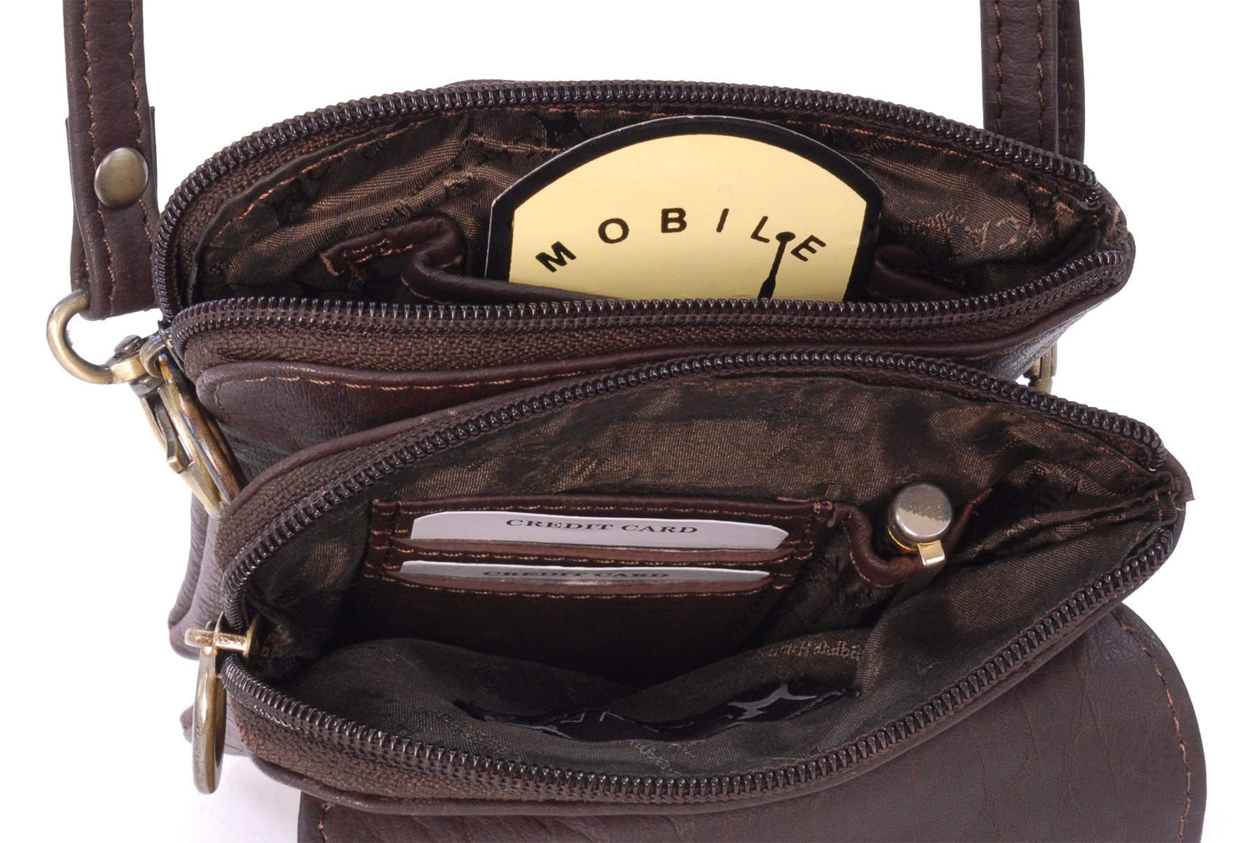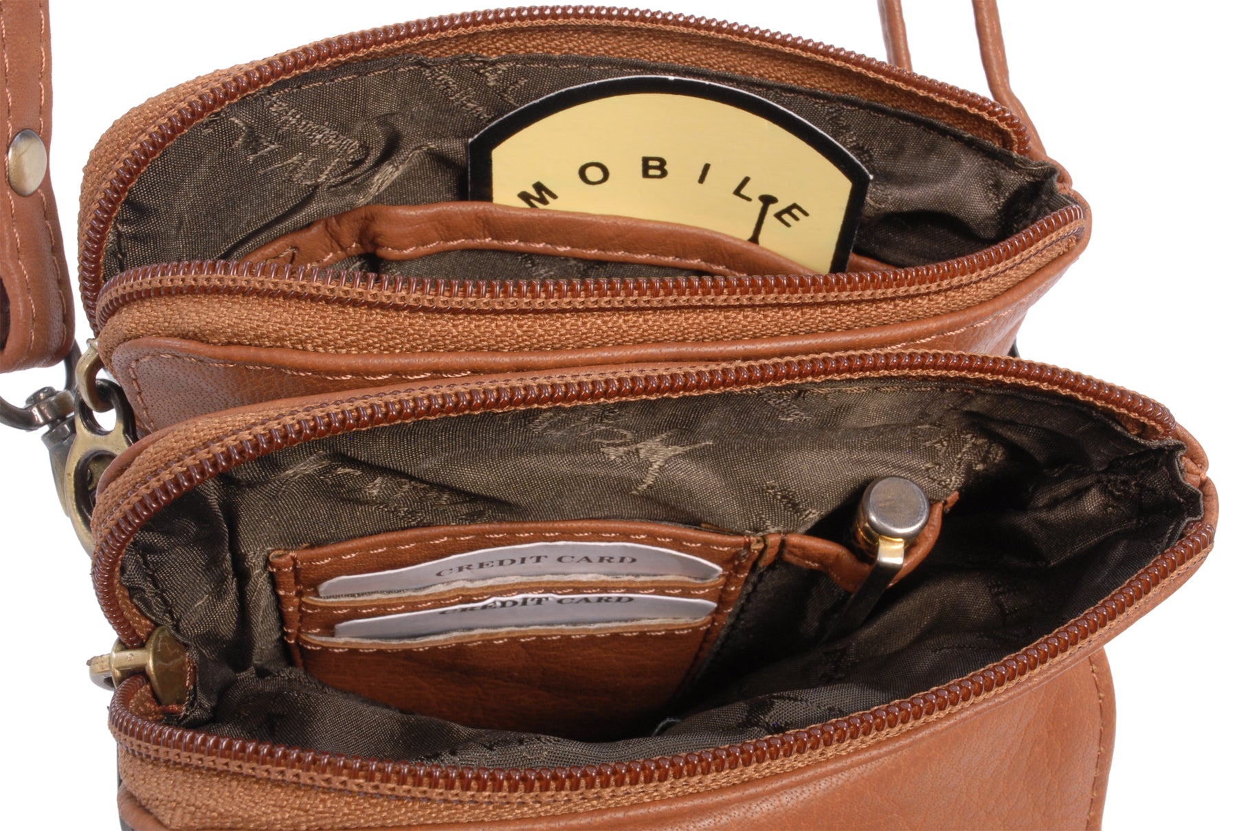 The long detachable, adjustable strap is made from leather; wear either over-the-shoulder or hands-free across-the-body.