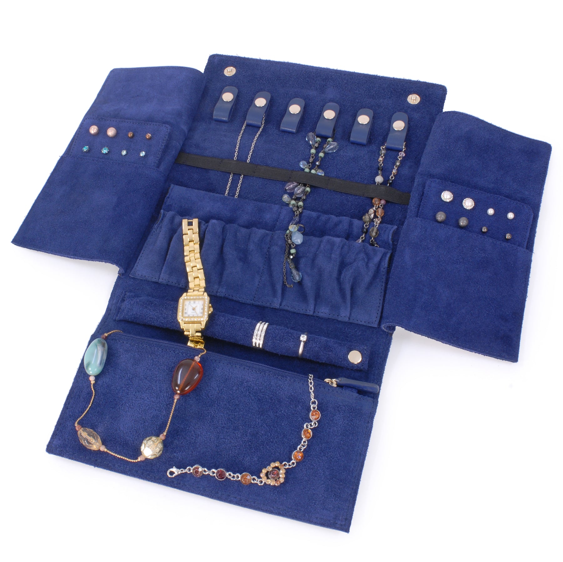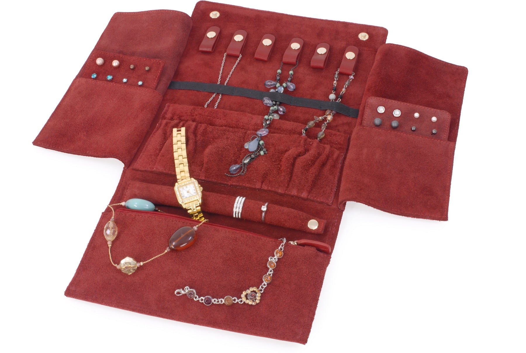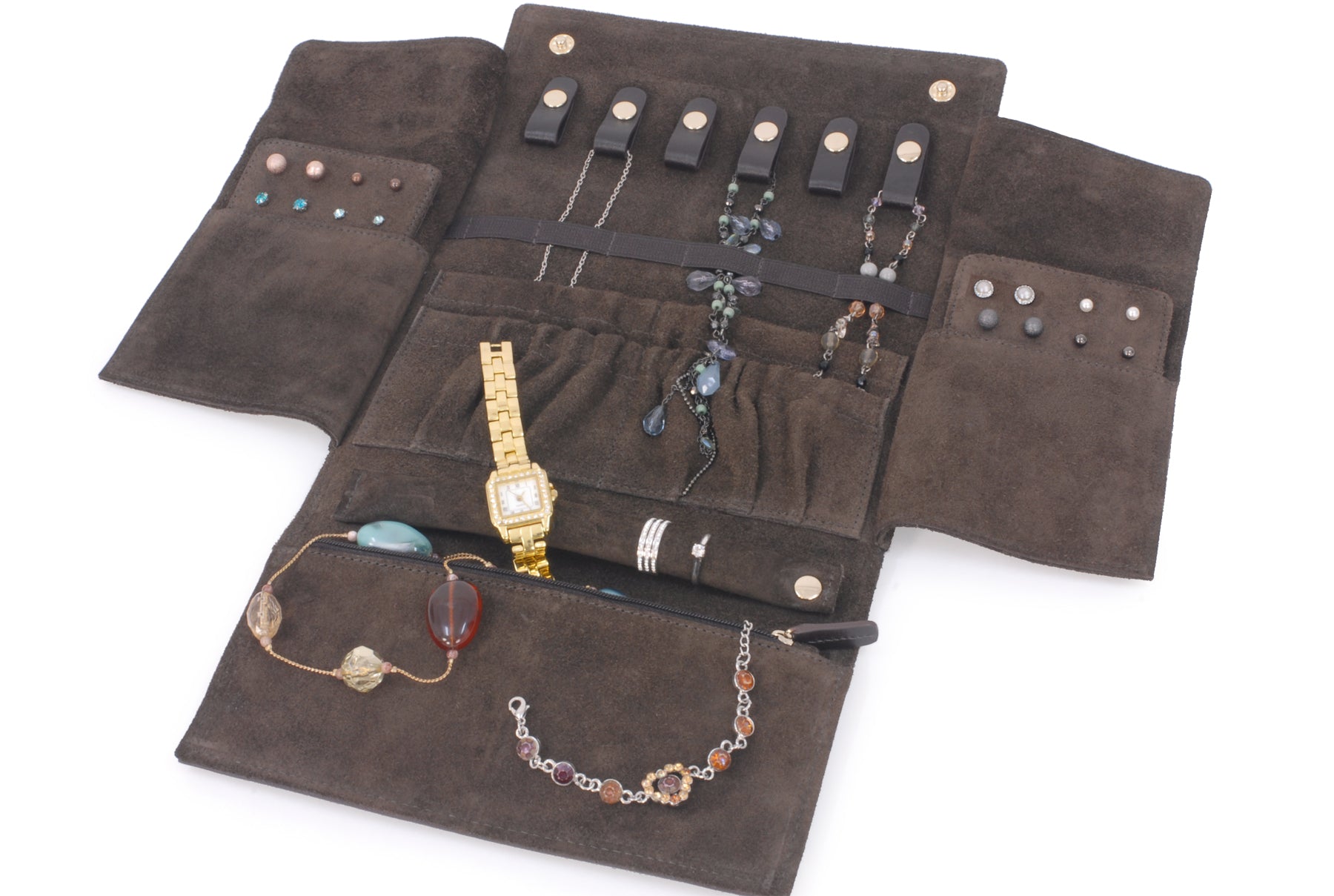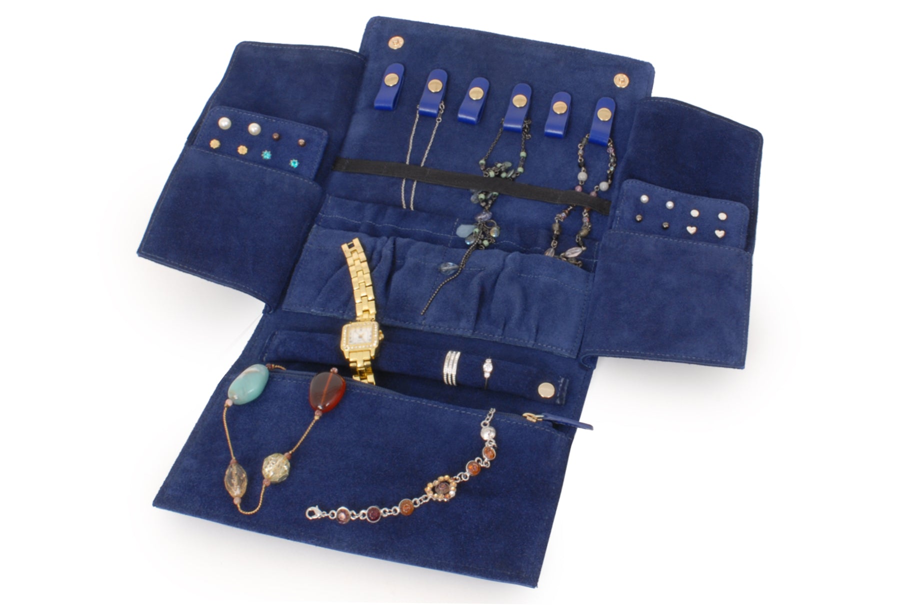 Crafted from a combination of soft suede and smooth leather. The suede has been buffed into a fine nap, while the leather has a satin finish. Designed to neatly and securely store necklaces, pendants, bracelets, rings, earrings, watches, and brooches.