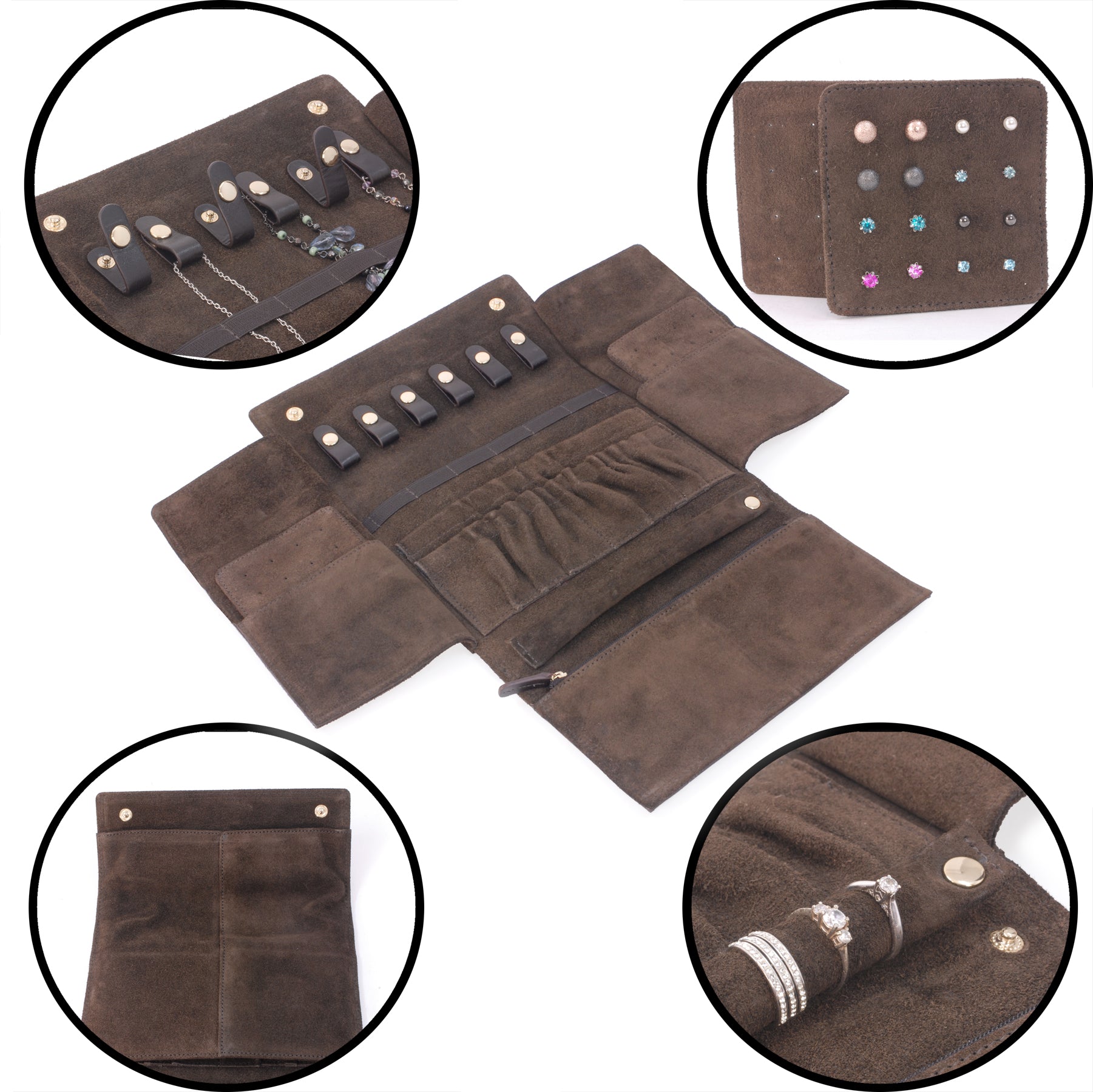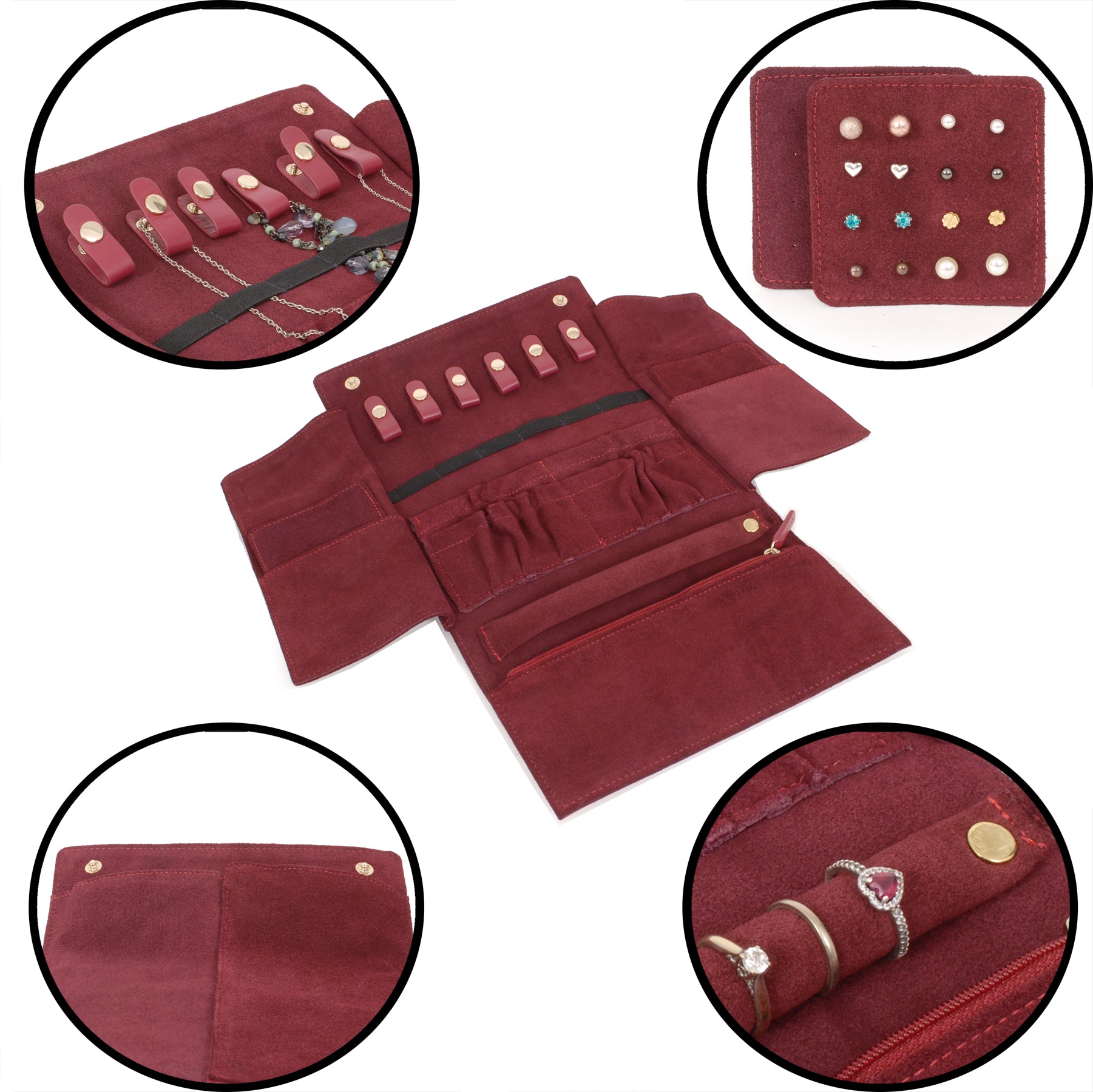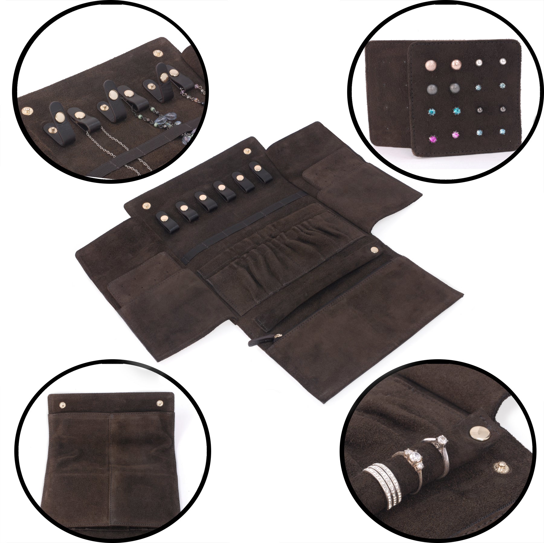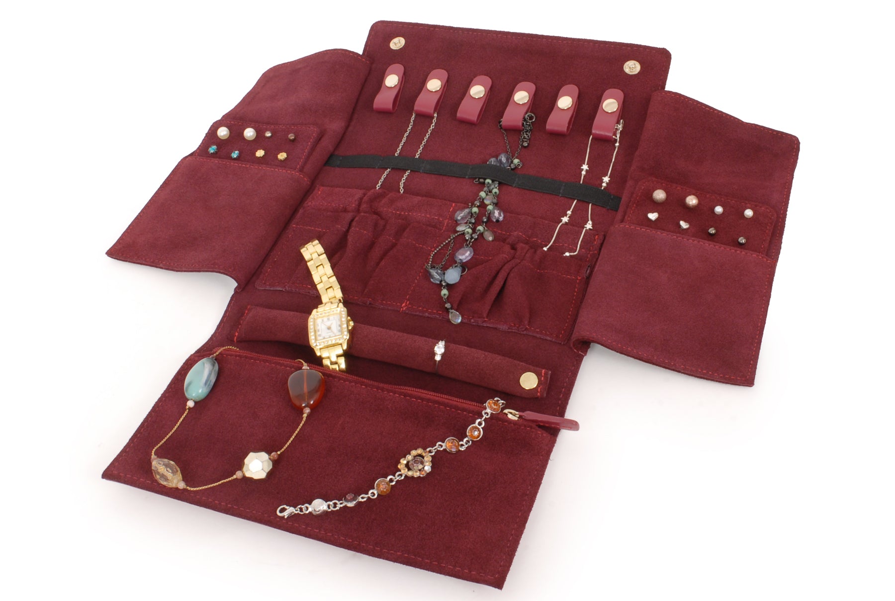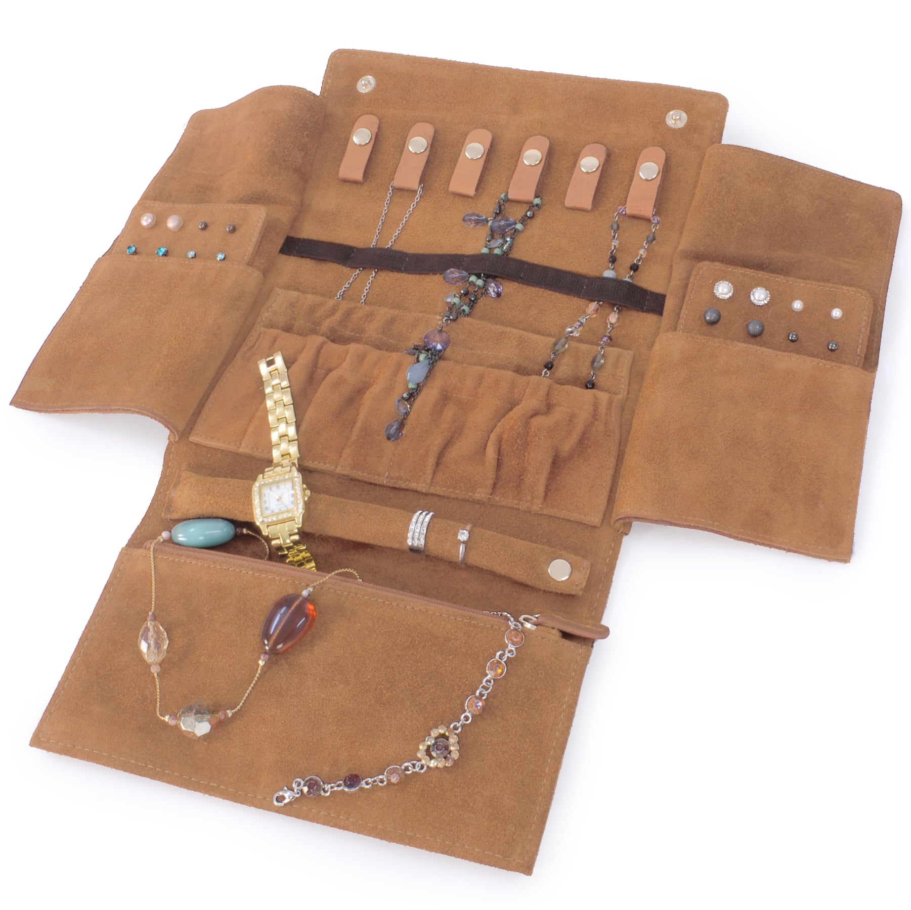 Crafted from a combination of soft suede and smooth leather. The suede has been buffed into a fine nap, while the leather has a satin finish. Designed to neatly and securely store necklaces, pendants, bracelets, rings, earrings, watches, and brooches.