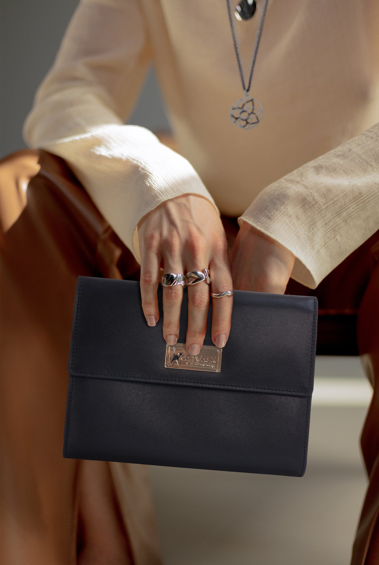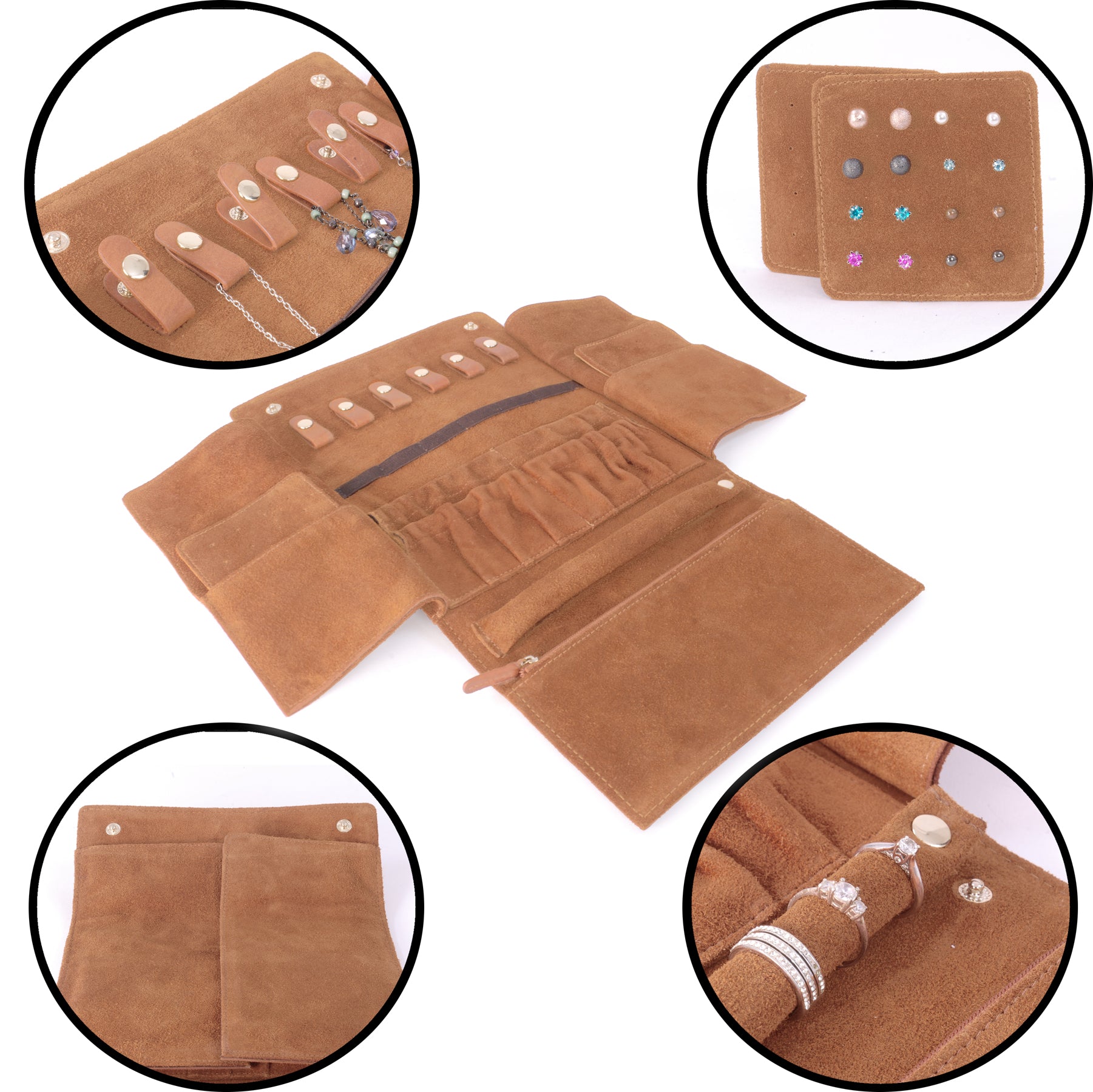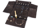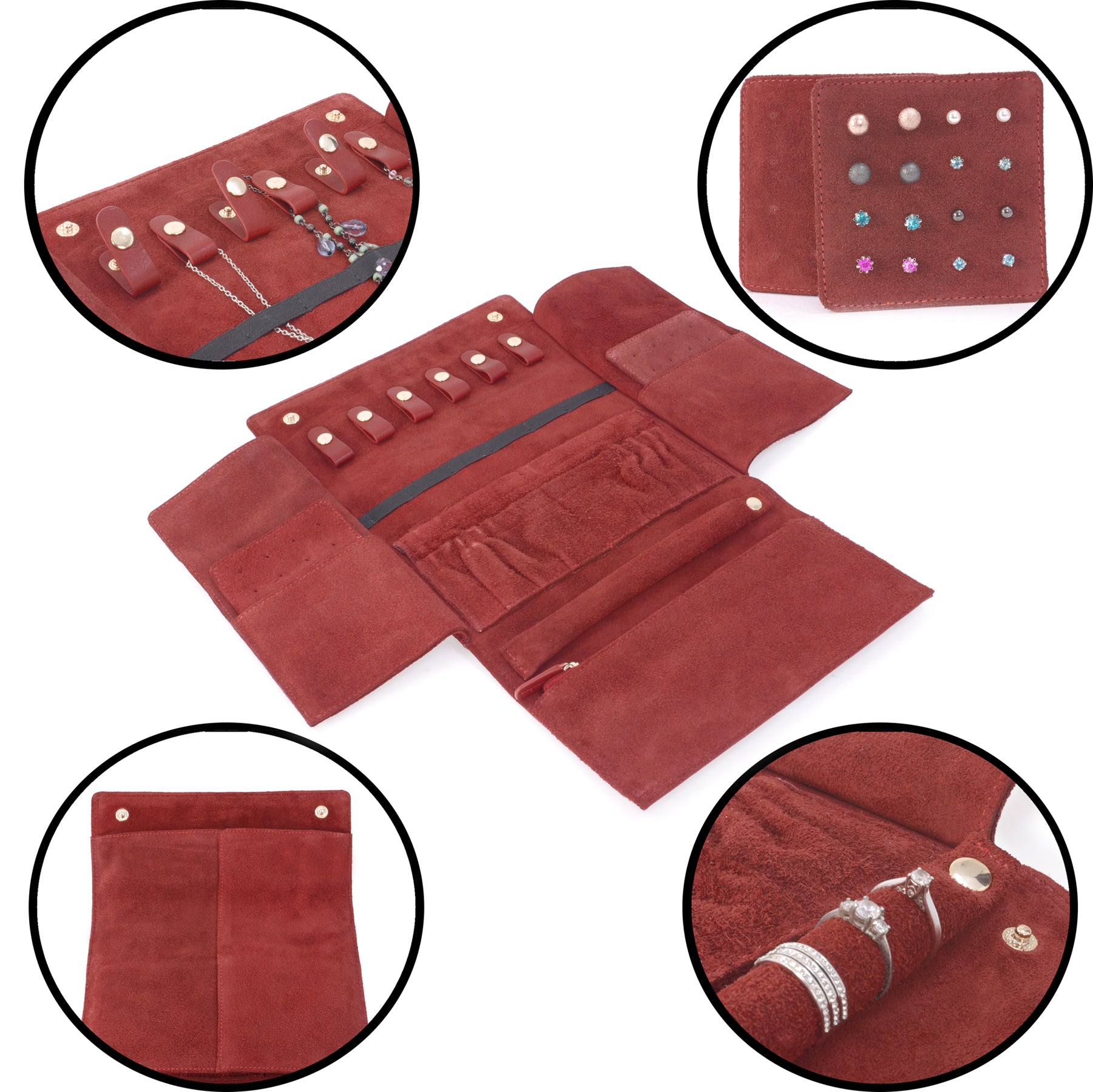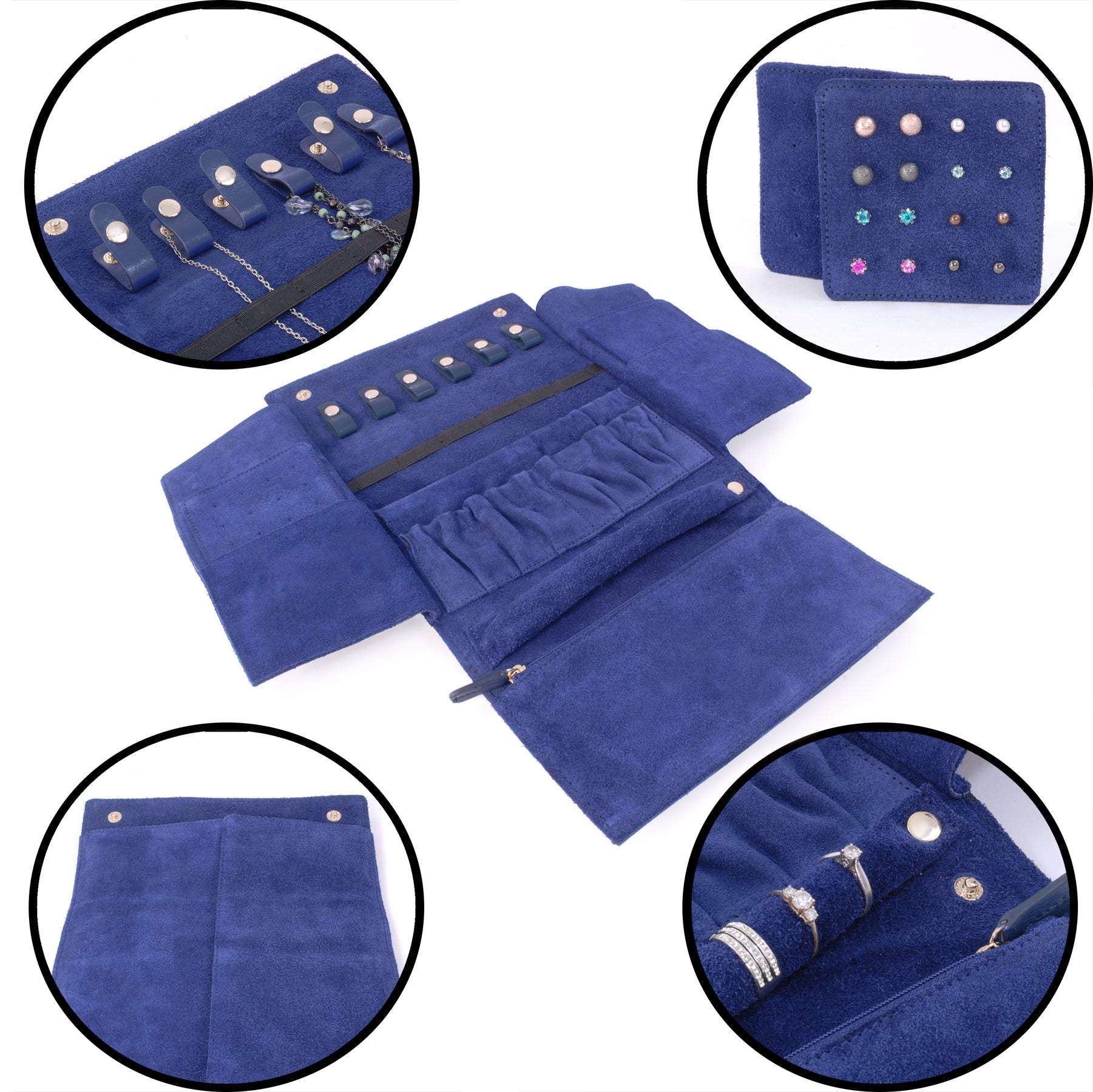 Crafted from a combination of soft suede and smooth leather. The suede has been buffed into a fine nap, while the leather has a satin finish. Designed to neatly and securely store necklaces, pendants, bracelets, rings, earrings, watches, and brooches.