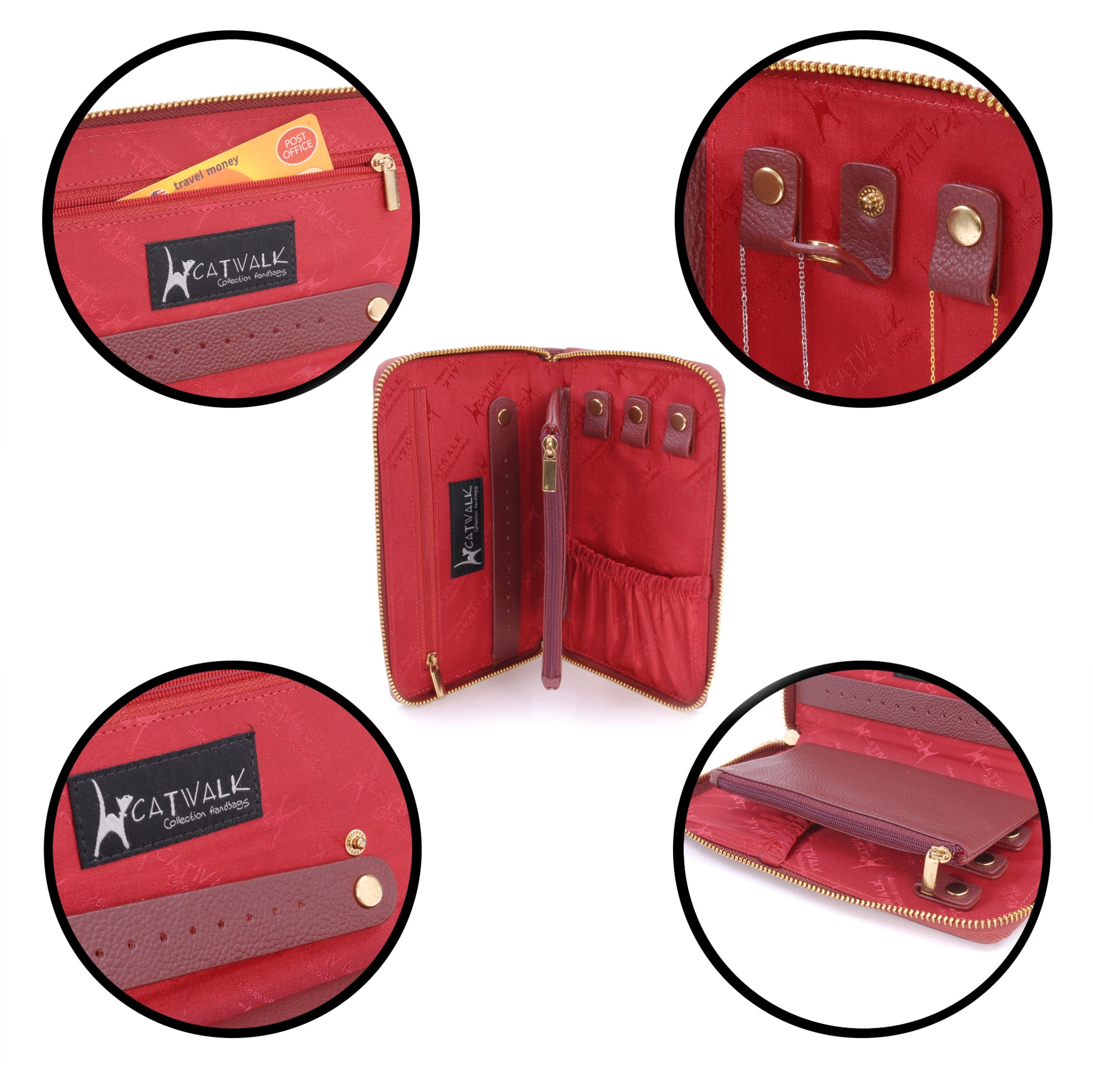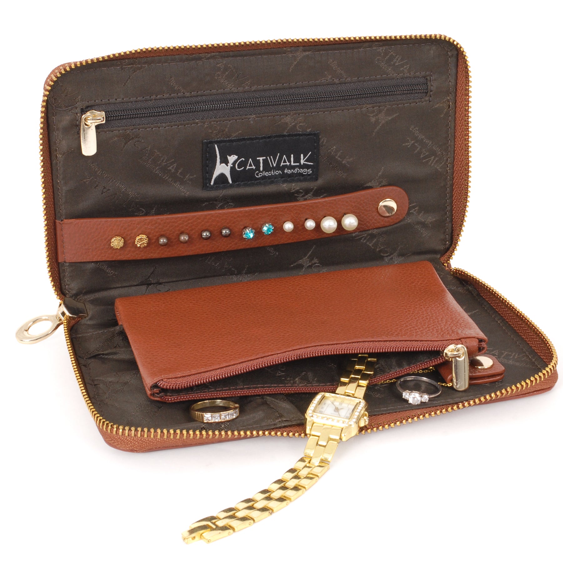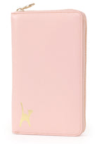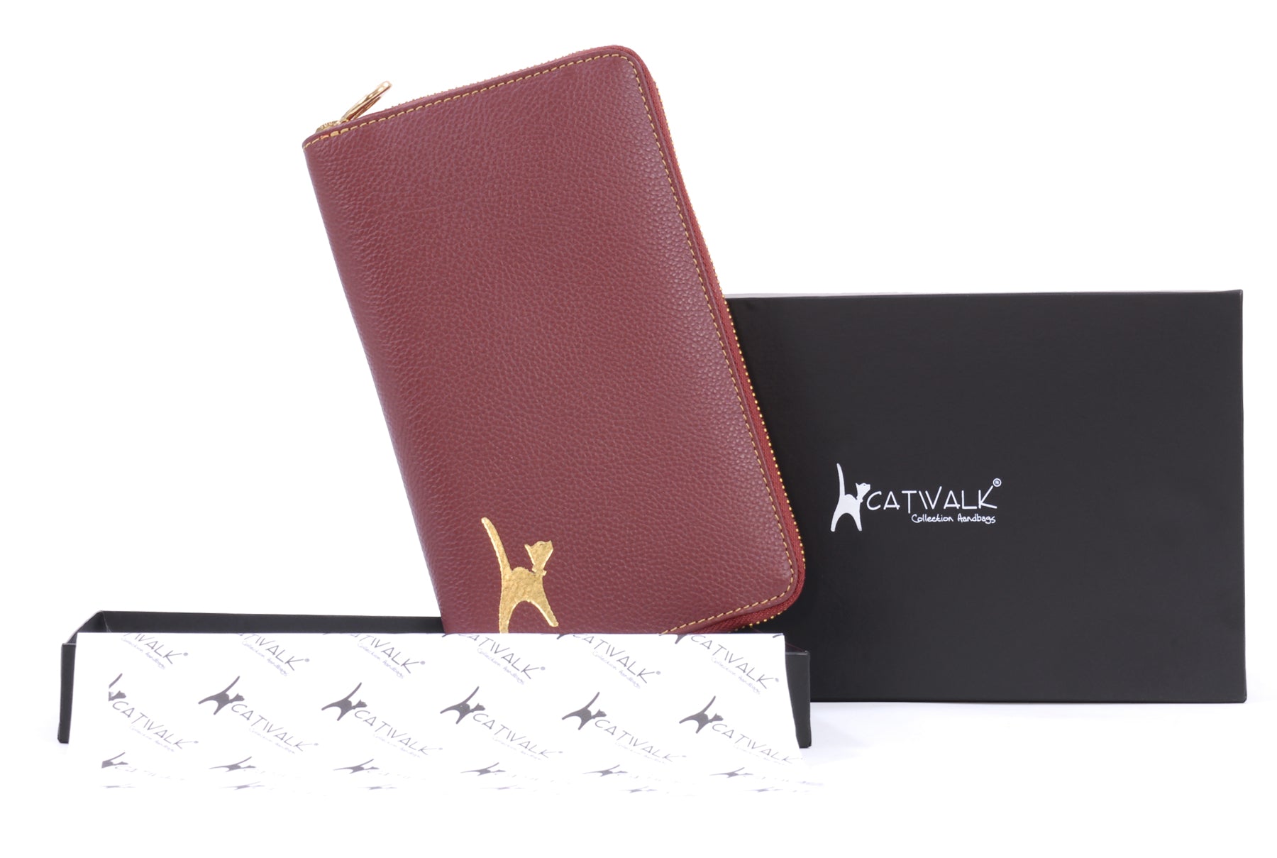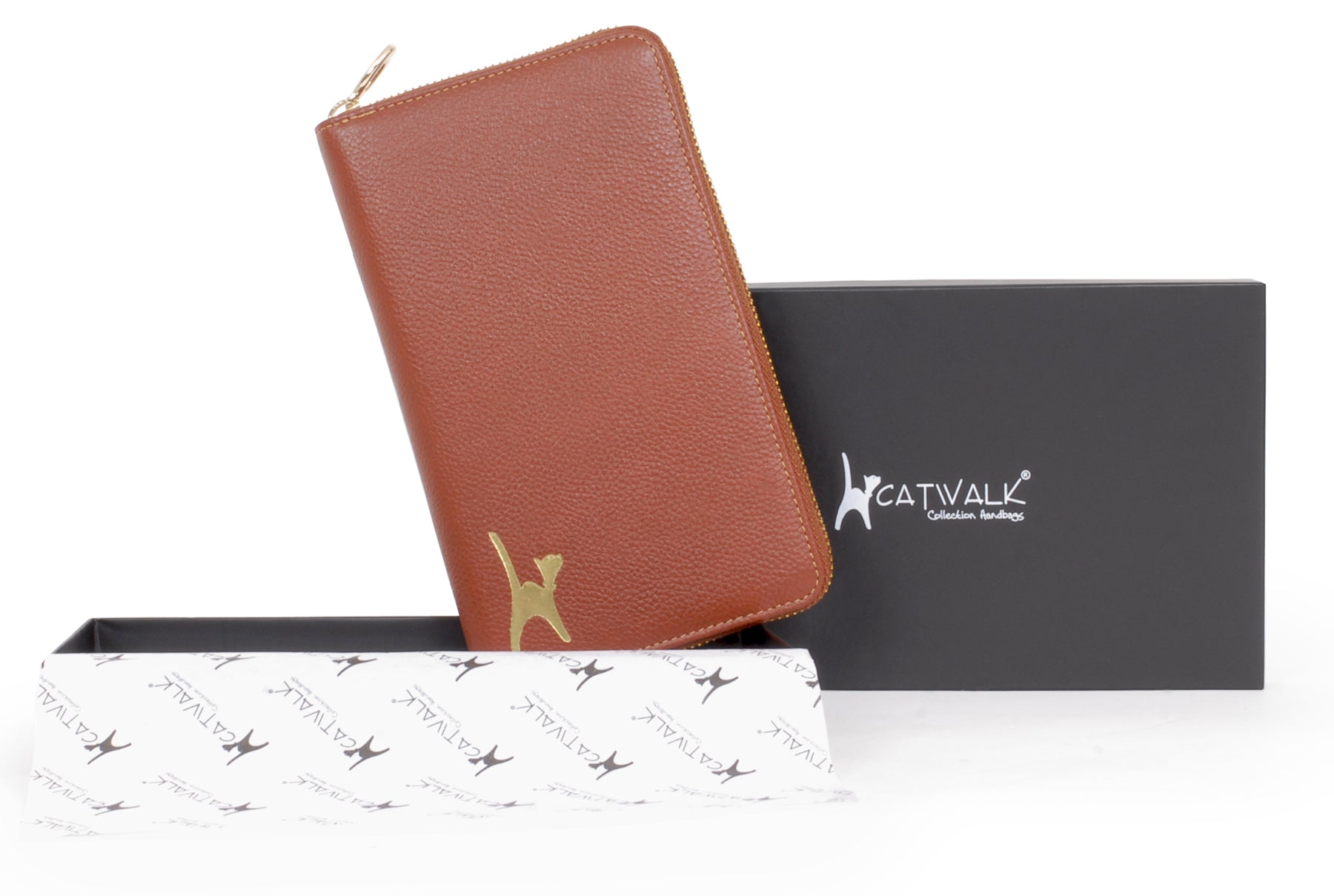 The metal zip closure ensures contents stay safe and secure. Contrast stitching highlights the fine features of the case. The front panel is imprinted with the signature cat logo.