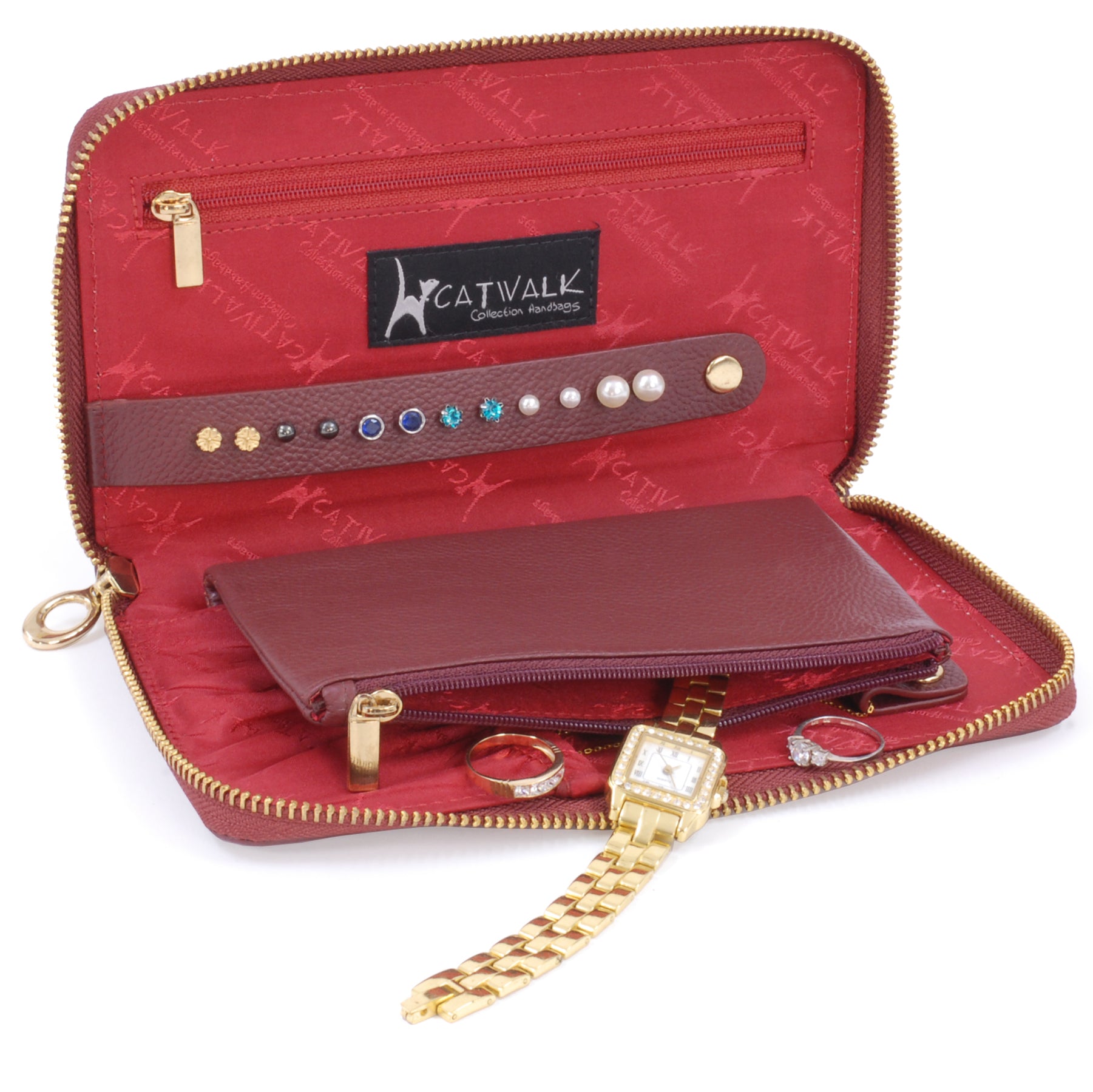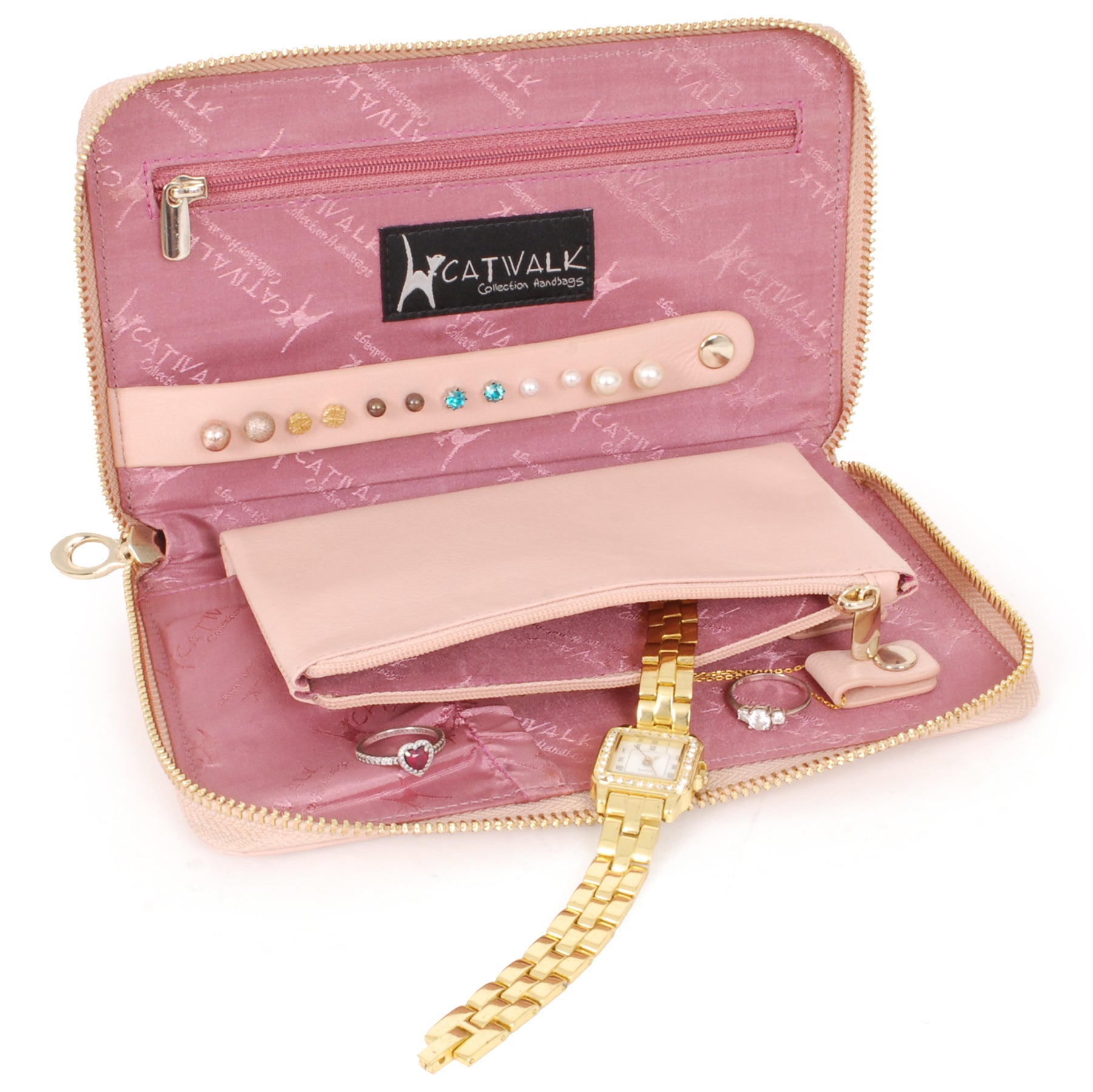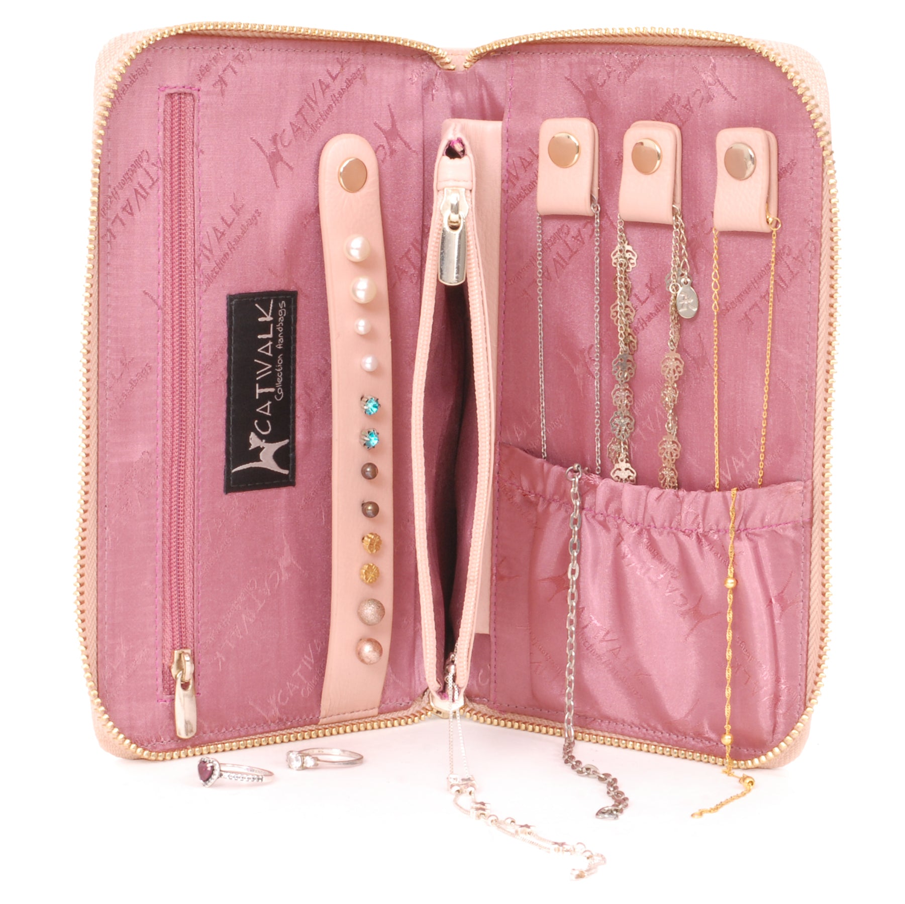 Ideal for storing necklaces, pendants, bracelets, rings, earrings, watches and brooches. Inside, there is an earring holder for 6 pairs of earrings, 3 necklace holders with an elasticated pocket below to help keep chains in place, and two zipped compartments for other jewellery items.