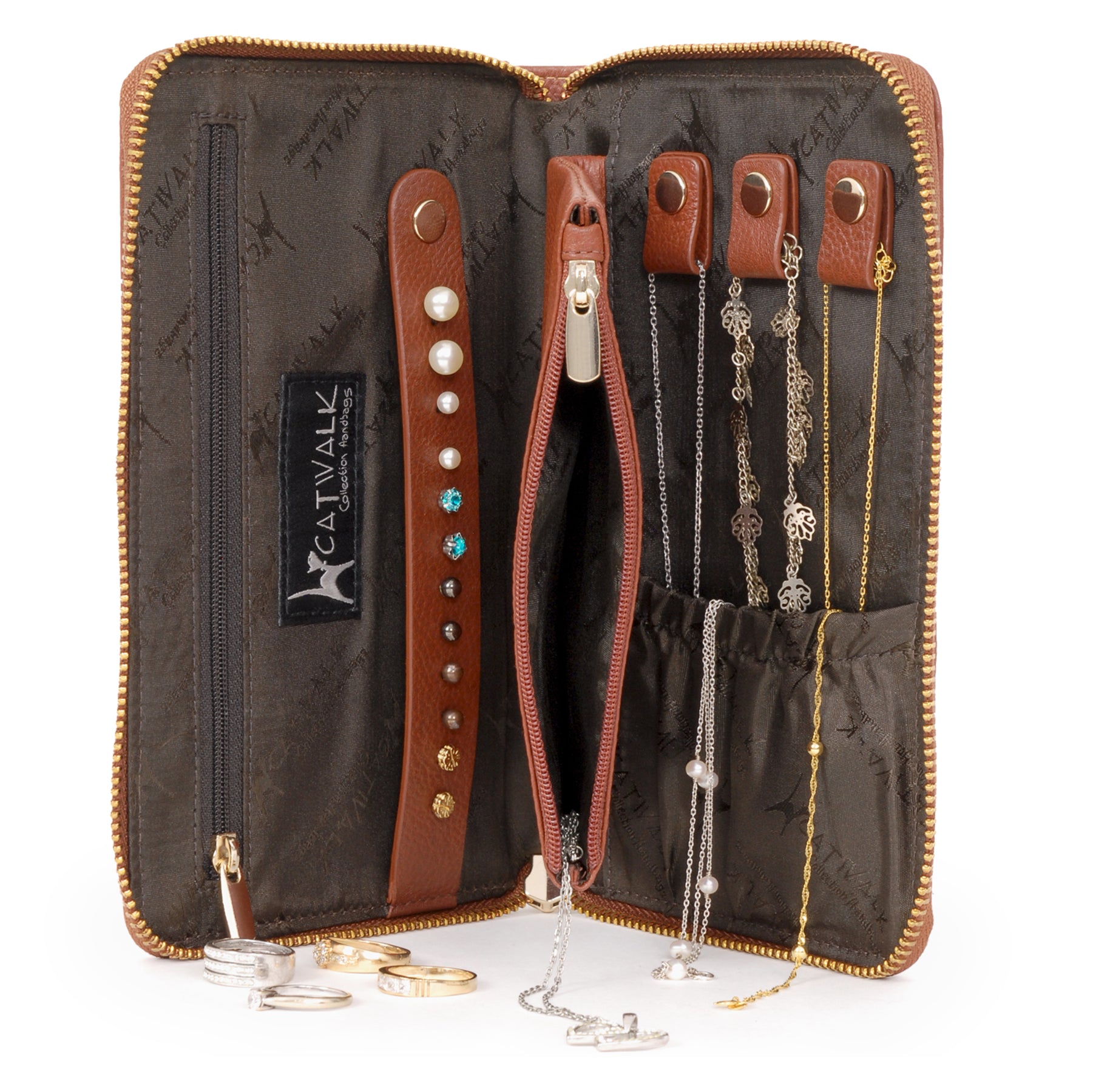 Pockets: 3 Tabs and Pockets for Necklaces/Chains + 1 Long Holder for up to 6 Pairs of Earrings/Studs + 2 Zipped Pockets for Watches / Bracelets / Rings
