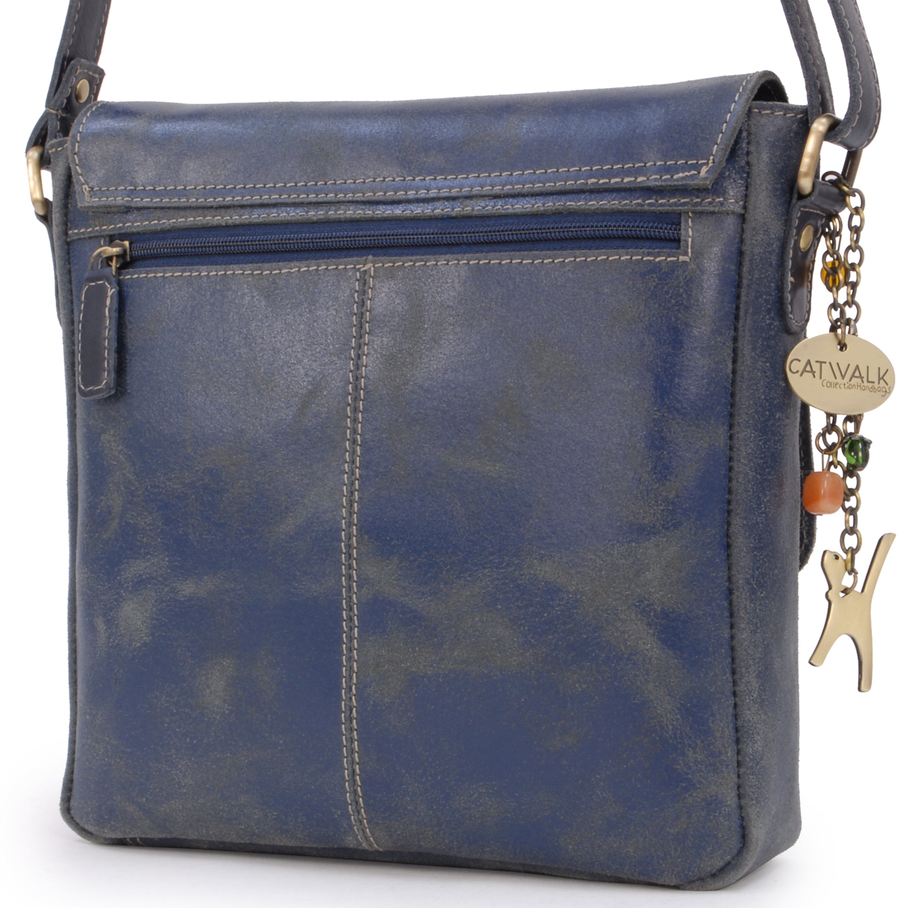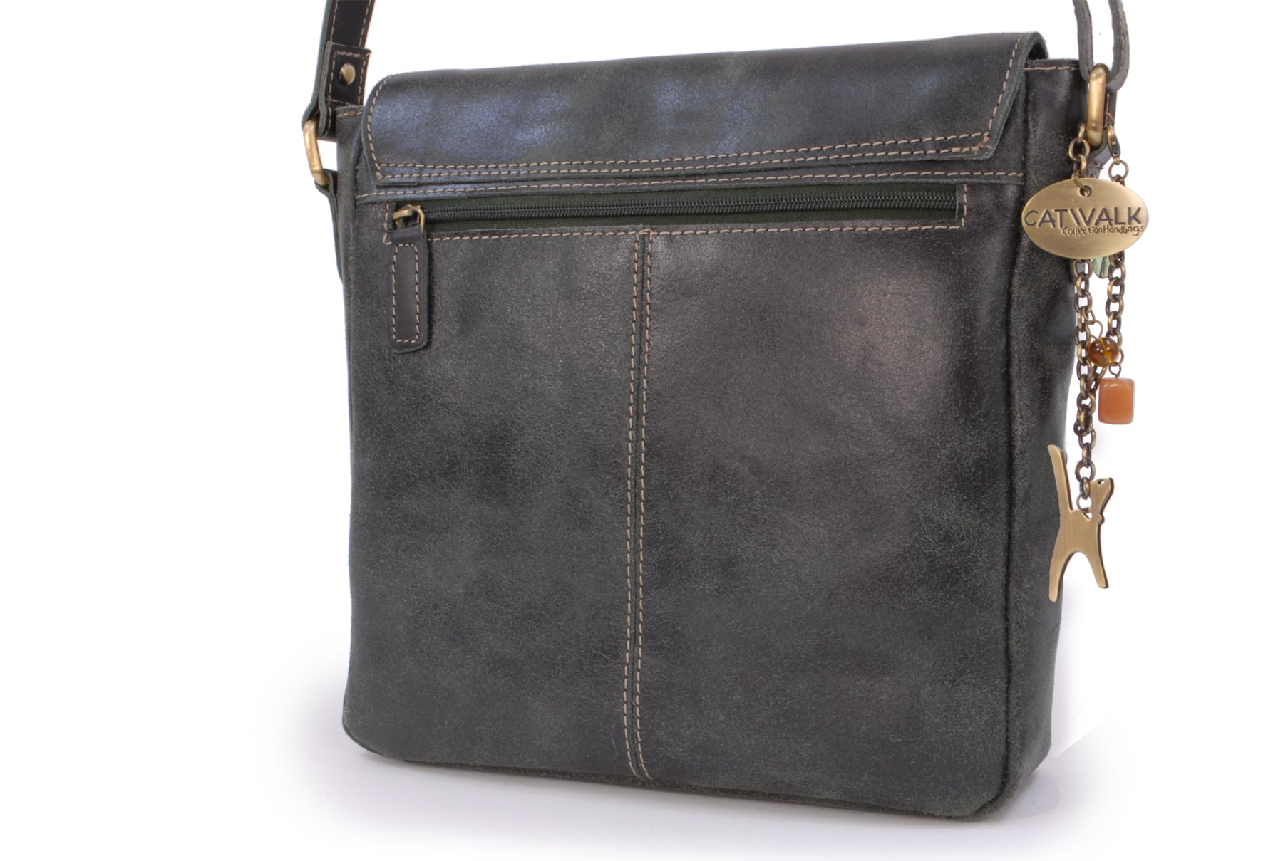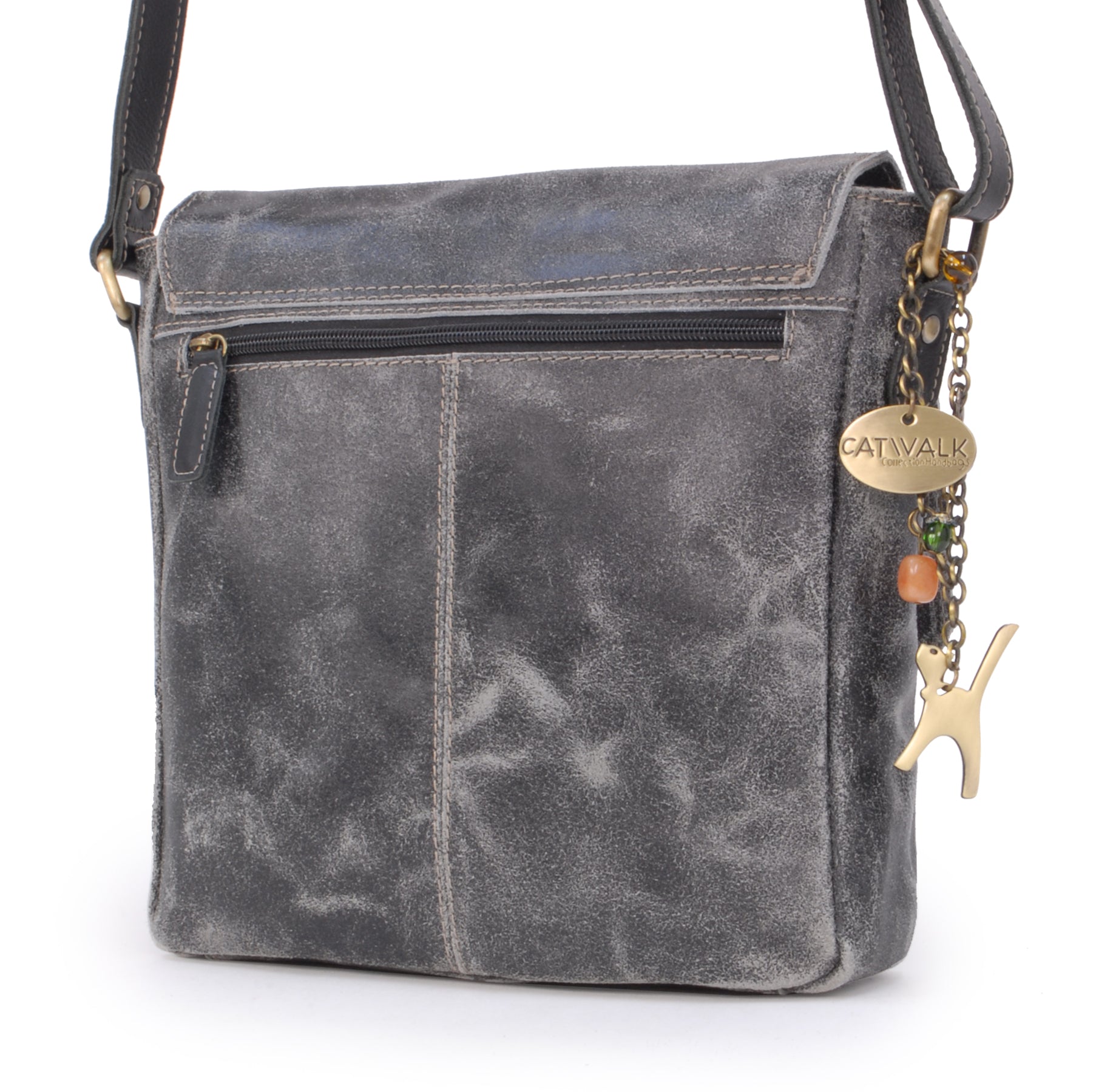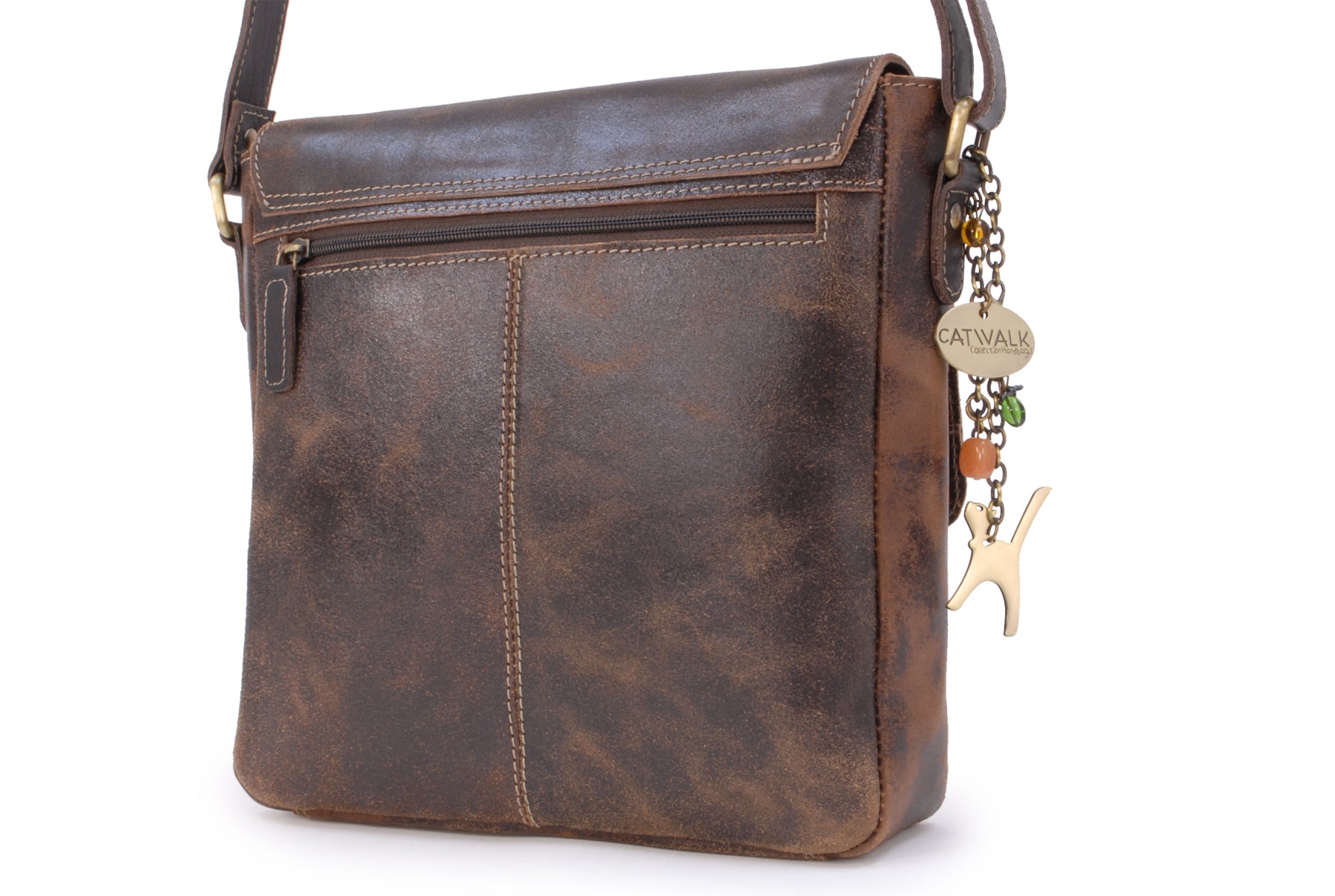 The long adjustable strap is made from leather; wear over the shoulder or hands free across the body.