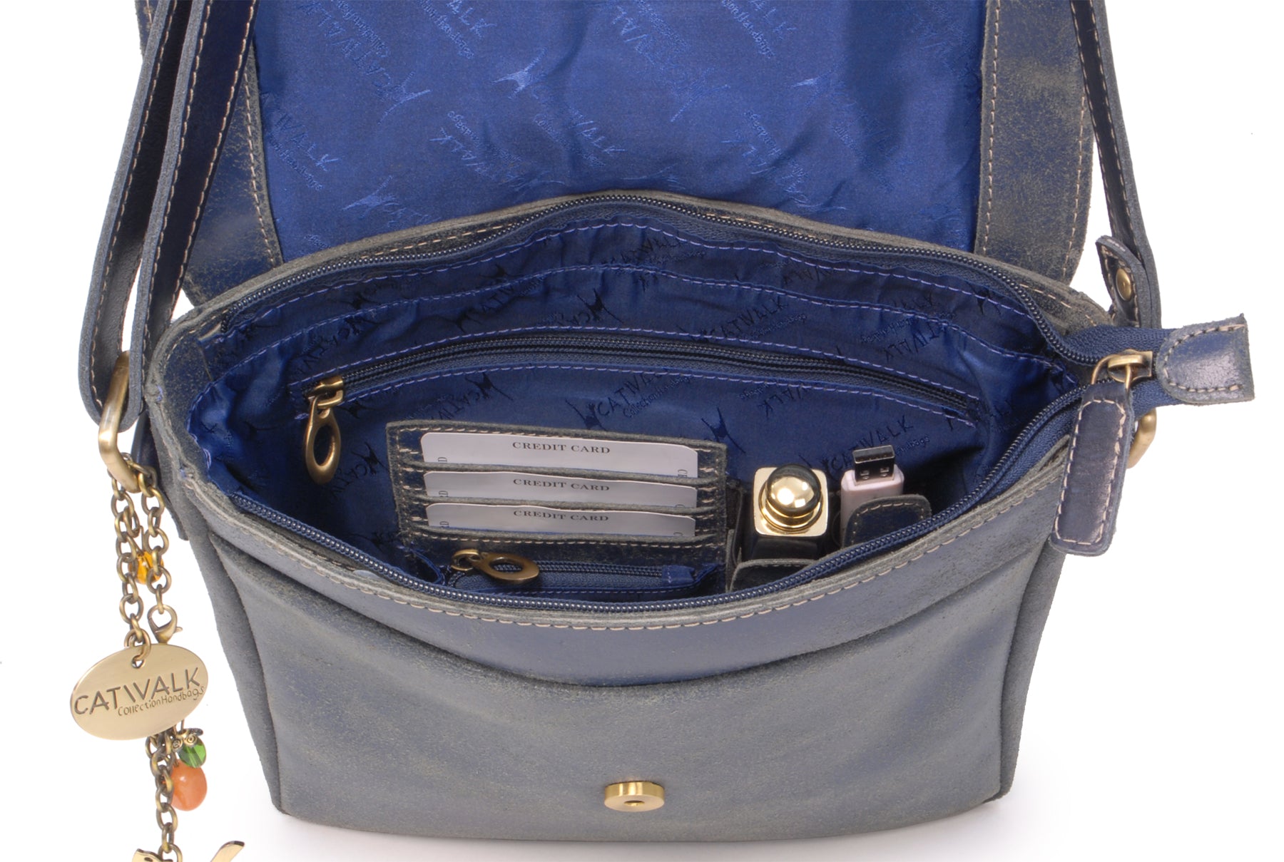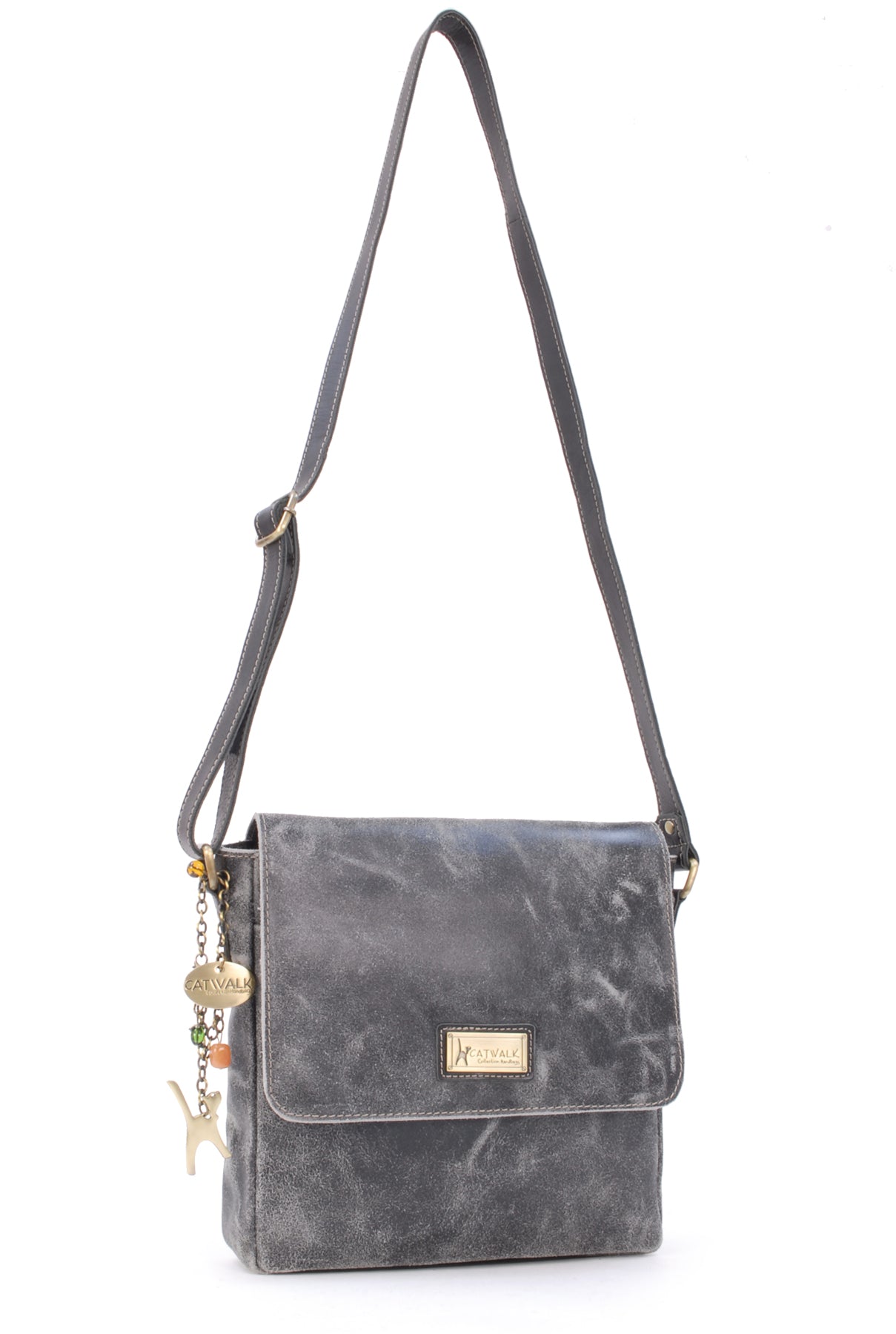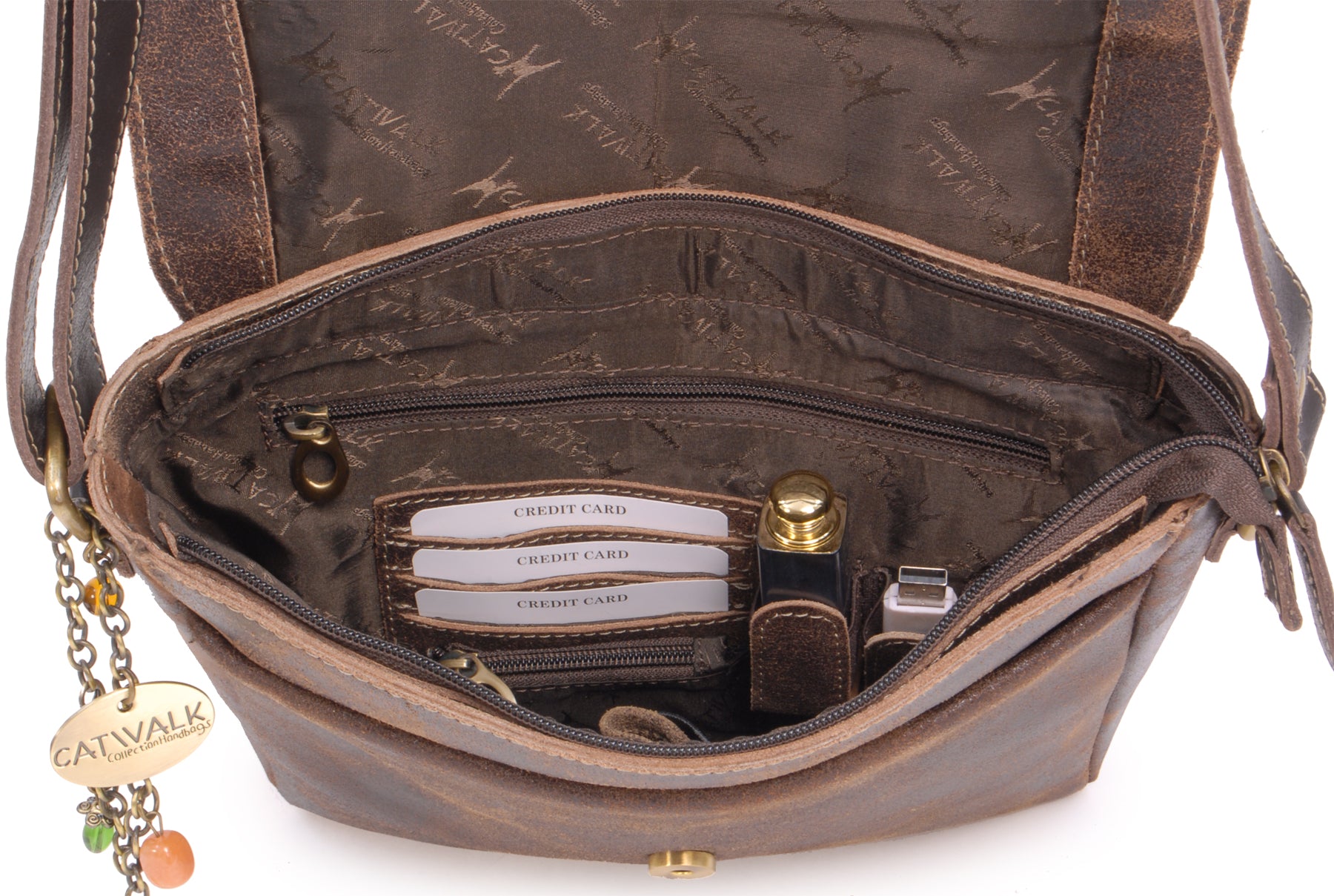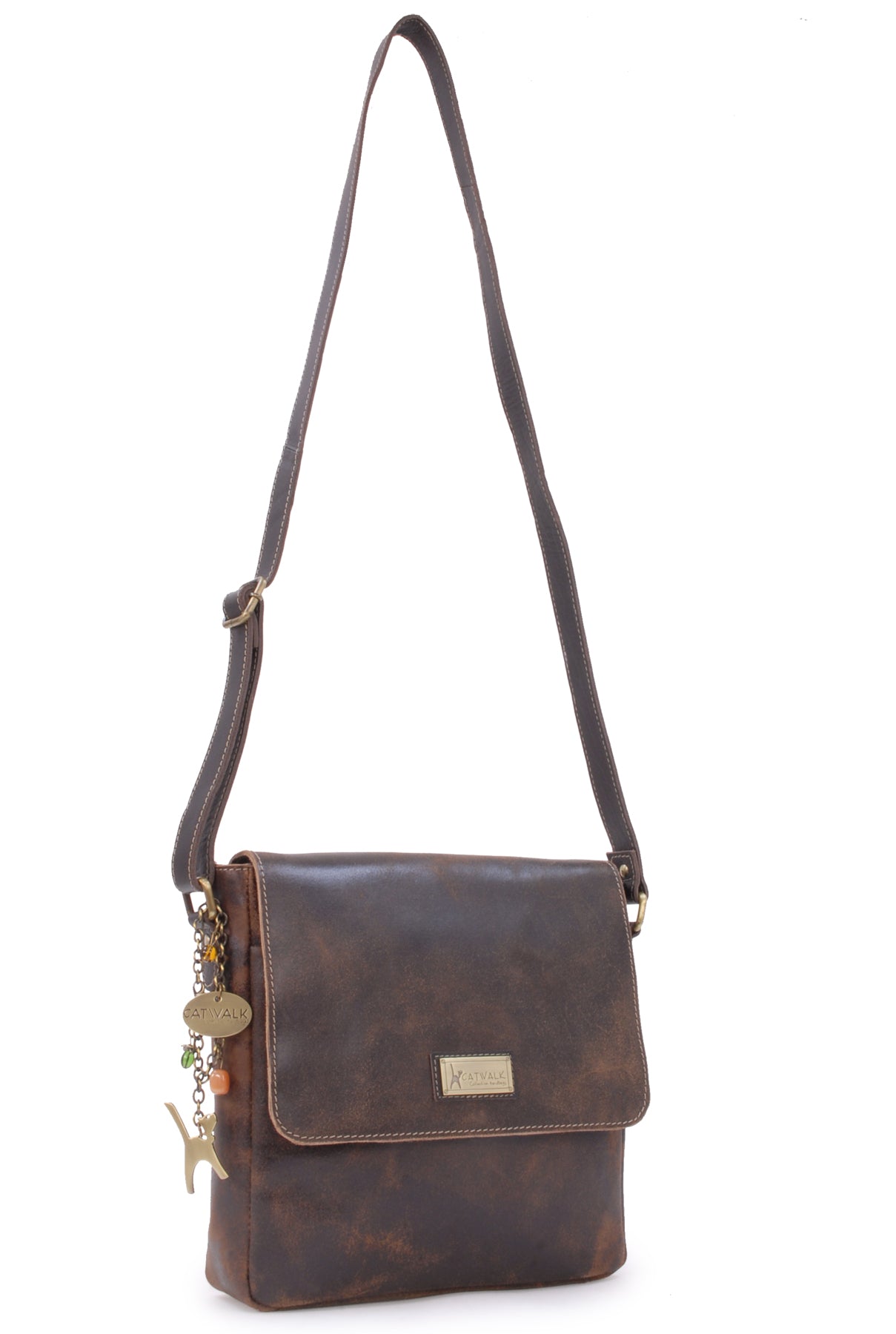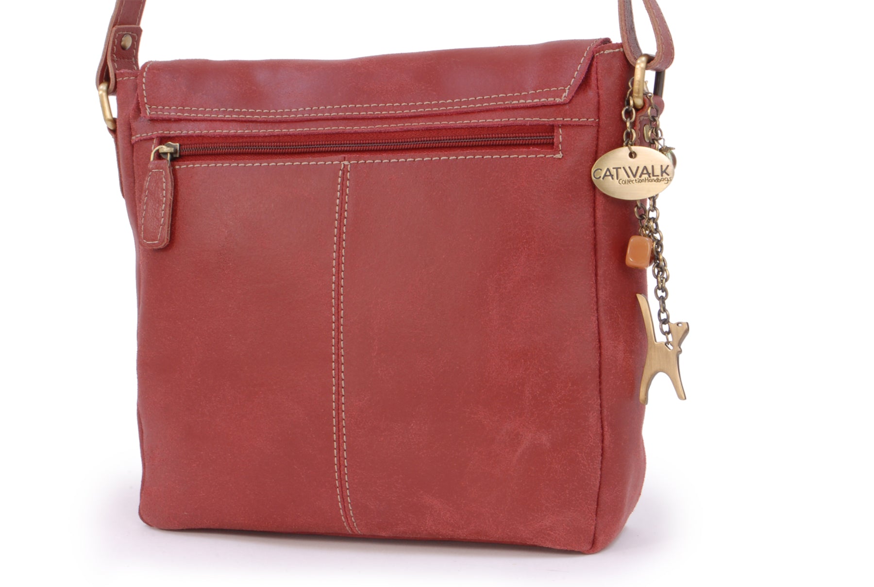 The long adjustable strap is made from leather; wear over the shoulder or hands free across the body.