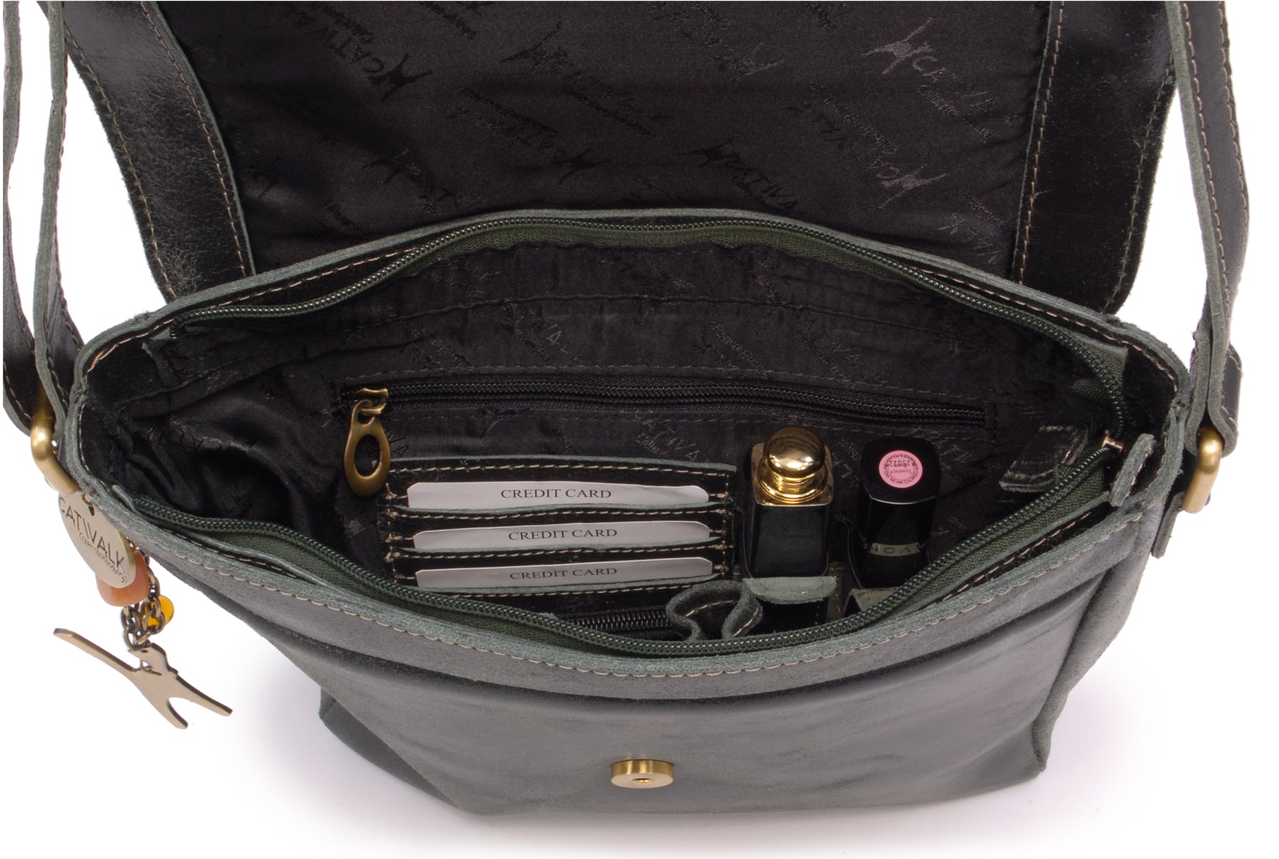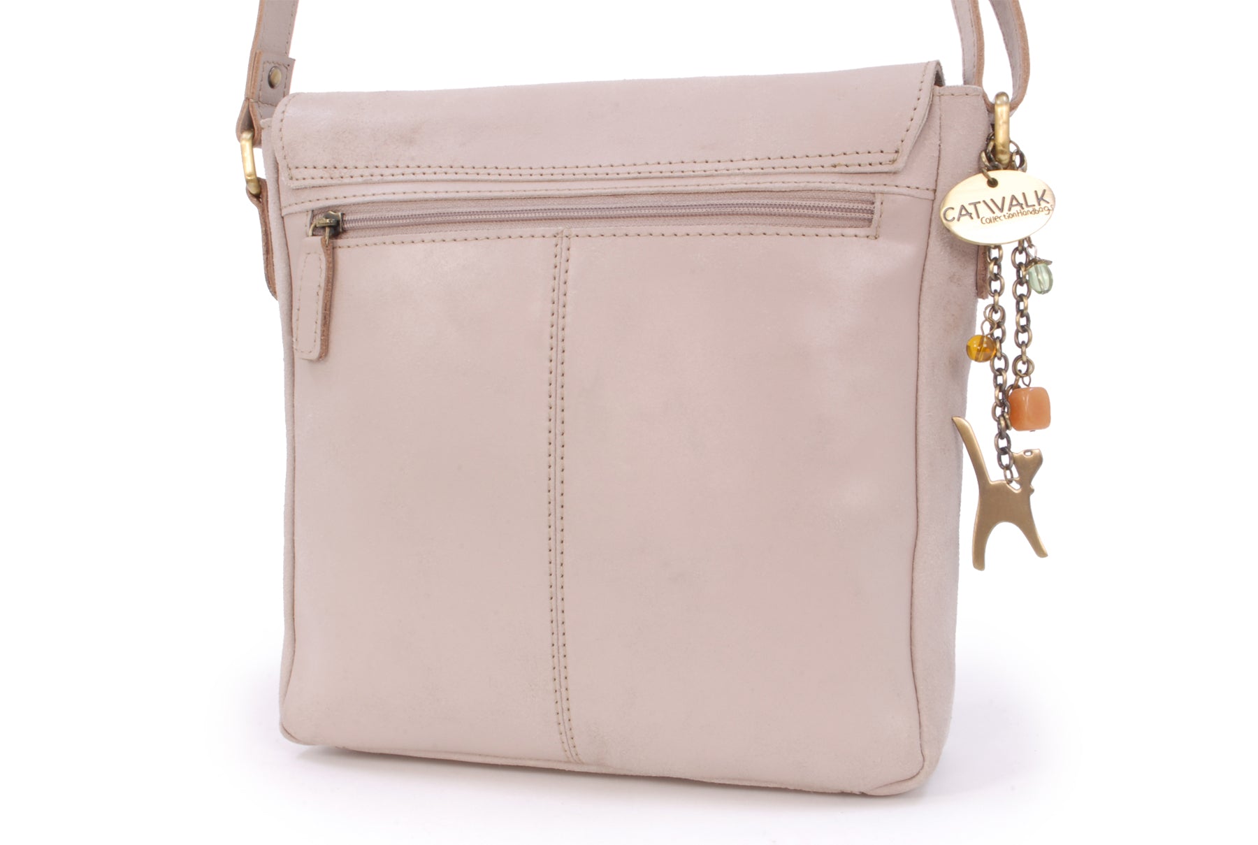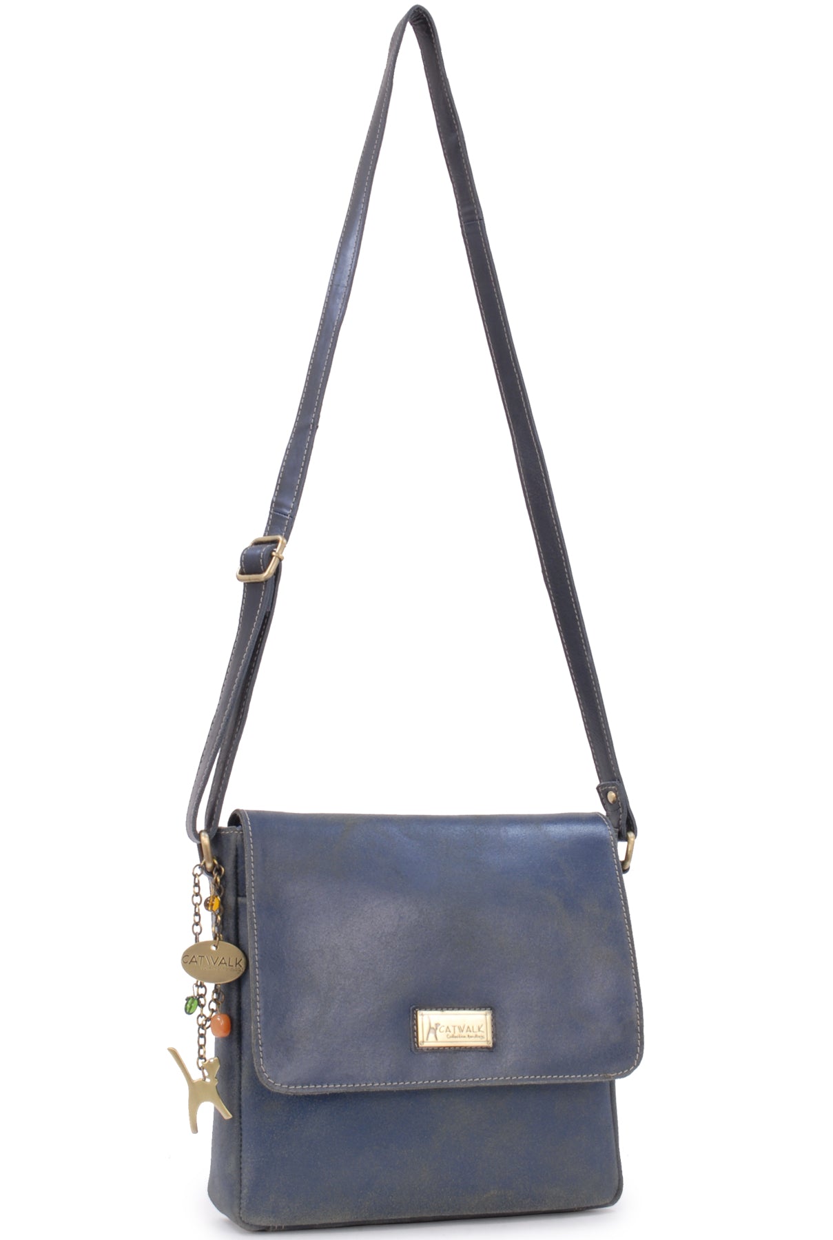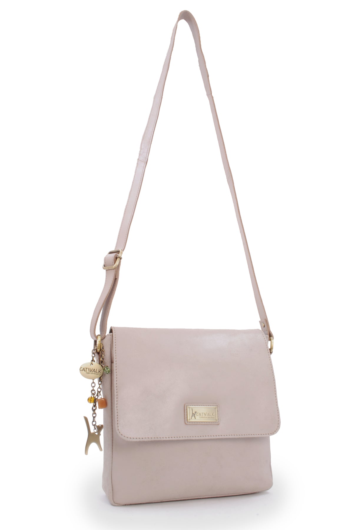 The long adjustable strap is made from leather; wear over the shoulder or hands free across the body.
