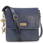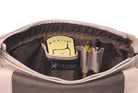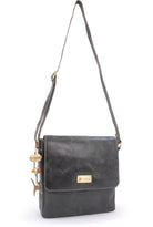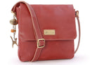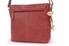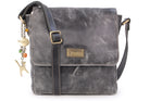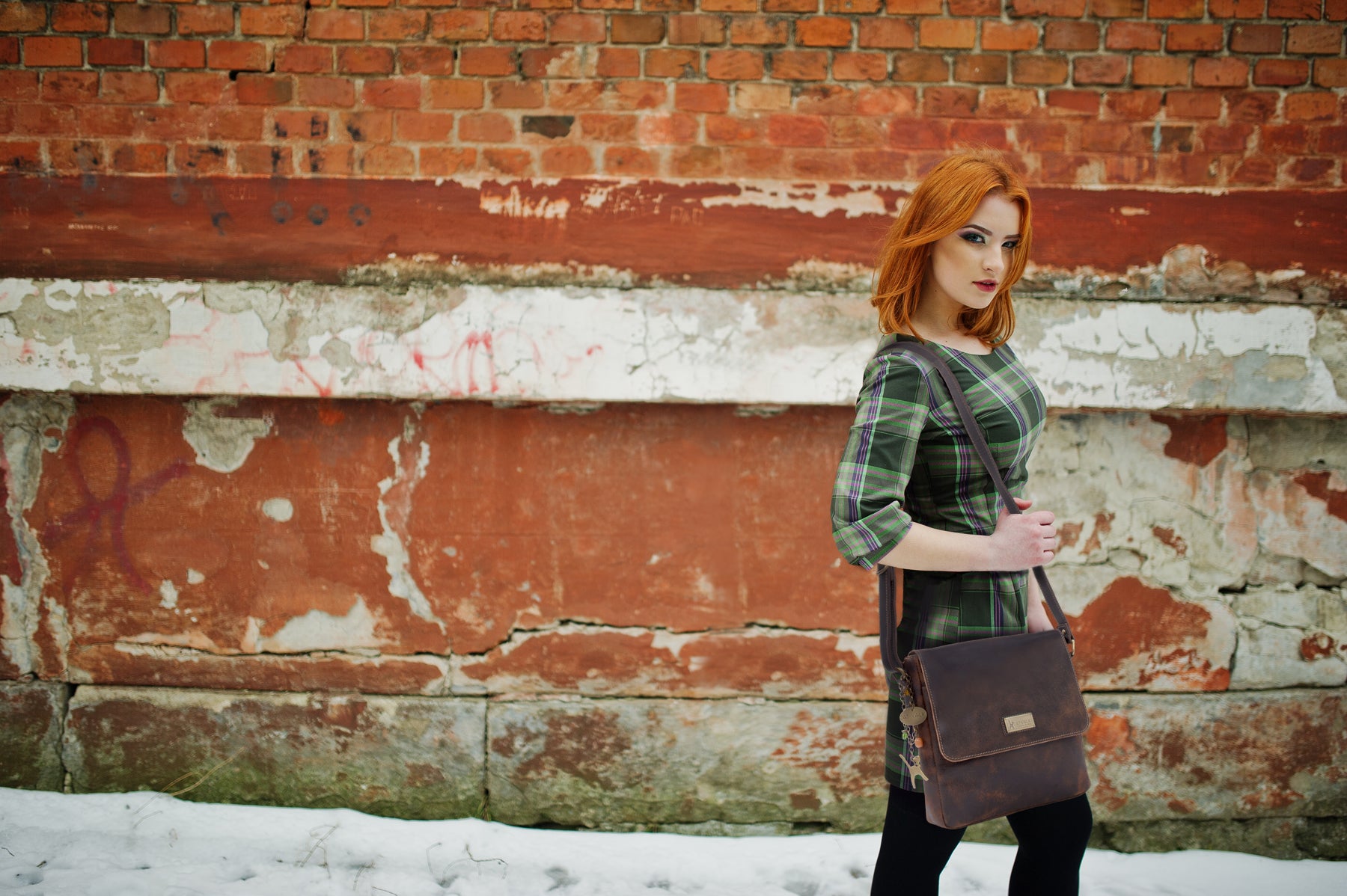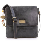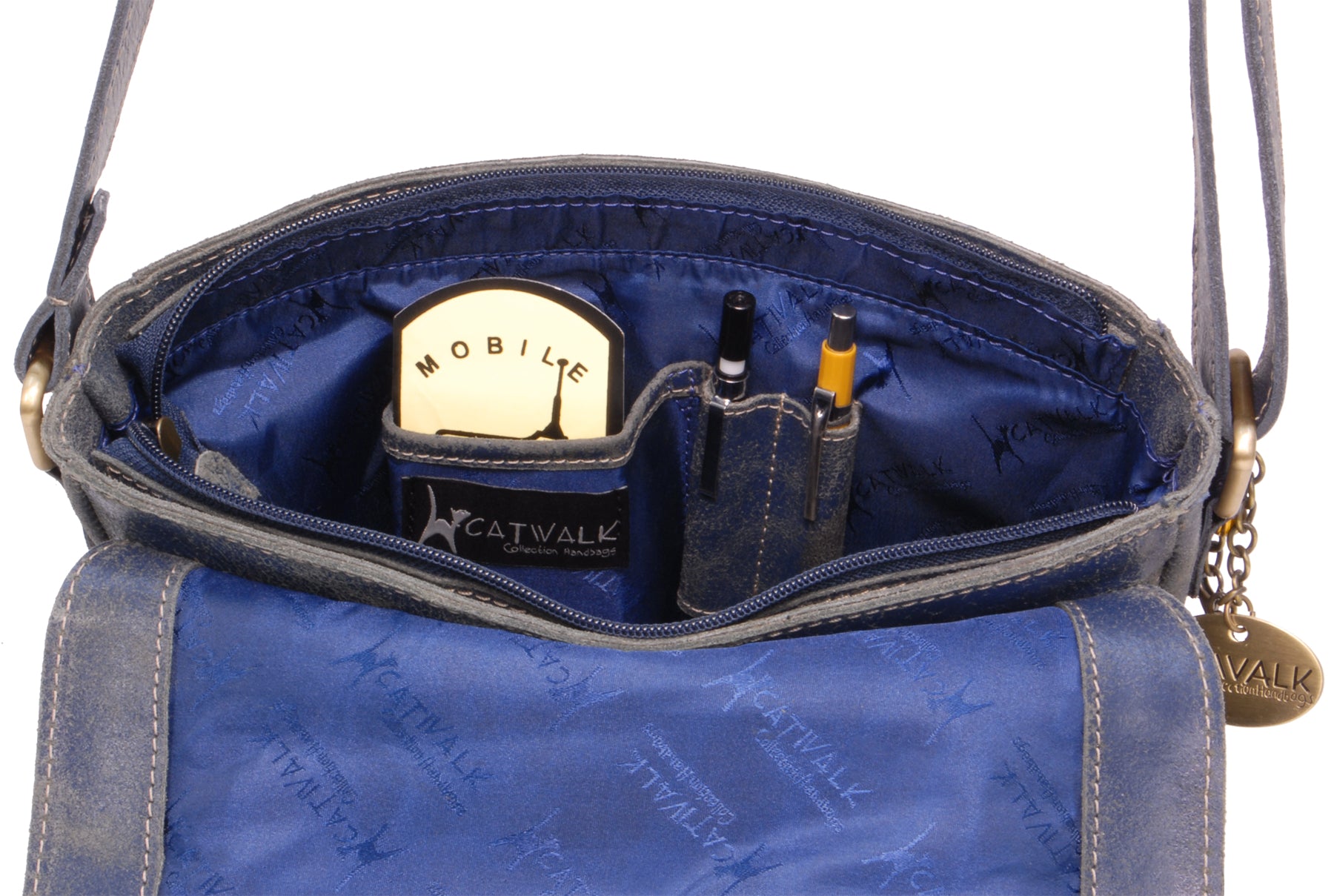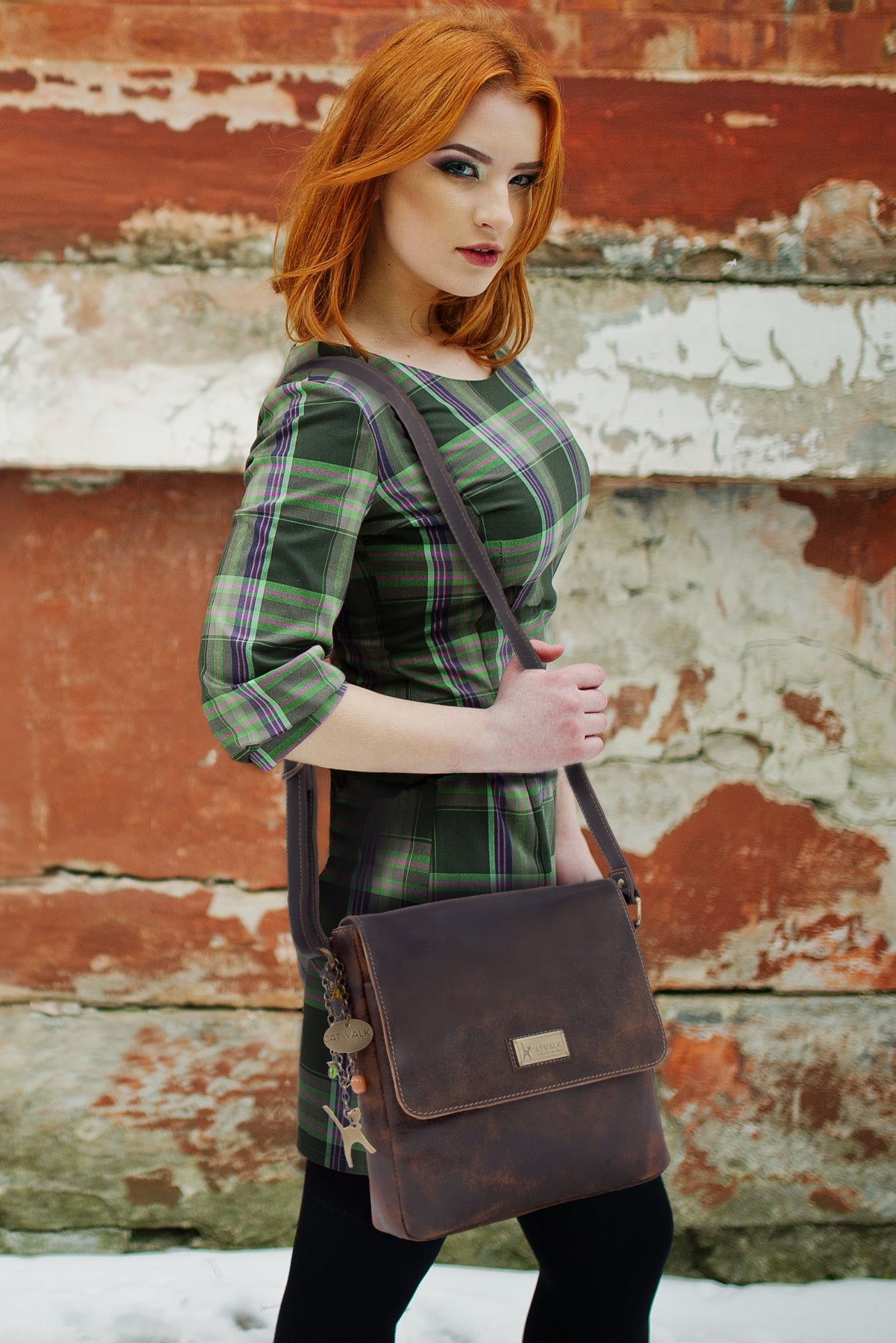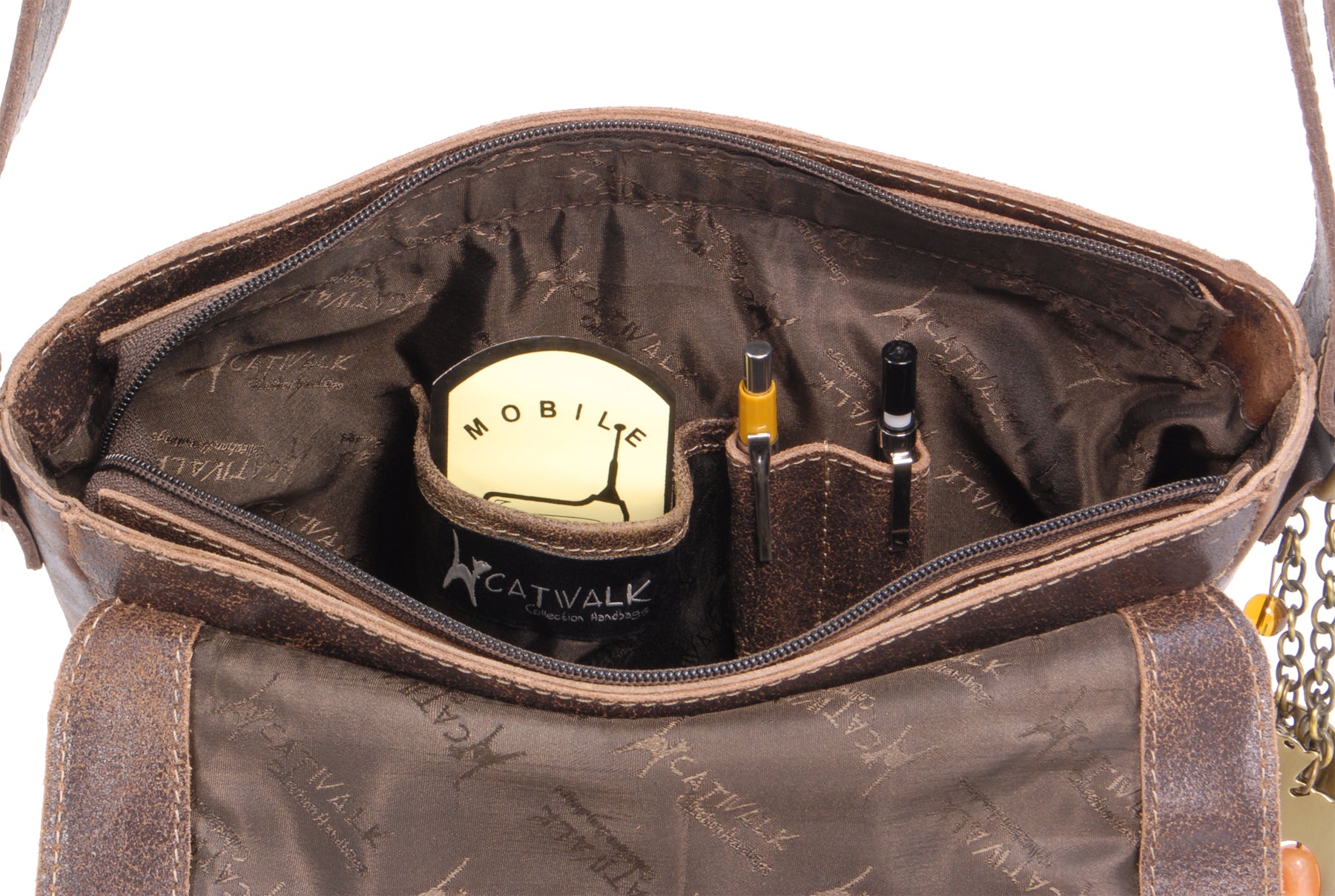 The long adjustable strap is made from leather; wear over the shoulder or hands free across the body.