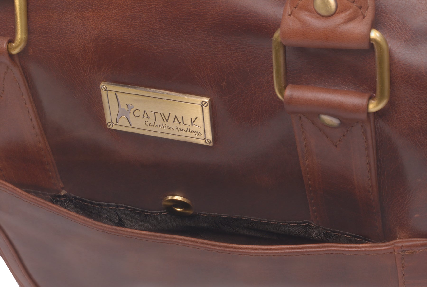 This is a large bag with excellent capacity; magnetic snaps which tuck down the outer ends of the bag can be released to give extra room when required. The base of the bag is flat with studded feet. The Catwalk Collection Cat Logo is stylishly imprinted into a brass plate attached to the front panel. The interior is beautifully lined with signature fabric.