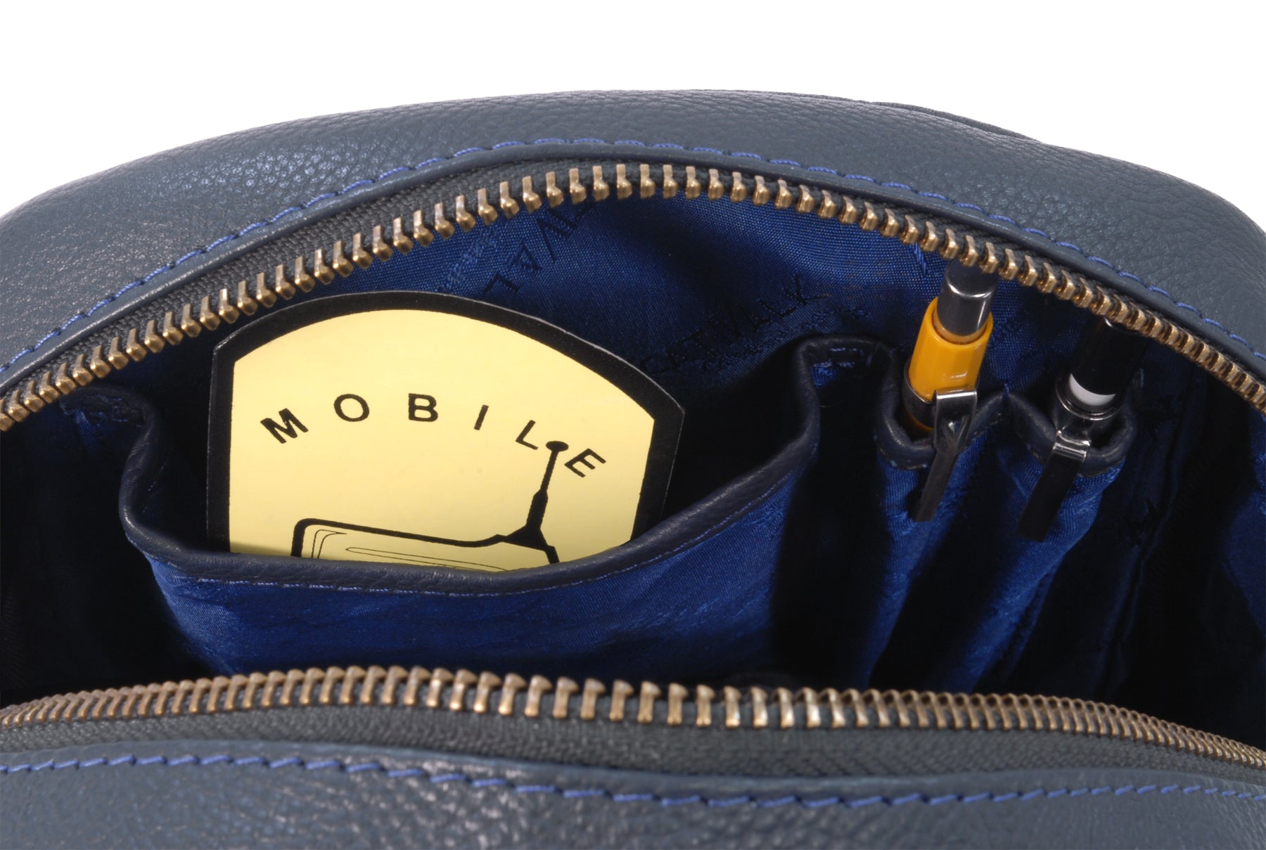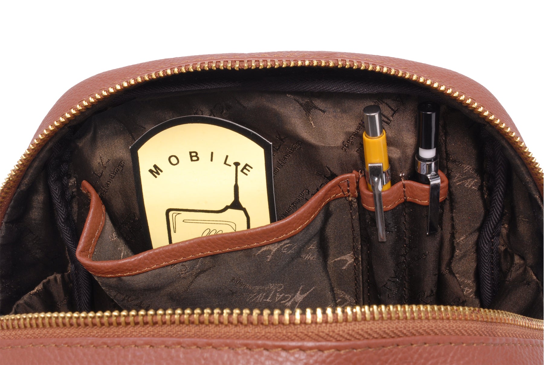 Pockets: 1 Main Compartment + 1 Interior Rear Zipped Pocket + 1 Interior Leather Mobile Phone Holder + 2 Leather topped Pen Holders + 1 Key Fob + 3 Credit Card Holders + 2 Outer Front Zipped Pocket + 1 Outer Rear Open Pocket