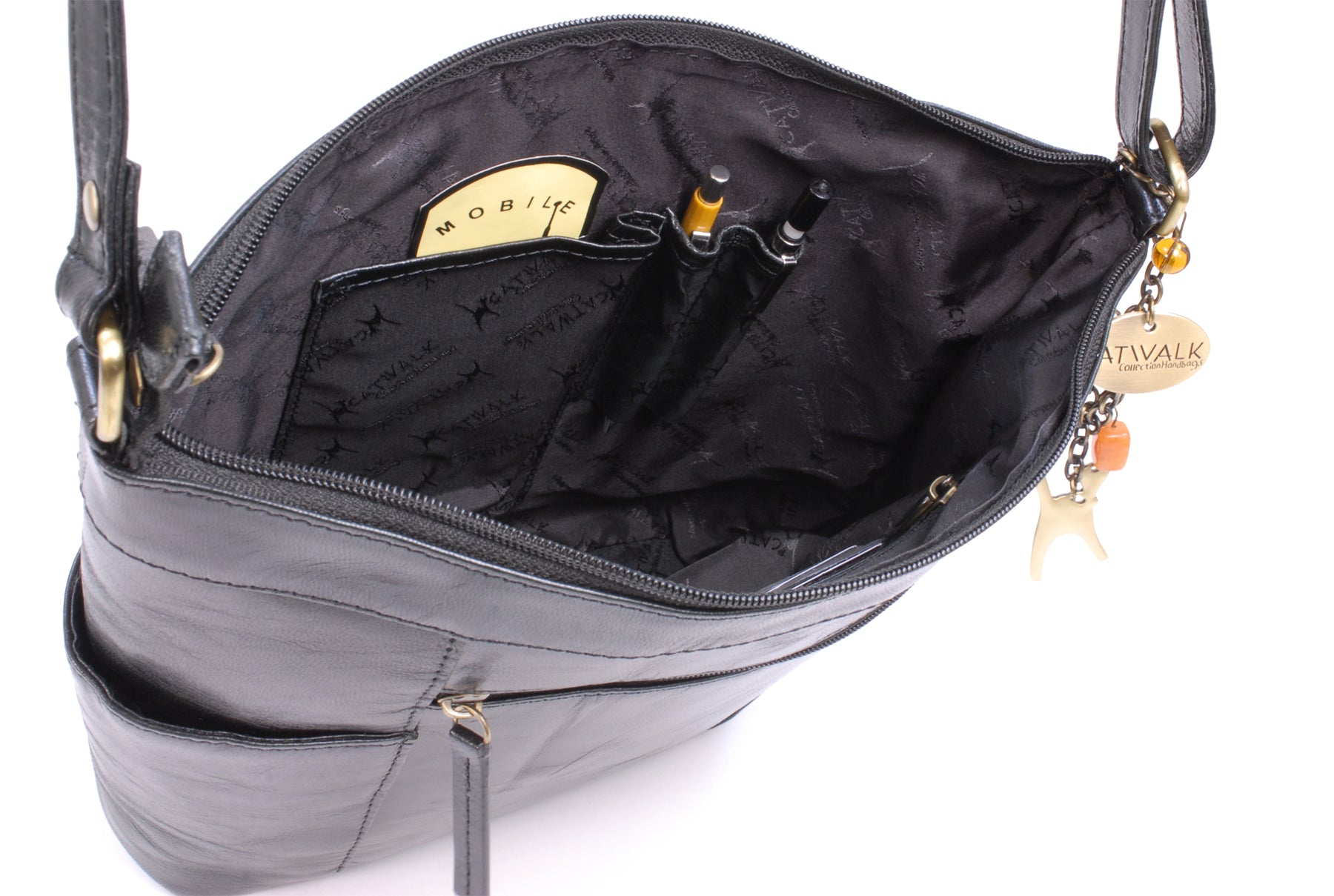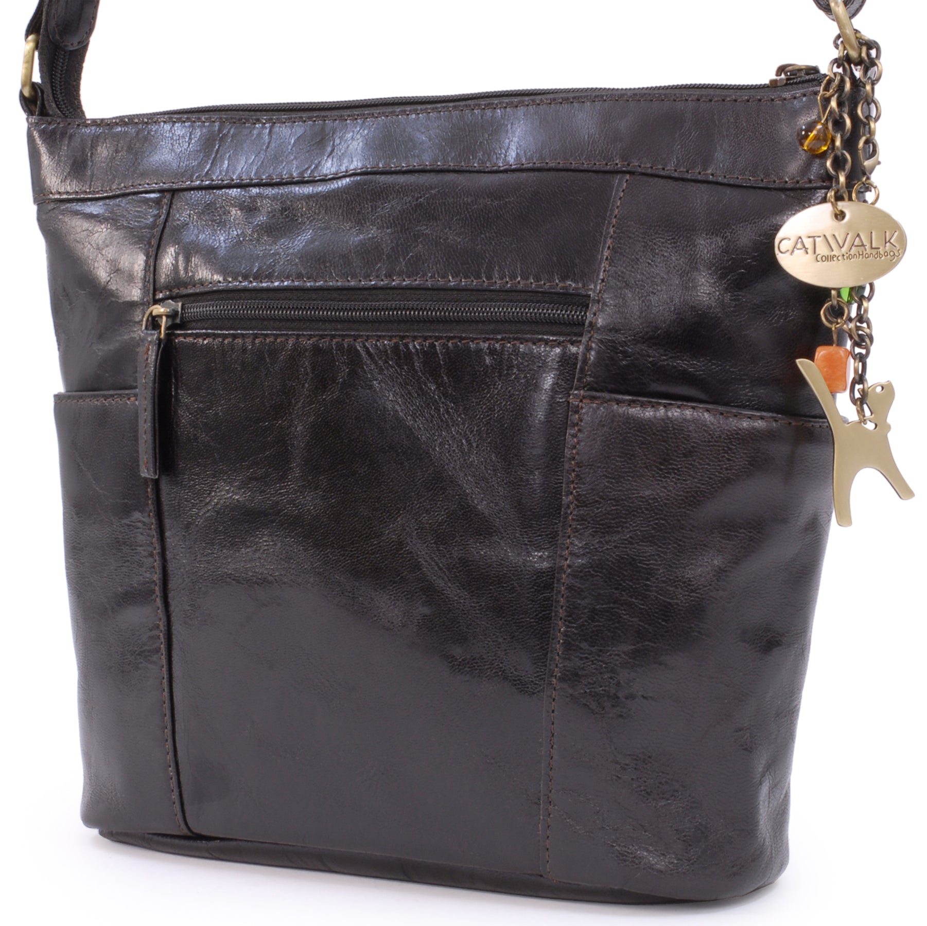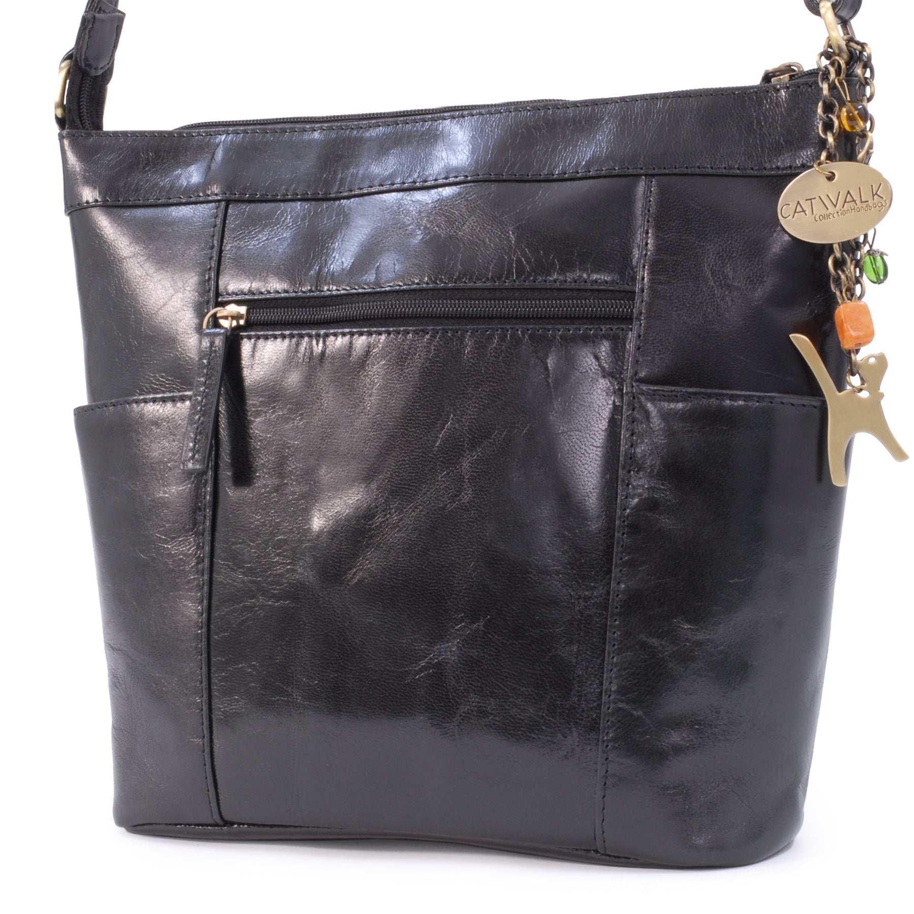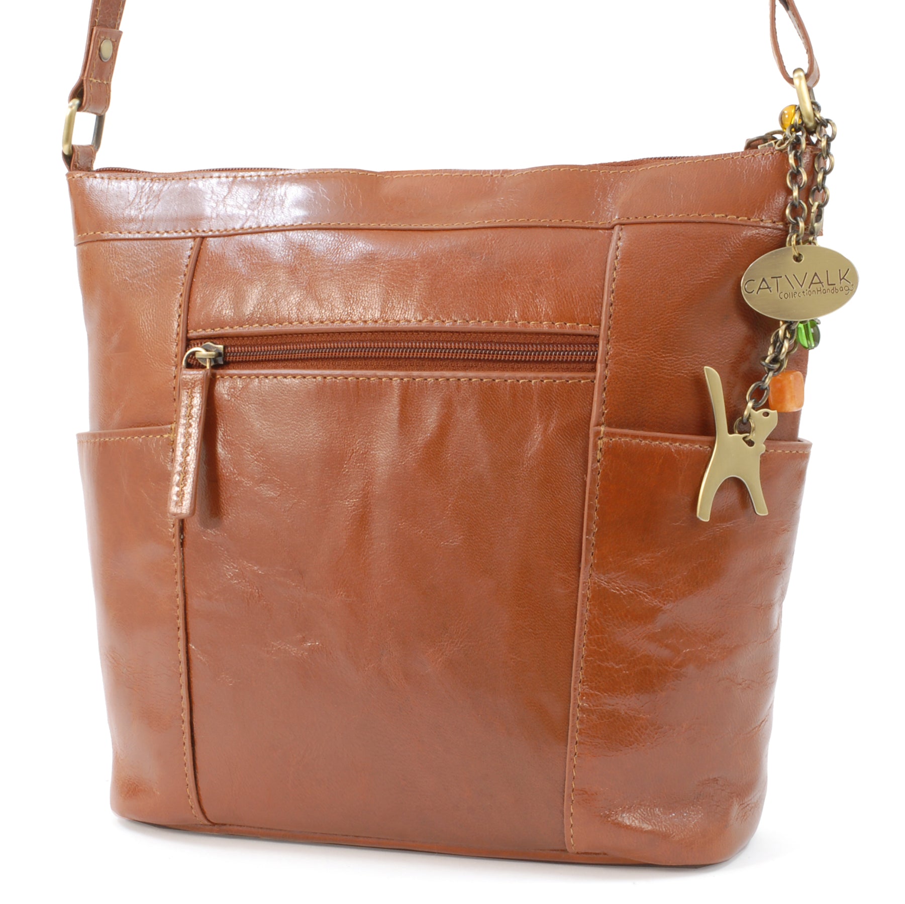 An adjustable leather strap enables the bag to be worn over-the-shoulder or hands-free across-the-body. The Catwalk Collection Cat Logo is stylishly imprinted into a brass plate attached to the front panel.