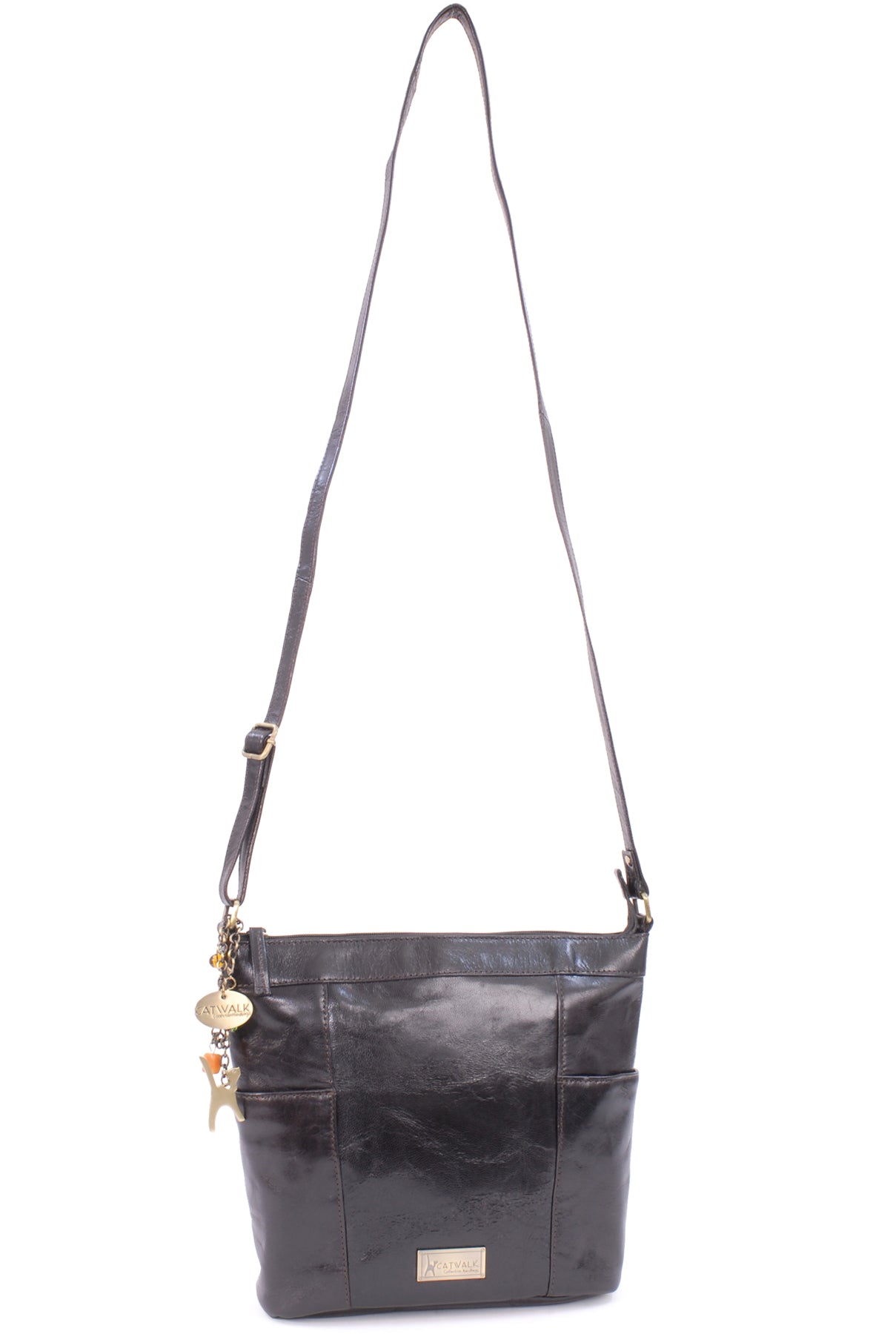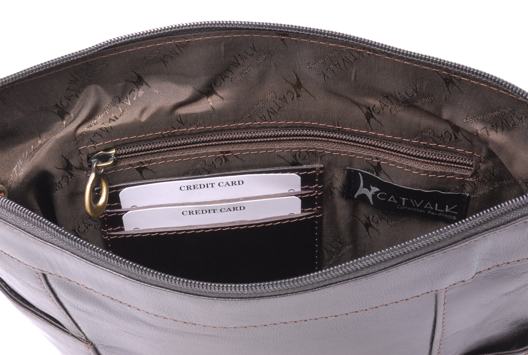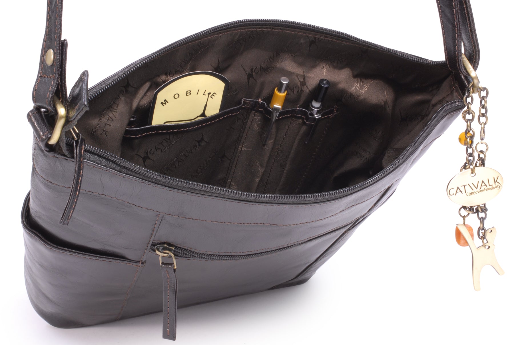 An adjustable leather strap enables the bag to be worn over-the-shoulder or hands-free across-the-body. The Catwalk Collection Cat Logo is stylishly imprinted into a brass plate attached to the front panel.