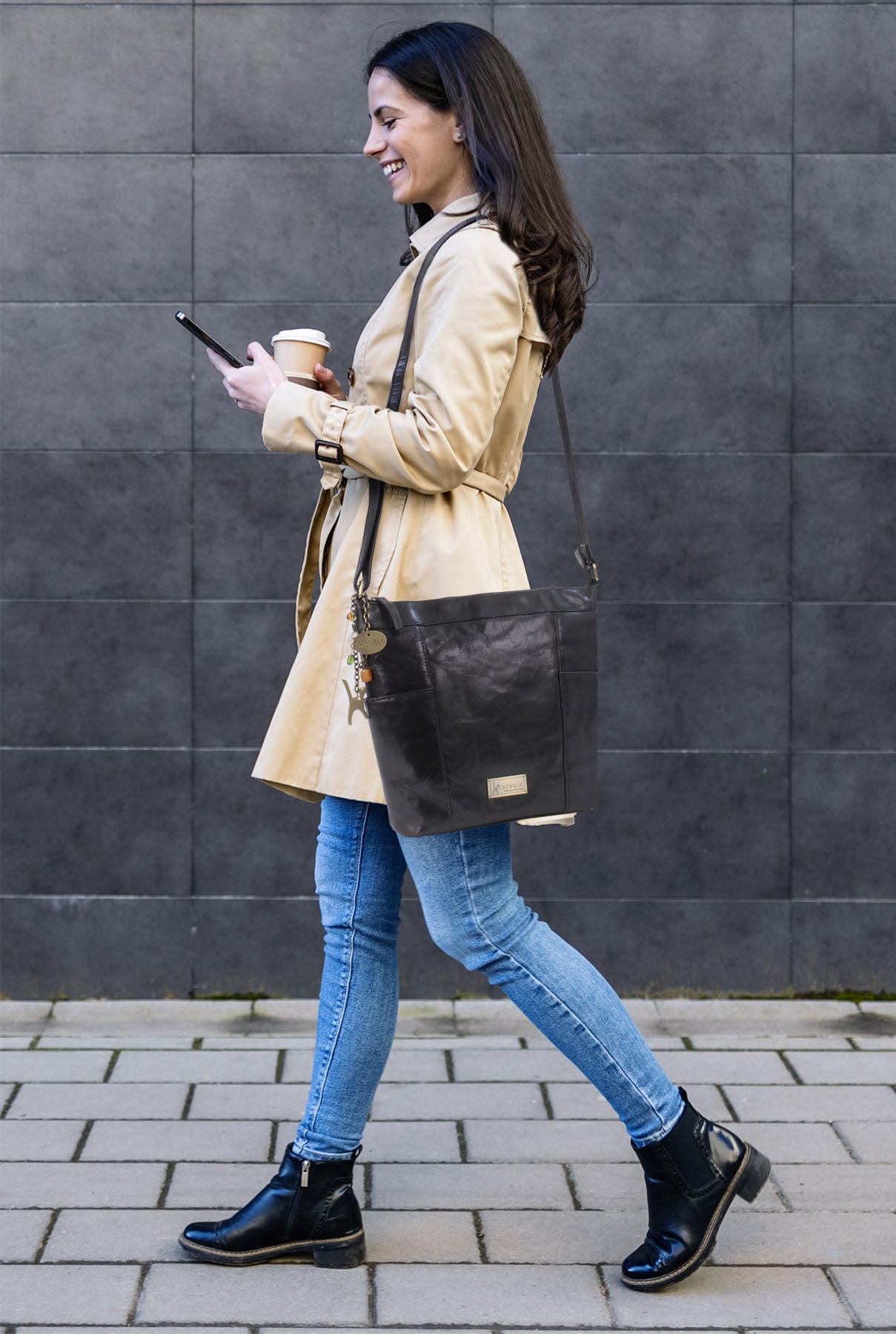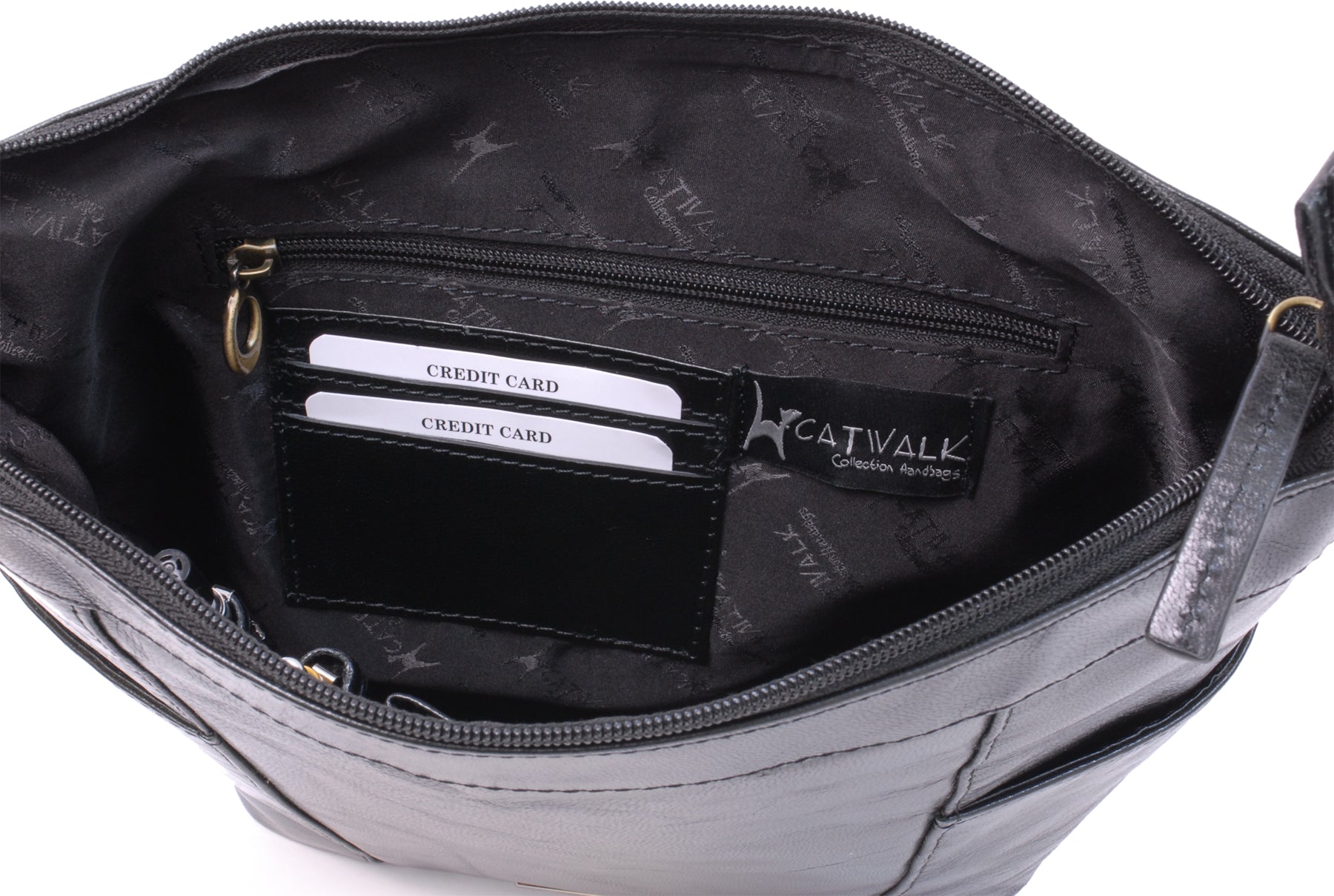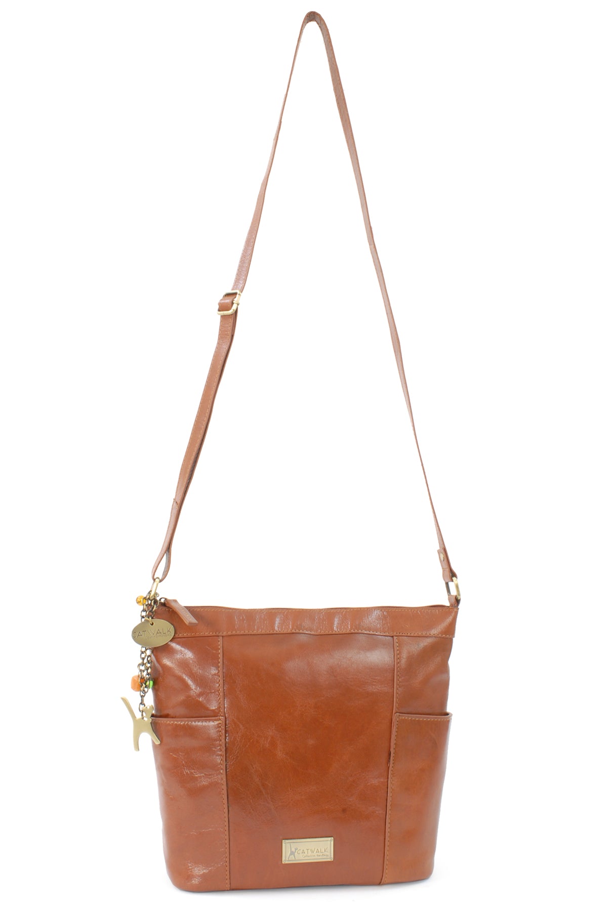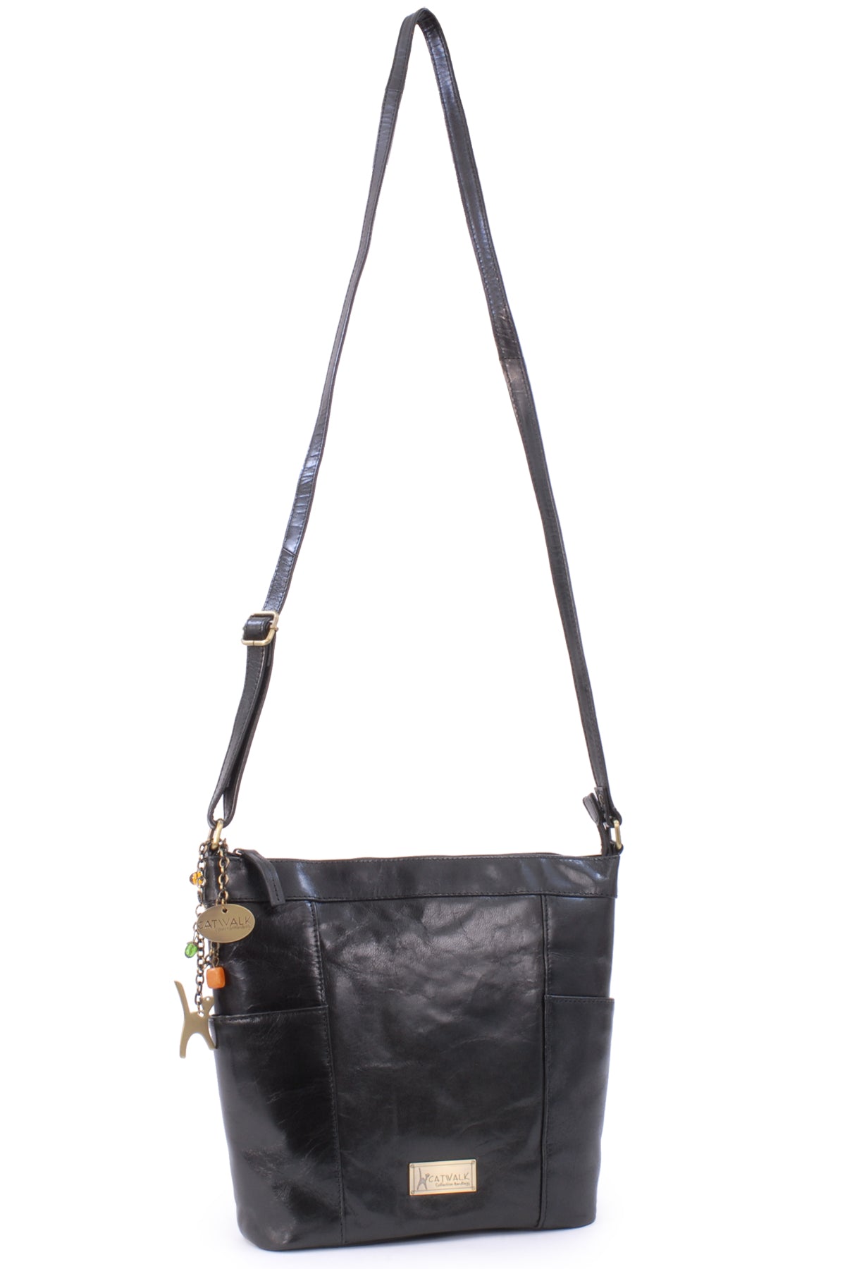 An adjustable leather strap enables the bag to be worn over-the-shoulder or hands-free across-the-body. The Catwalk Collection Cat Logo is stylishly imprinted into a brass plate attached to the front panel.