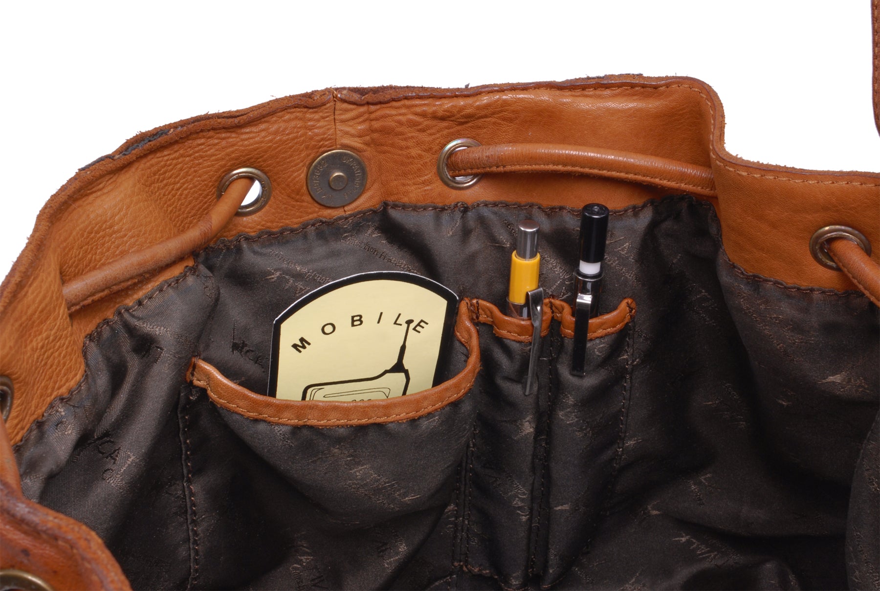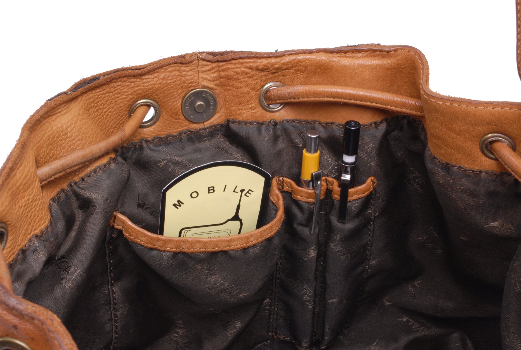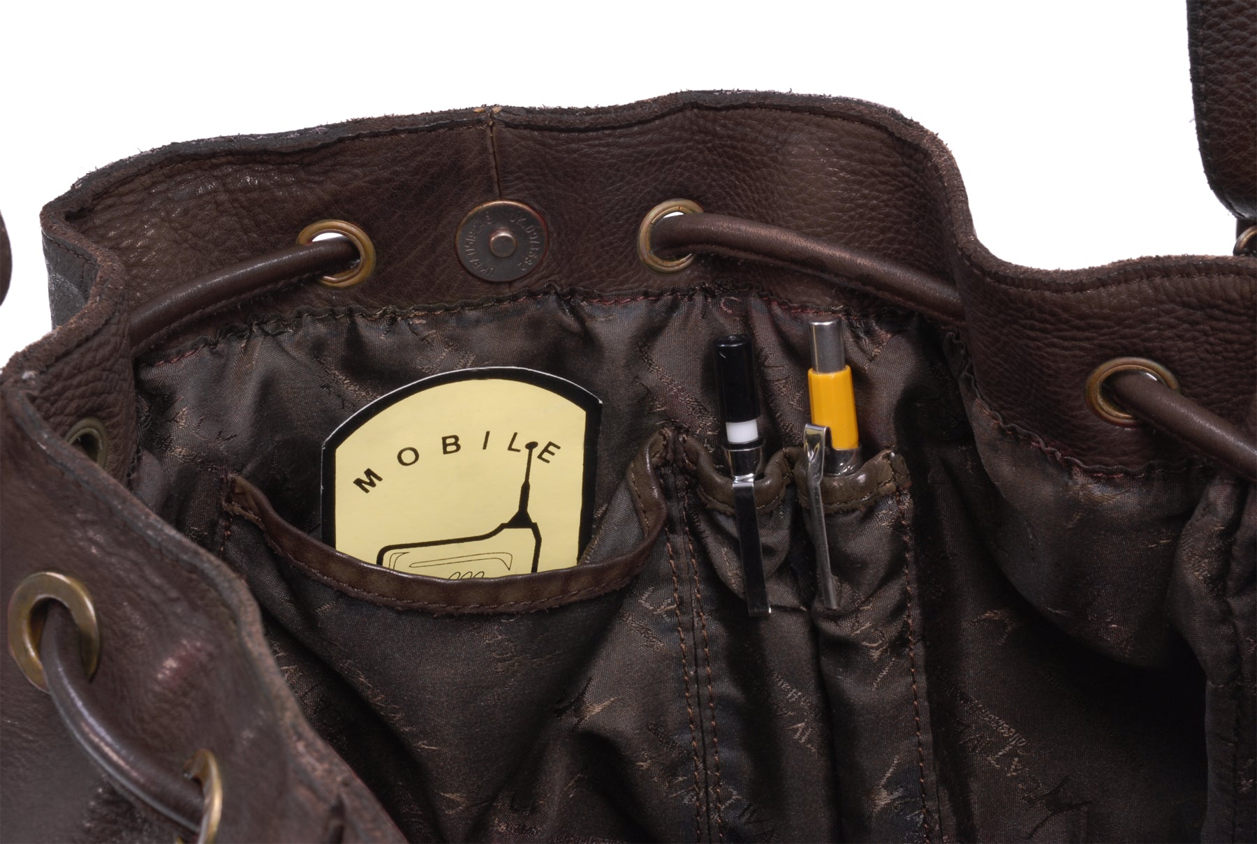 This bag opens up to a roomy interior offering ample space for everyday essentials, while the drawstring closure offers accessibility and security. This is a mid to big bag with good capacity and plenty of compartments and pockets to organise contents.