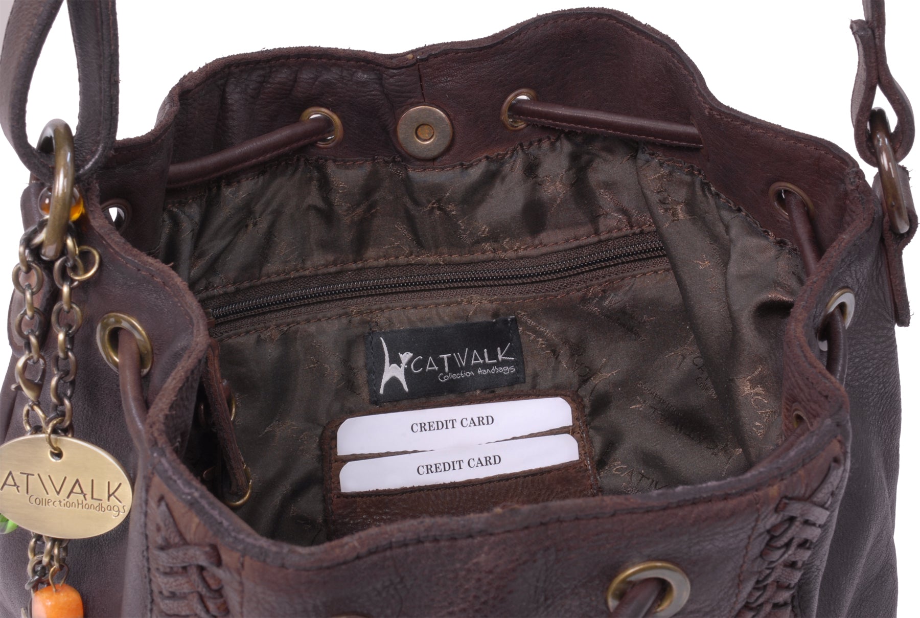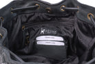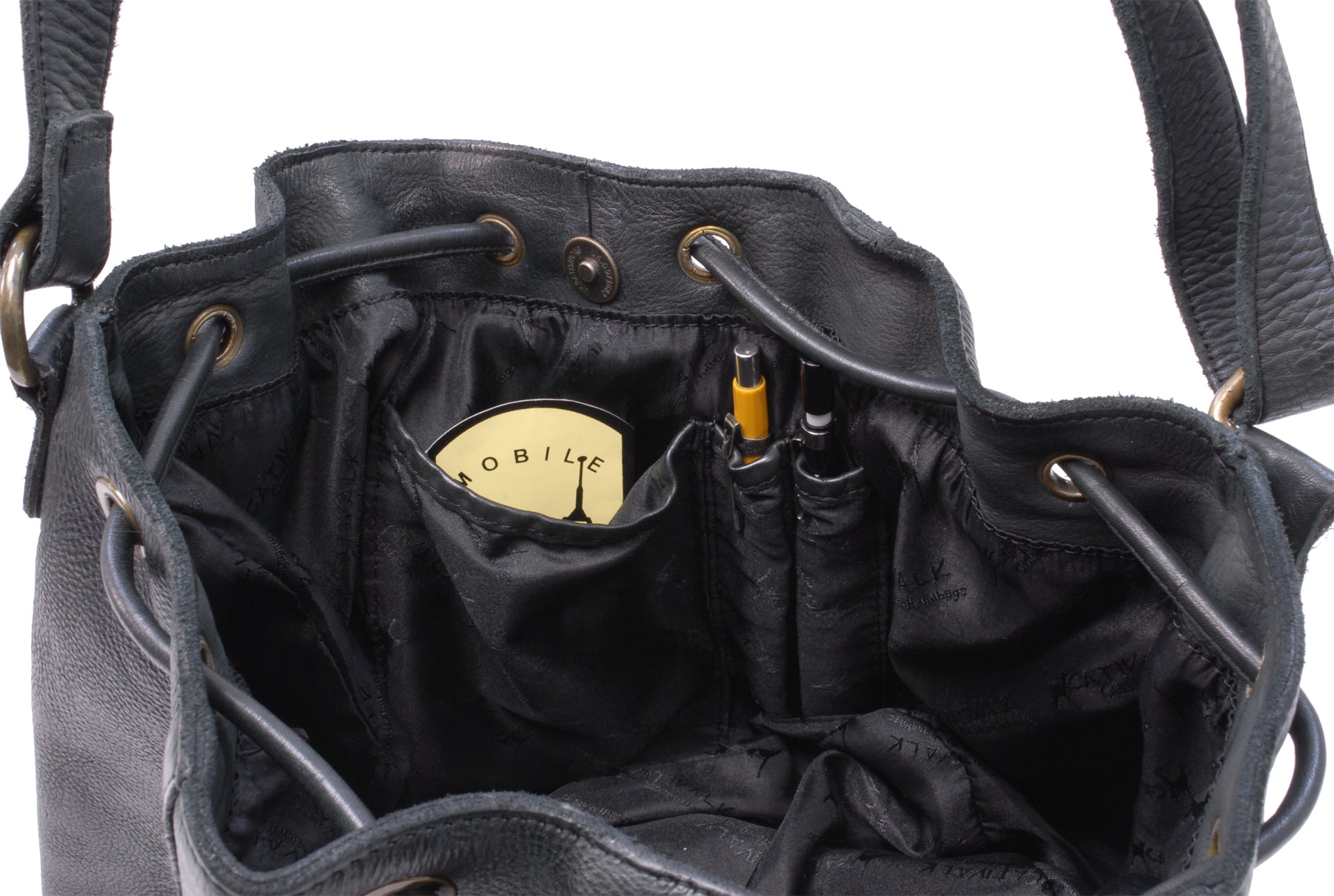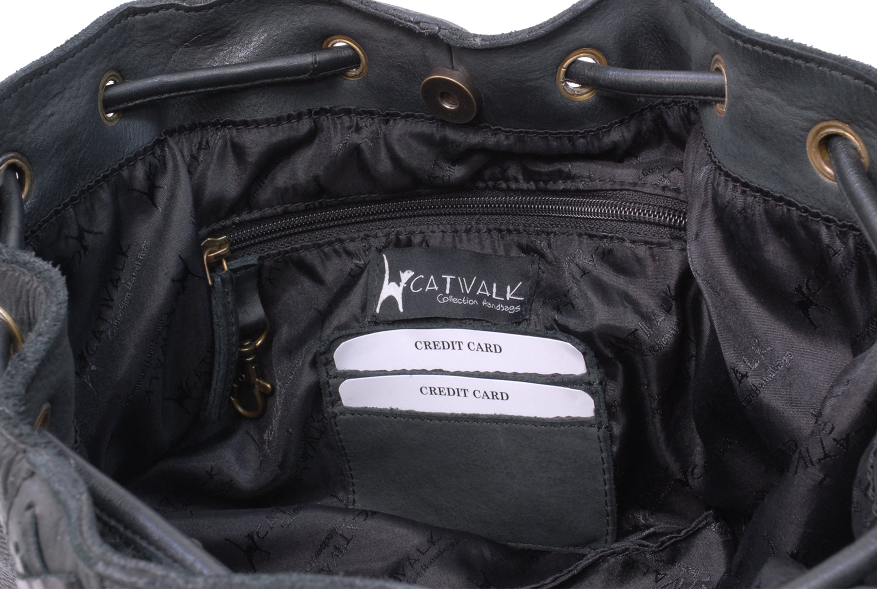 This bag opens up to a roomy interior offering ample space for everyday essentials, while the drawstring closure offers accessibility and security. This is a mid to big bag with good capacity and plenty of compartments and pockets to organise contents.