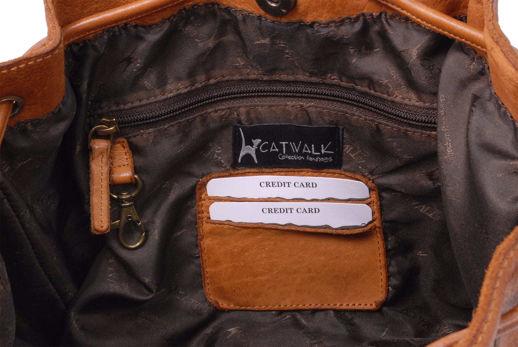 The interior is beautifully lined with signature fabric. Interior pockets are reinforced with leather trim for a touch of luxury.
