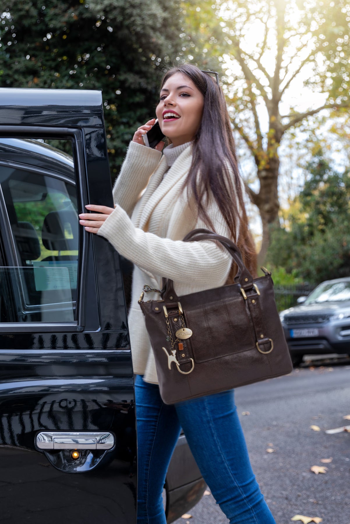 A VERSATILE LEATHER COMMUTER HANDBAG, SHOULDER BAG, TOTE WITH HANDY PHOTO ID WINDOW / TRAVEL PASS HOLDER AND ROOM FOR AN IPAD