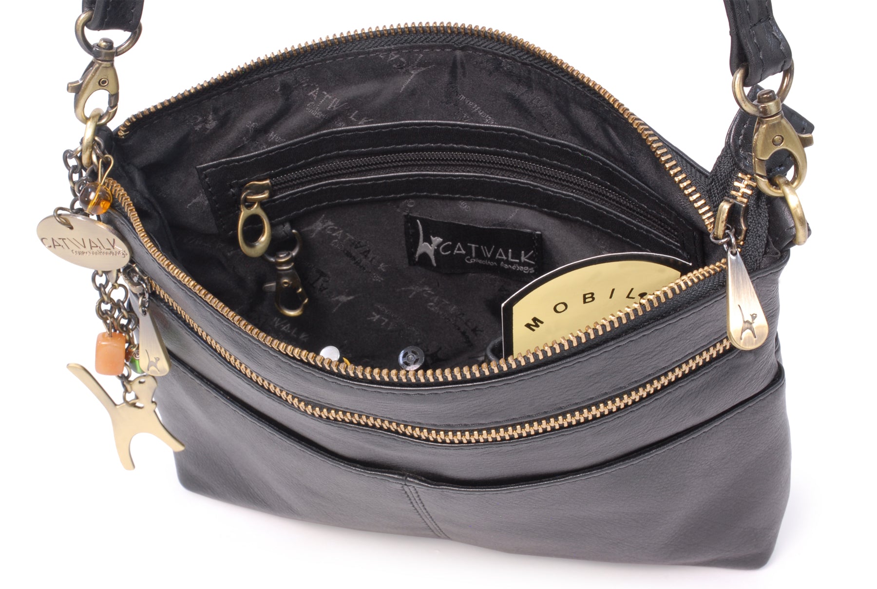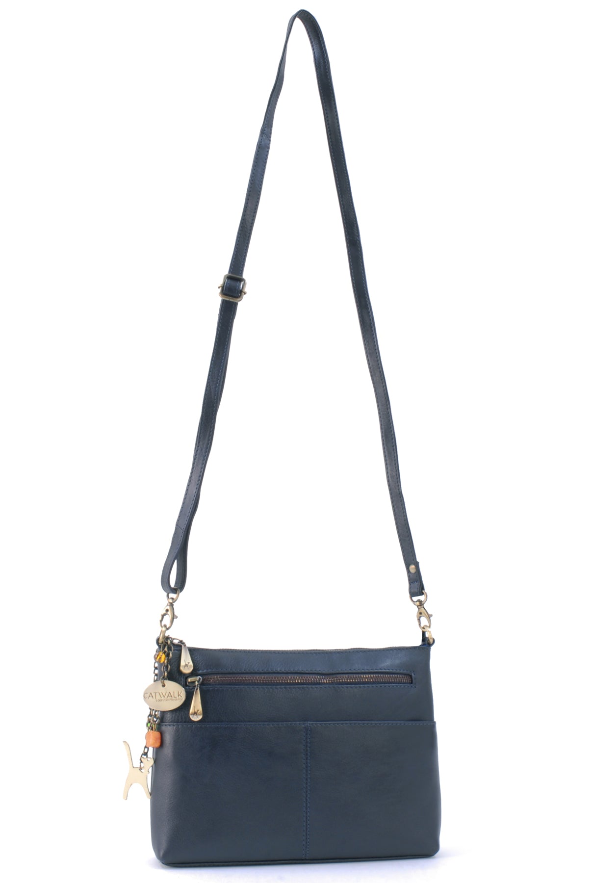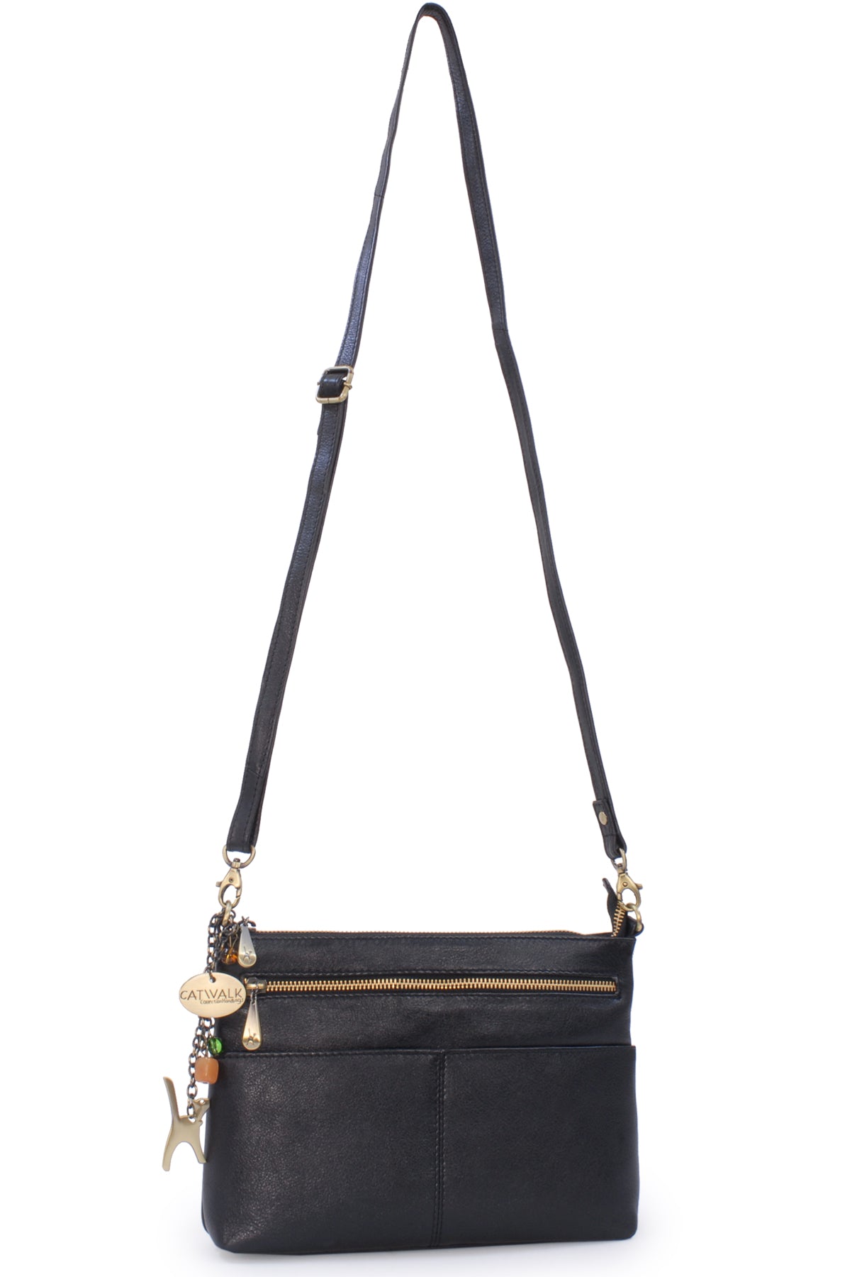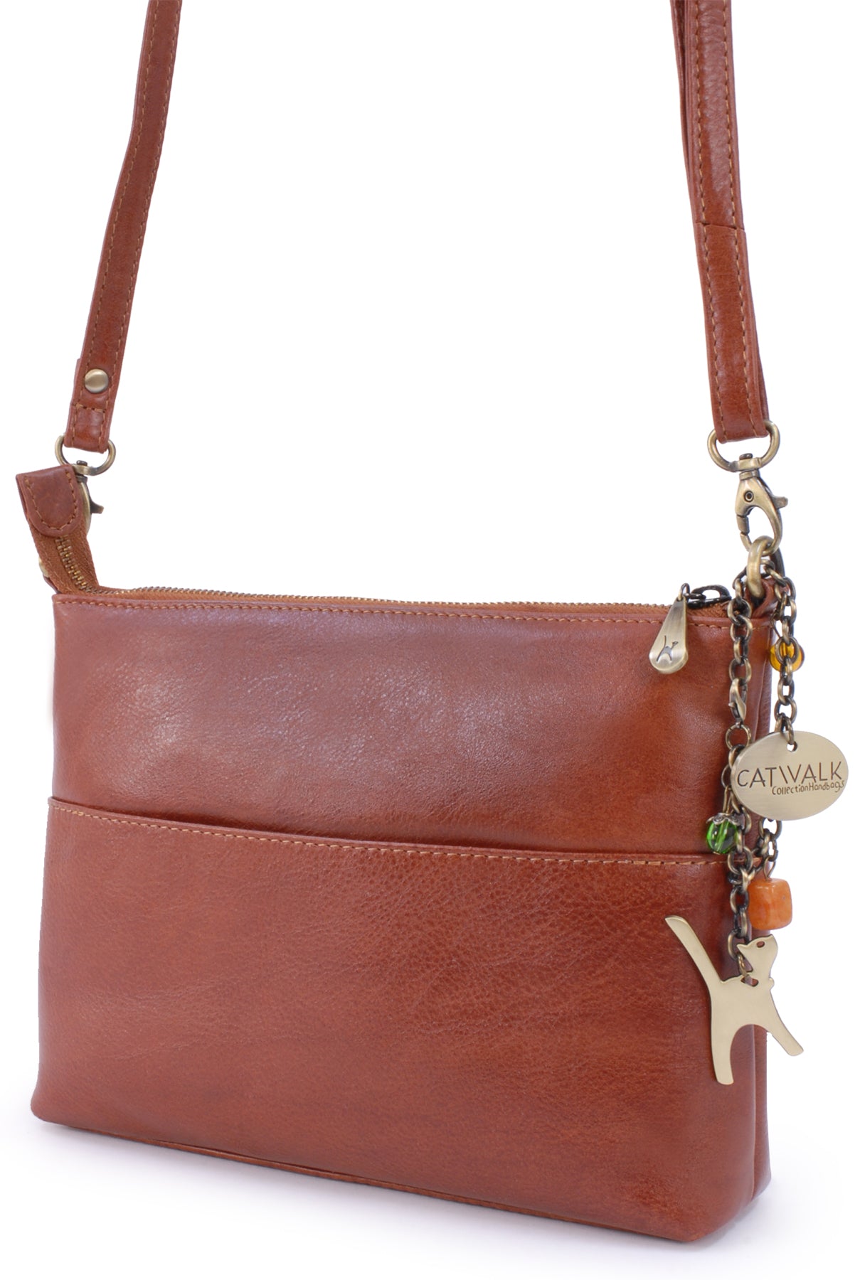The adjustable, detachable leather strap allows the bag to be worn across the body, over the shoulder, or removed for use as a clutch bag. Metal brass zip detailing adds character, with each zip pull imprinted with the Catwalk Collection Cat Logo. Organisational features include internal pockets for pens, credit cards, and a mobile phone. The interior is fully lined with signature fabric, and pockets are reinforced with leather trim for added durability.