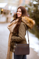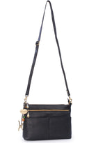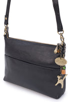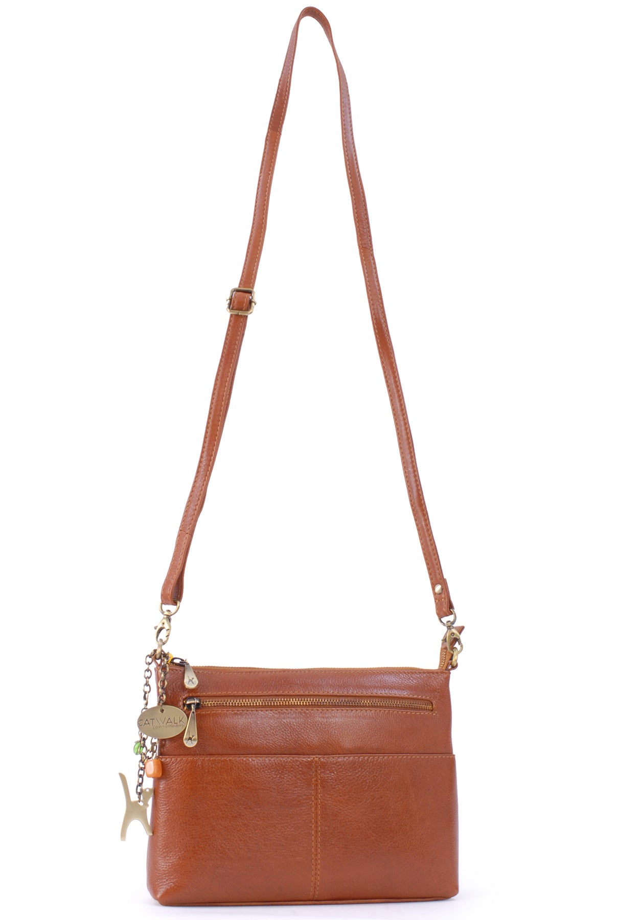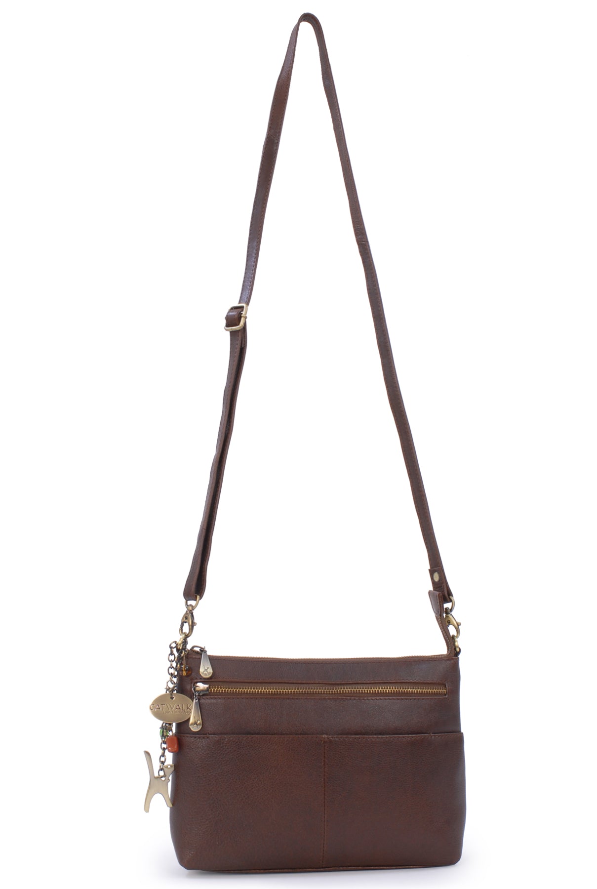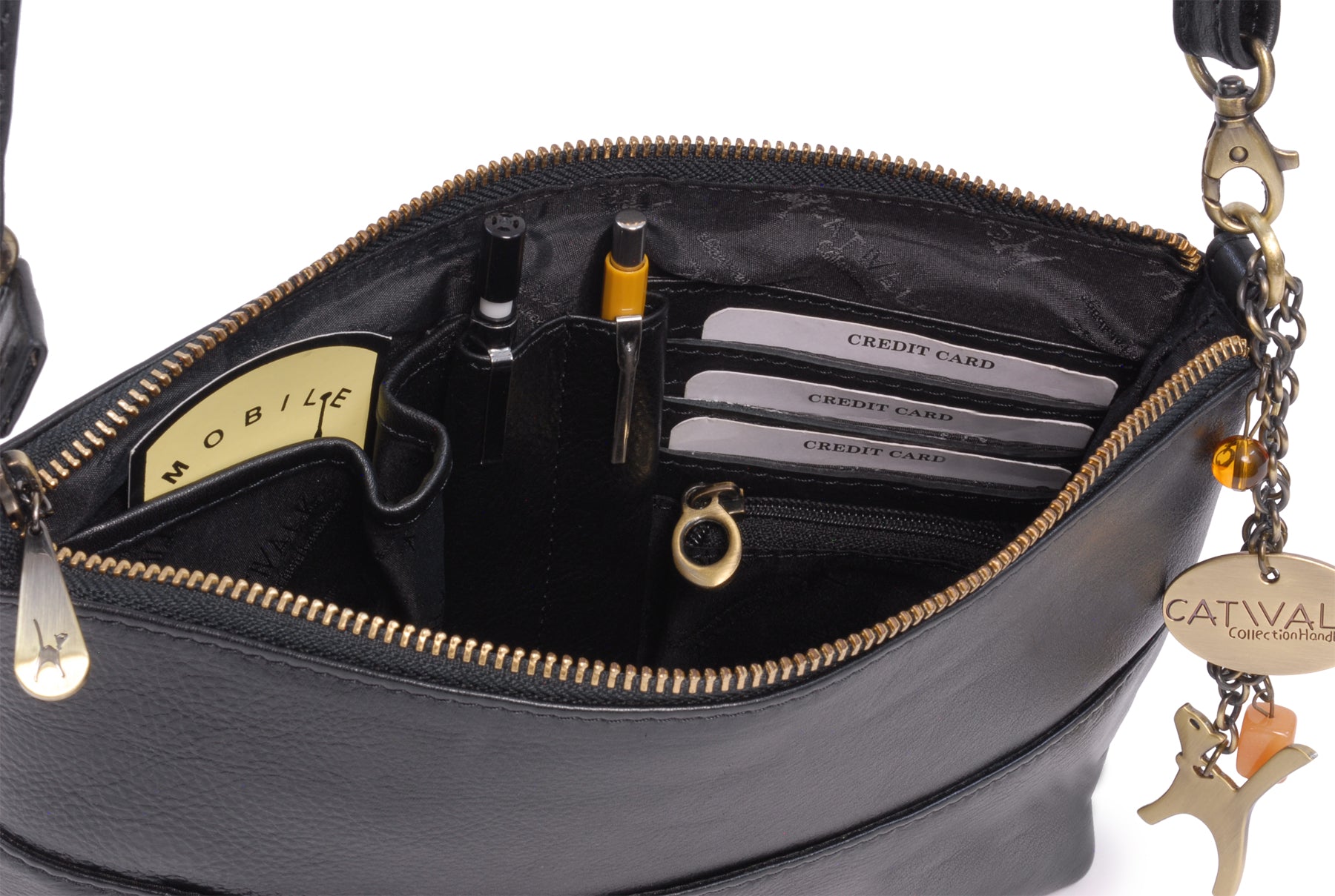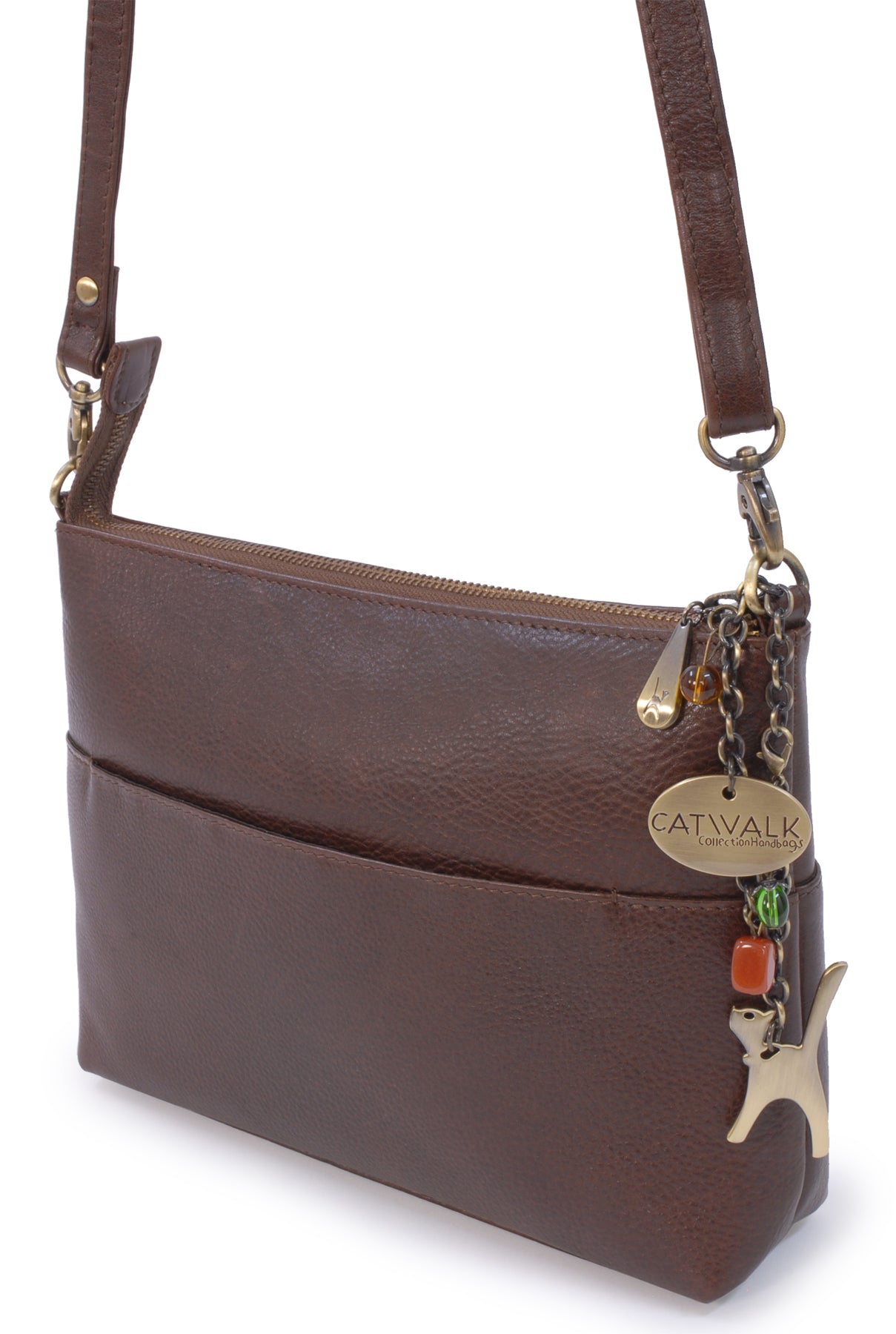 The adjustable, detachable leather strap allows the bag to be worn across the body, over the shoulder, or removed for use as a clutch bag. Metal brass zip detailing adds character, with each zip pull imprinted with the Catwalk Collection Cat Logo. Organisational features include internal pockets for pens, credit cards, and a mobile phone. The interior is fully lined with signature fabric, and pockets are reinforced with leather trim for added durability.
