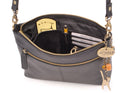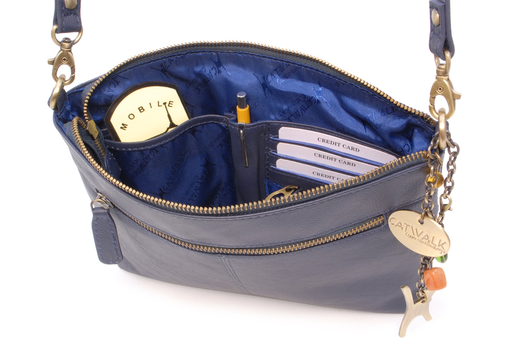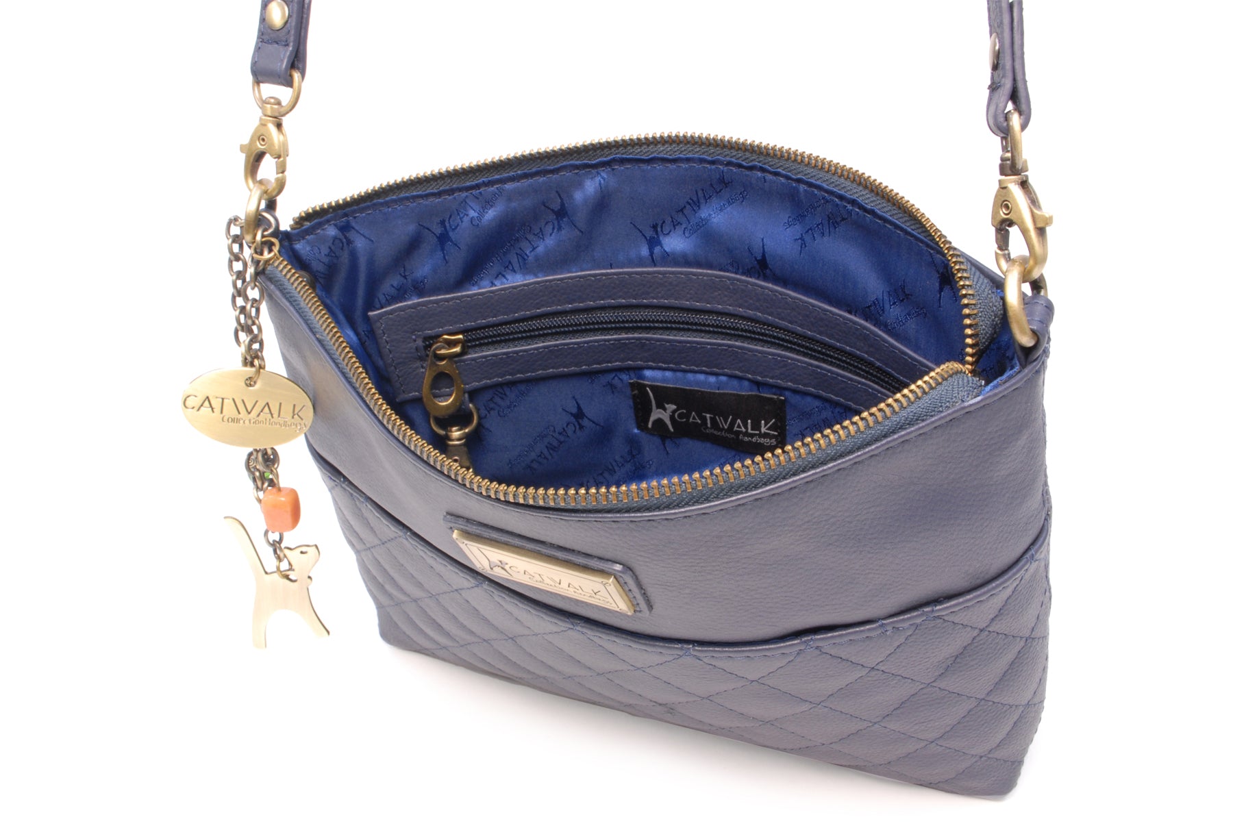 This is a small, slim fitting cross-body bag for those essential items such as purse and make-up. The interior is beautifully lined with signature fabric. Interior capacity: 23x17x2cms.