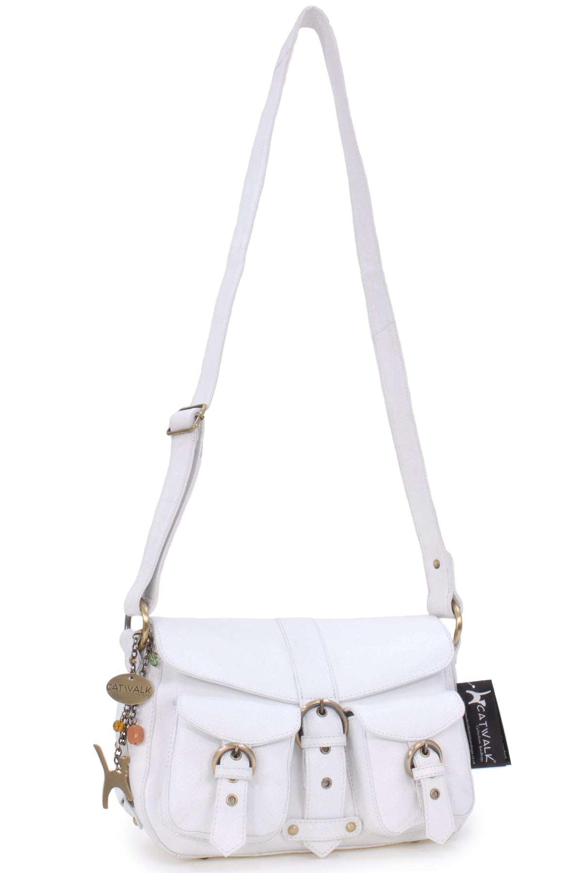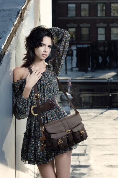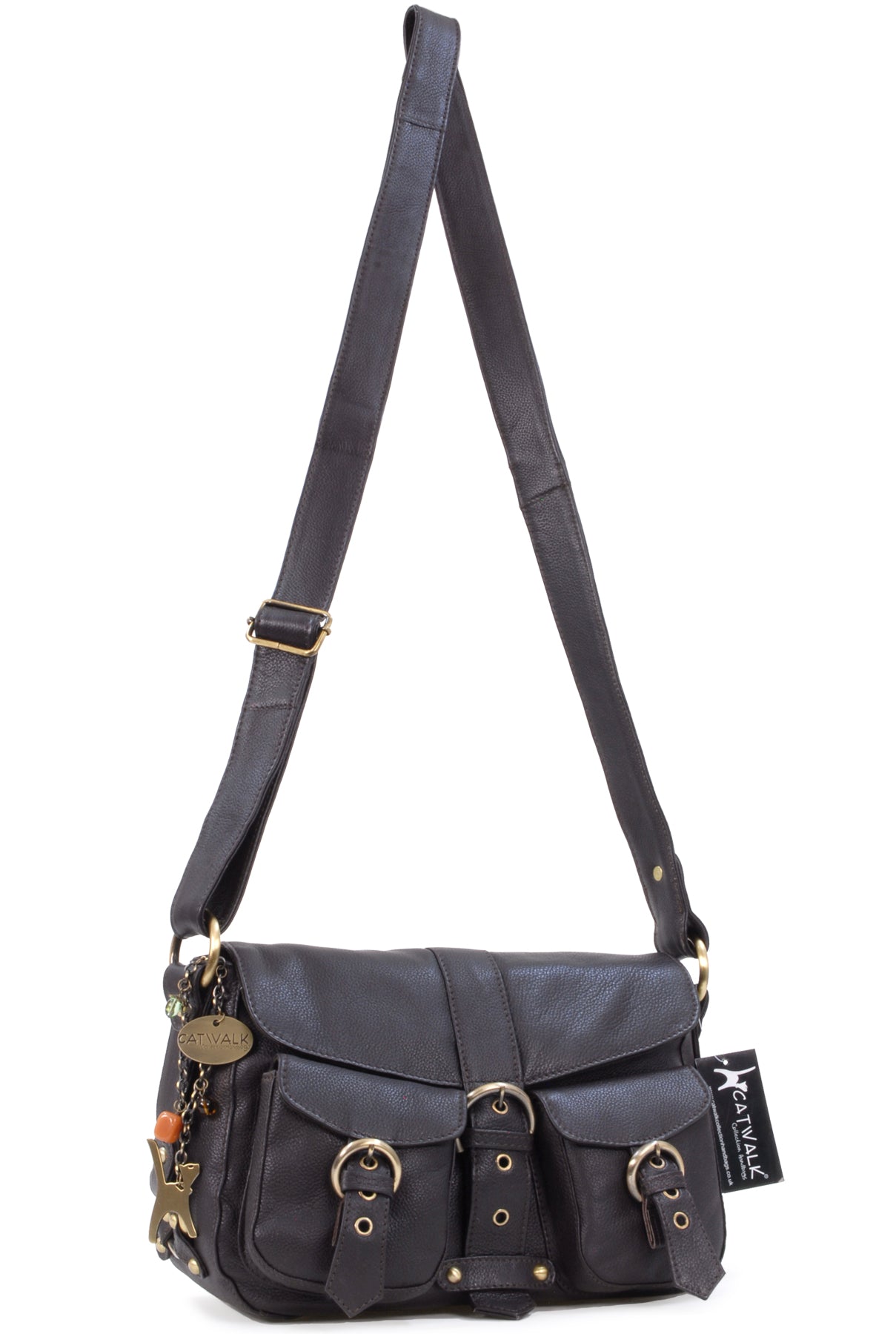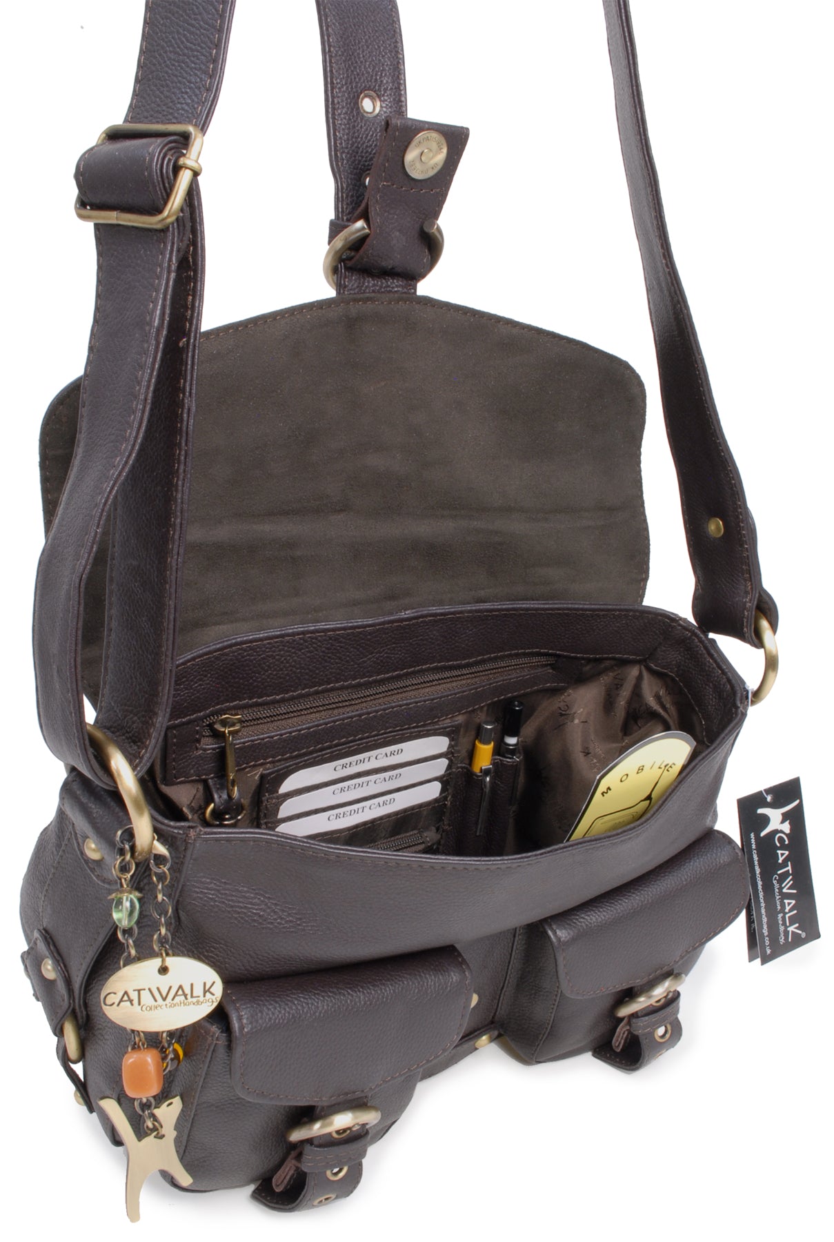 The long, flat leather strap can be adjusted for wear on the shoulder or hands-free, across the body.