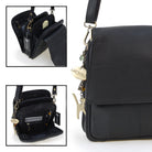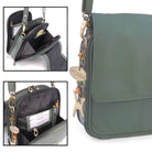 Two of the main compartments close securely with a zip beneath the main flap to store valuables. The base of the bag is flat.