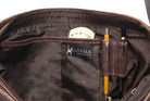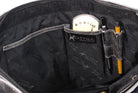 Leather outer and signature jacquard fabric interior.