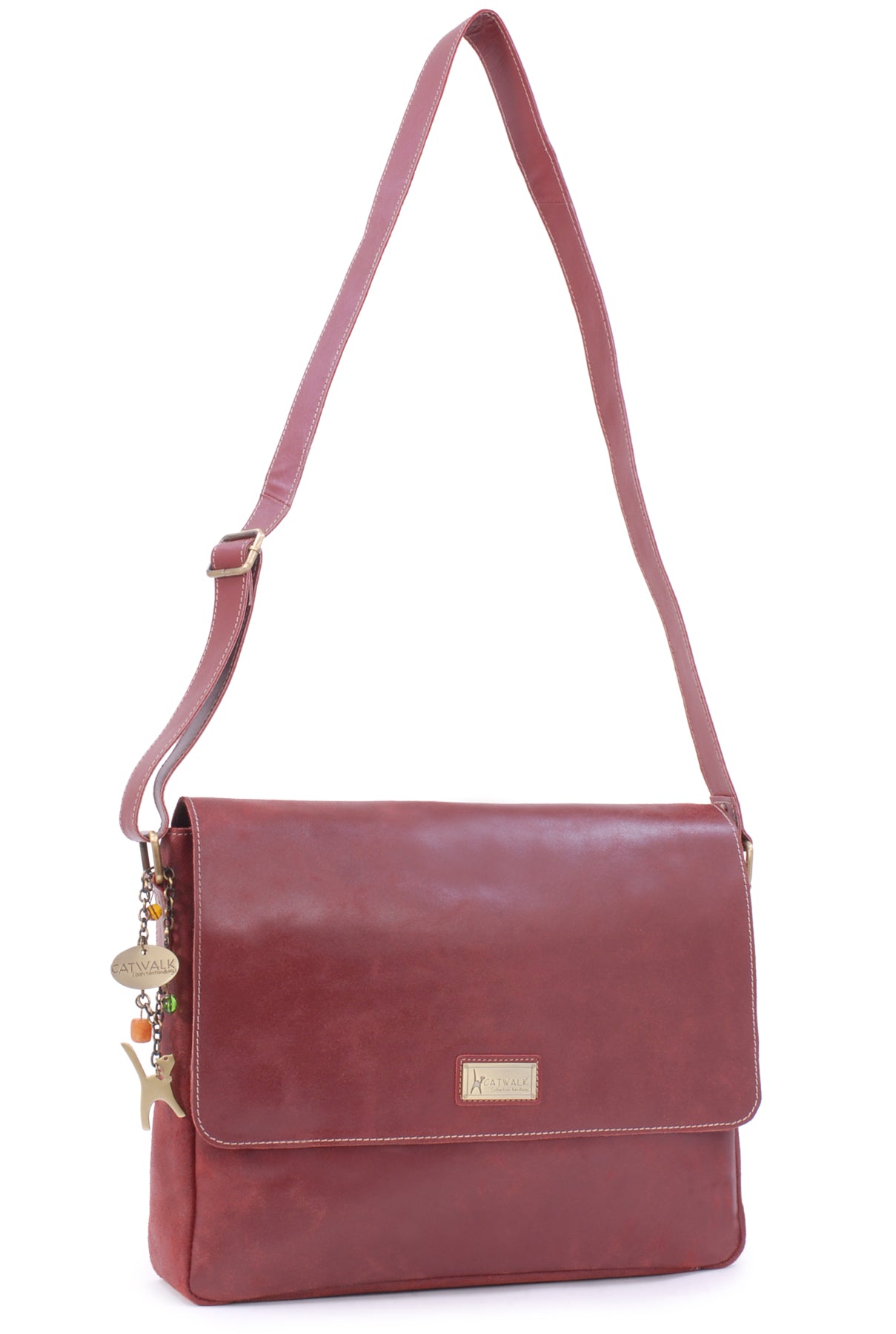 The long adjustable strap is made from leather; wear over the shoulder or hands free across the body.