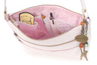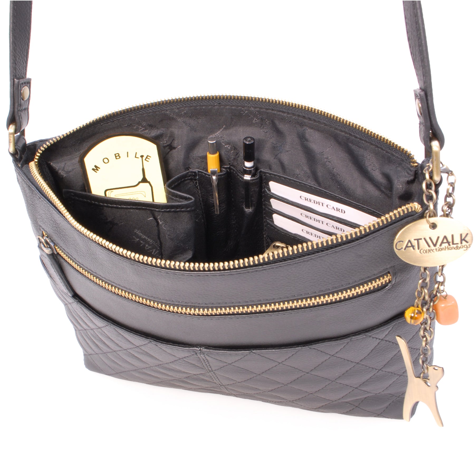 Interior pockets are reinforced with leather trim for a touch of luxury. Each bag has the benefit of an extra-long shoulder strap. The base of the bag is flat.