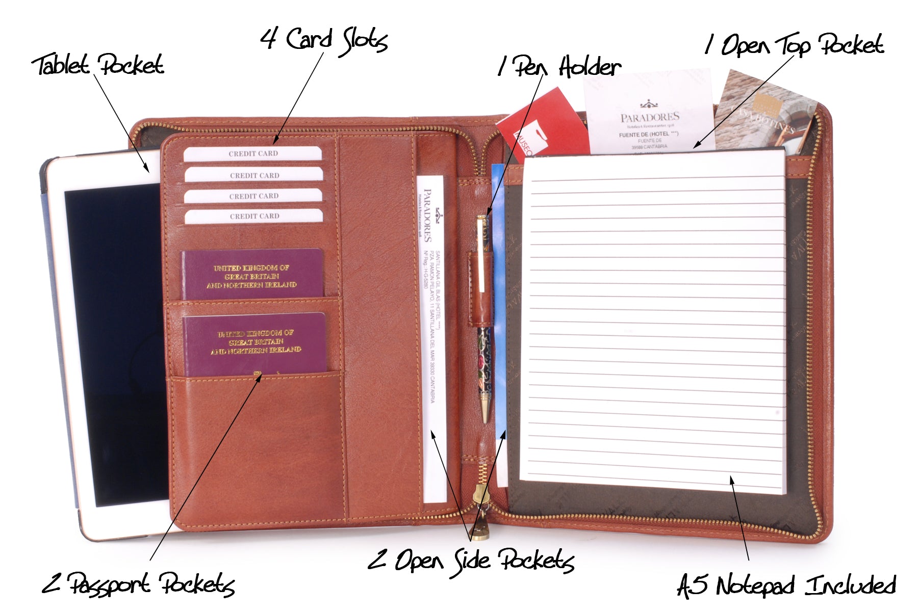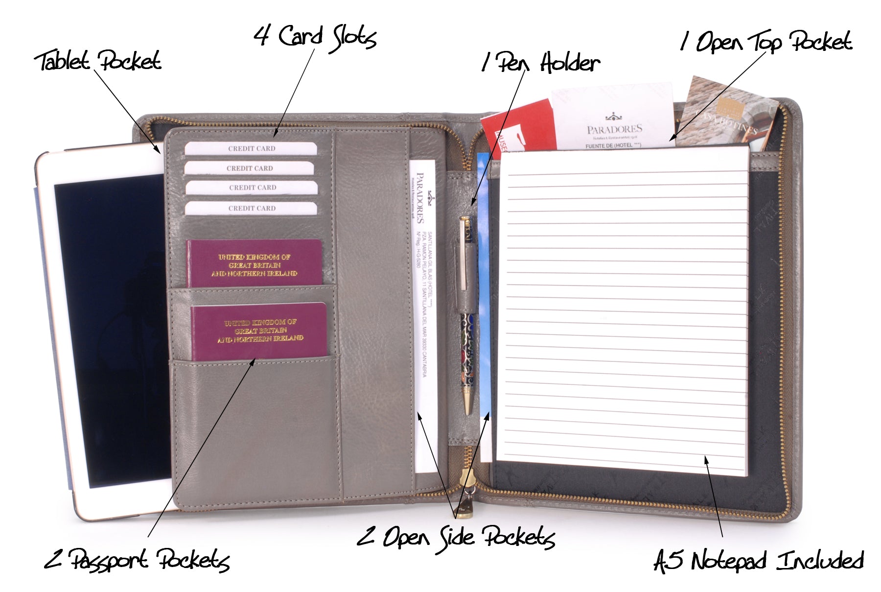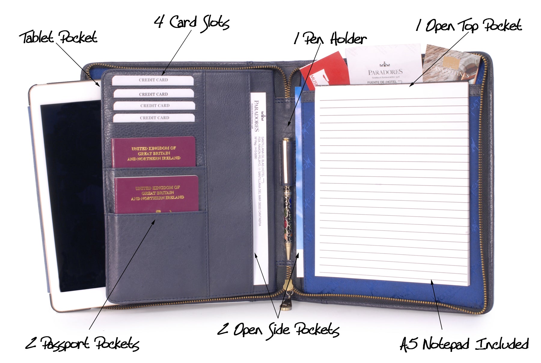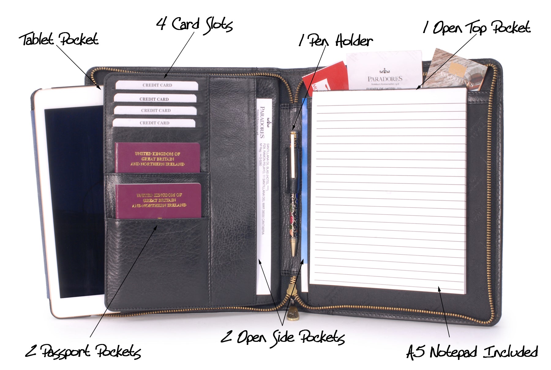 This neat zip folder is designed to be comfortably carried under the arm. Organisational features include pockets for pen, business cards and A5 notepad. You can tuck a tablet behind the interior leather sleeve.Fits: (iPad, iPad Mini, iPad Air, iPad Pro 11”, tablets, Galaxy Tab 3, 4, 5, A etc.)