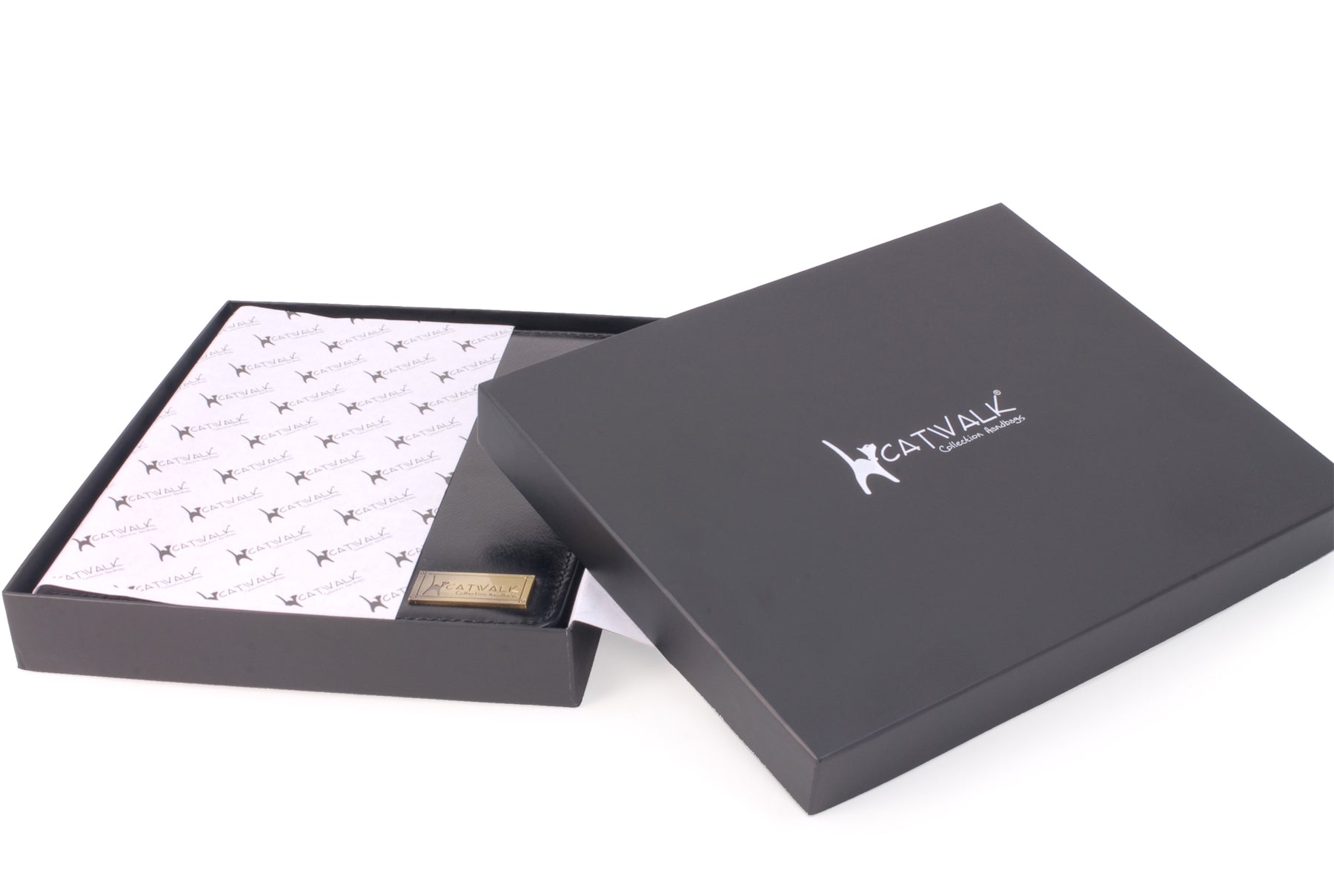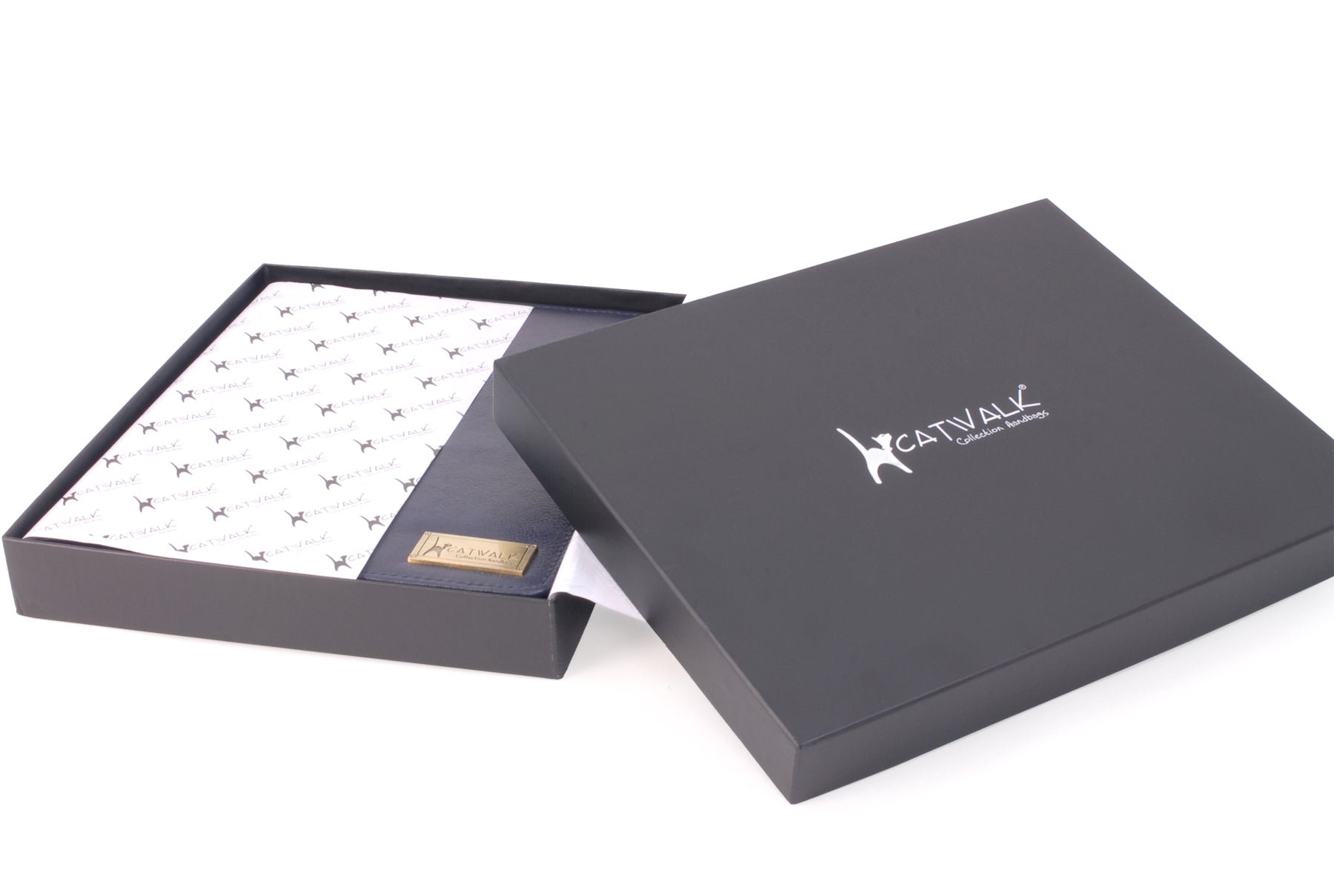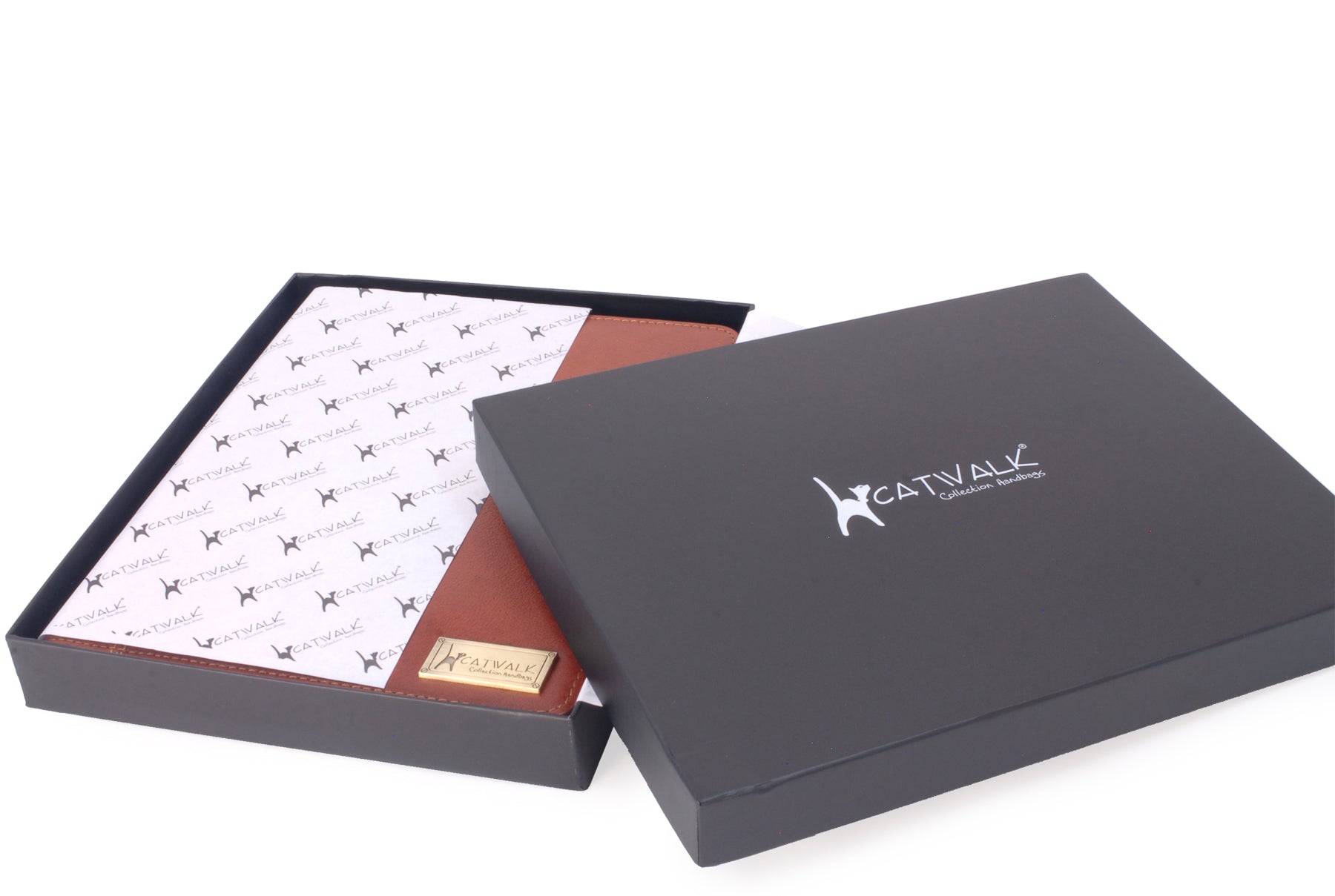 Each product comes in a stylish presentation gift box, notepad included.Leather outer and signature jacquard fabric interior.