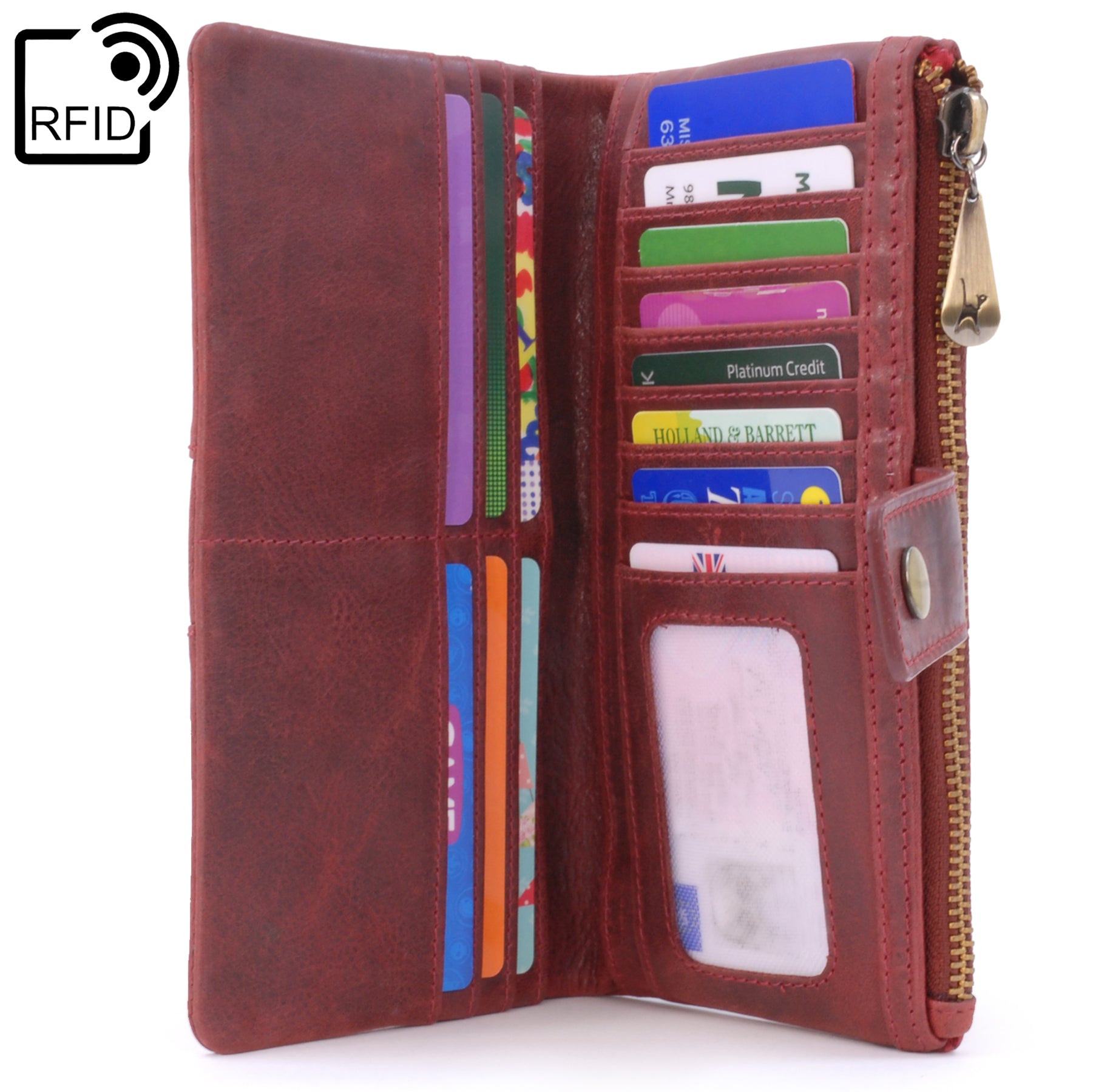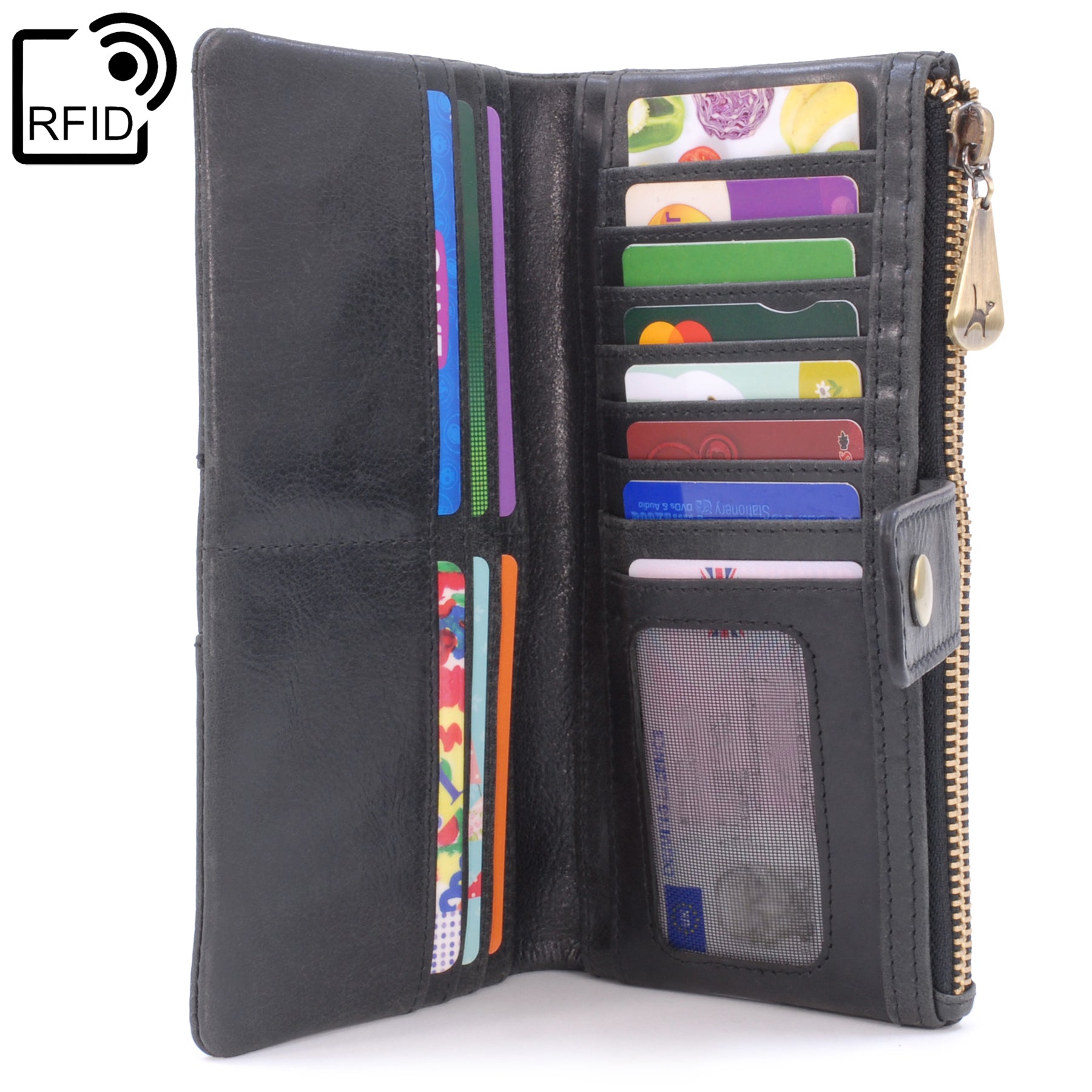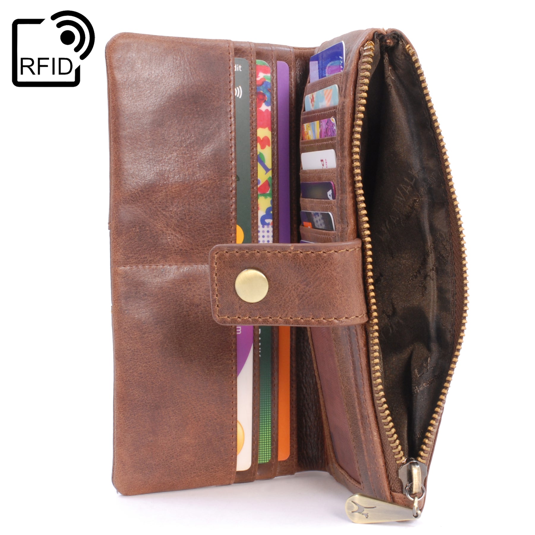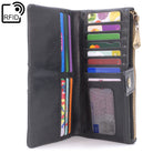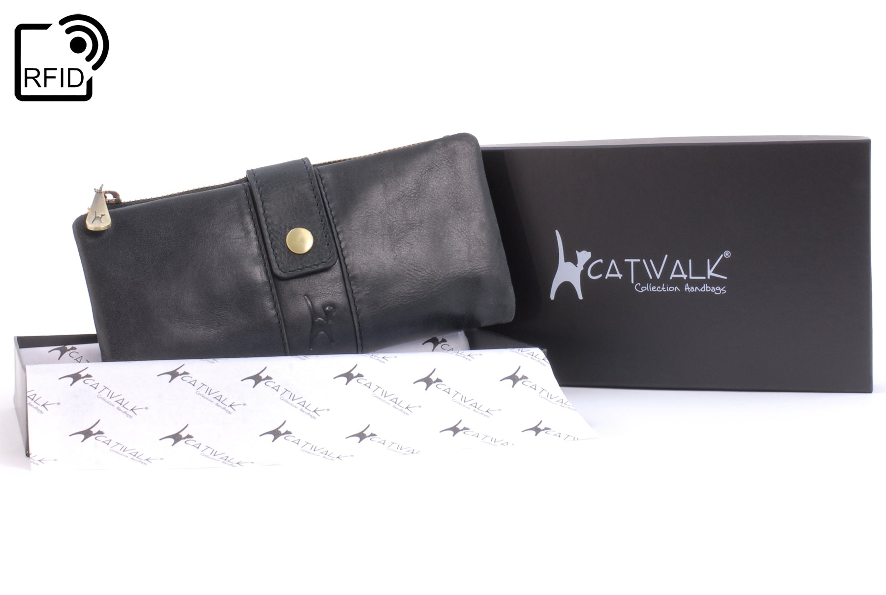 The Fiona large leather purse combines practical design with standout details. This ladies wallet features a distinctive Catwalk Collection Cat Logo imprinted into a solid brass zip pull, with the front panel also embossed with the signature cat logo. The secure metal brass zip coin compartment safely holds loose change. It offers space for 14 credit cards, including an ID window, along with a smart phone pocket measuring 17 x 8.5 cm, making it easy to organise and access your essentials.This purse includes Nationally Accredited RFID Protection to prevent chip readers from accessing data stored in biometric passports and credit cards, helping to protect against identity theft and contactless fraud. The interior is lined with a combination of leather and signature fabric.Each Fiona purse comes in a presentation gift box, suitable as a gift for women on Valentine’s Day, Mother’s Day, Birthdays, or Christmas.