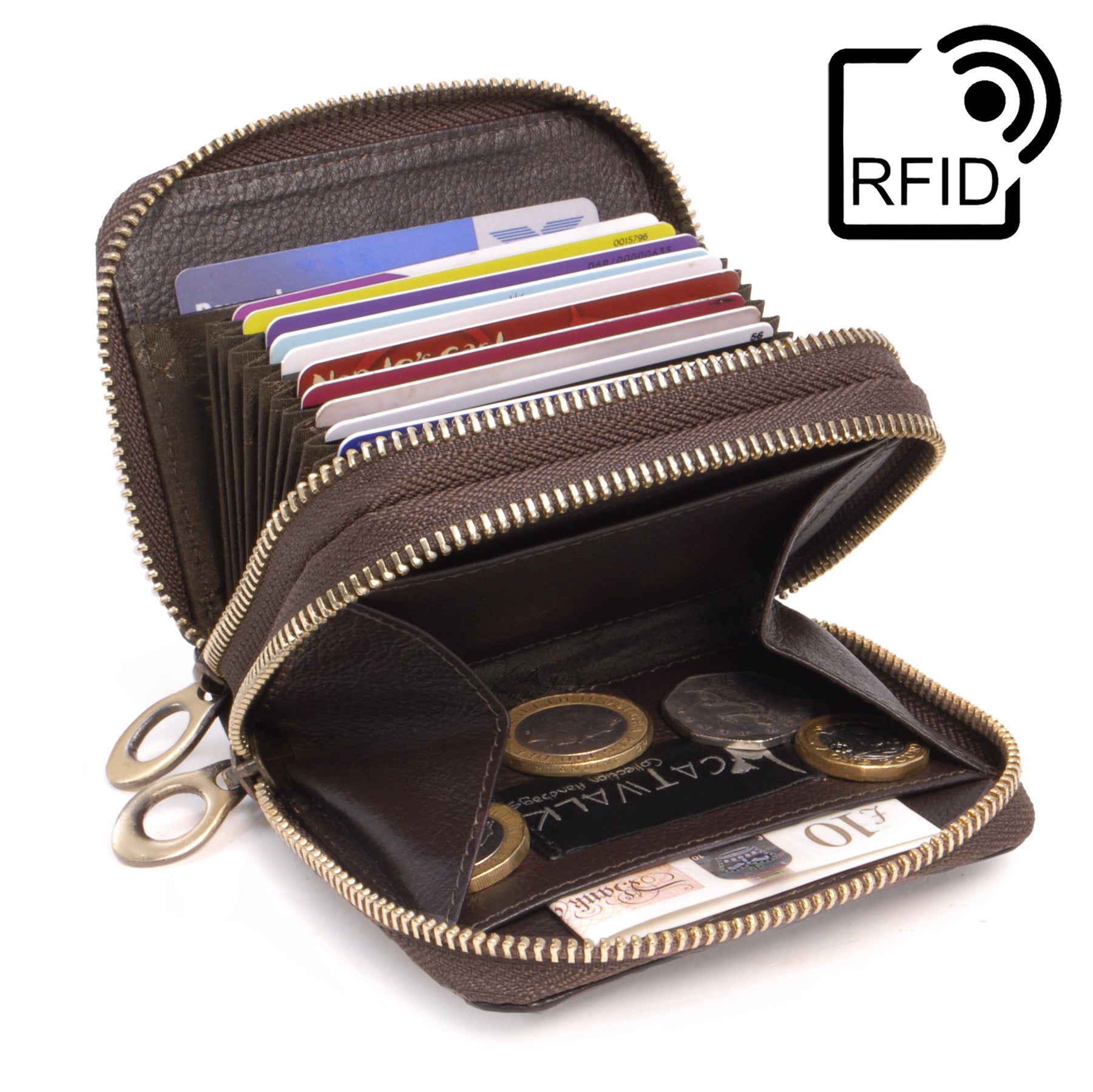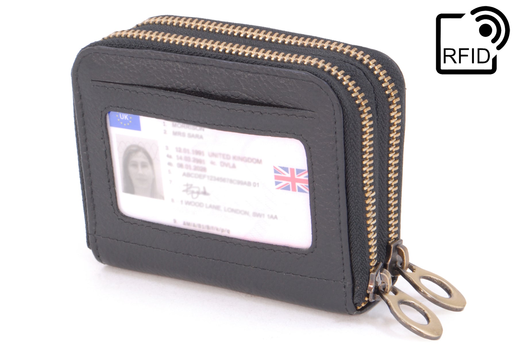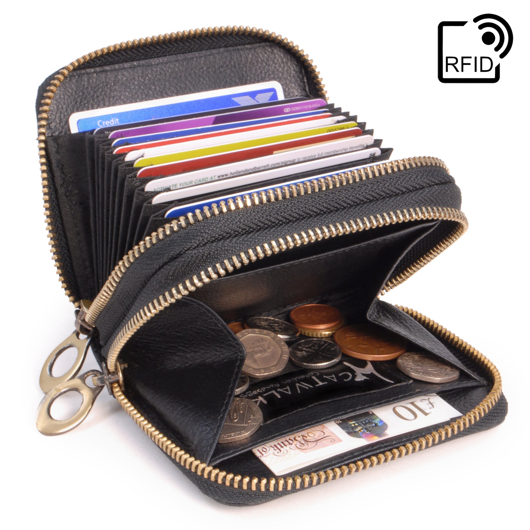 Pockets: 2 Main Compartments containing 12 Concertina Pockets for Cards + 1 Concertina Pocket for Coins + 4 Open Side Pockets for Notes + 1 Outer Rear Pocket for ID