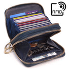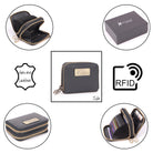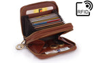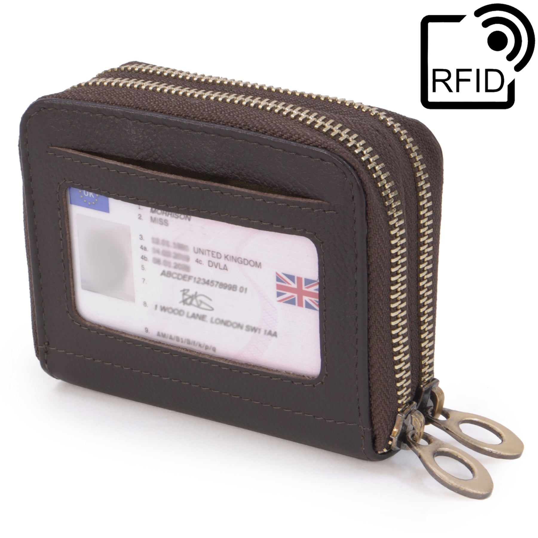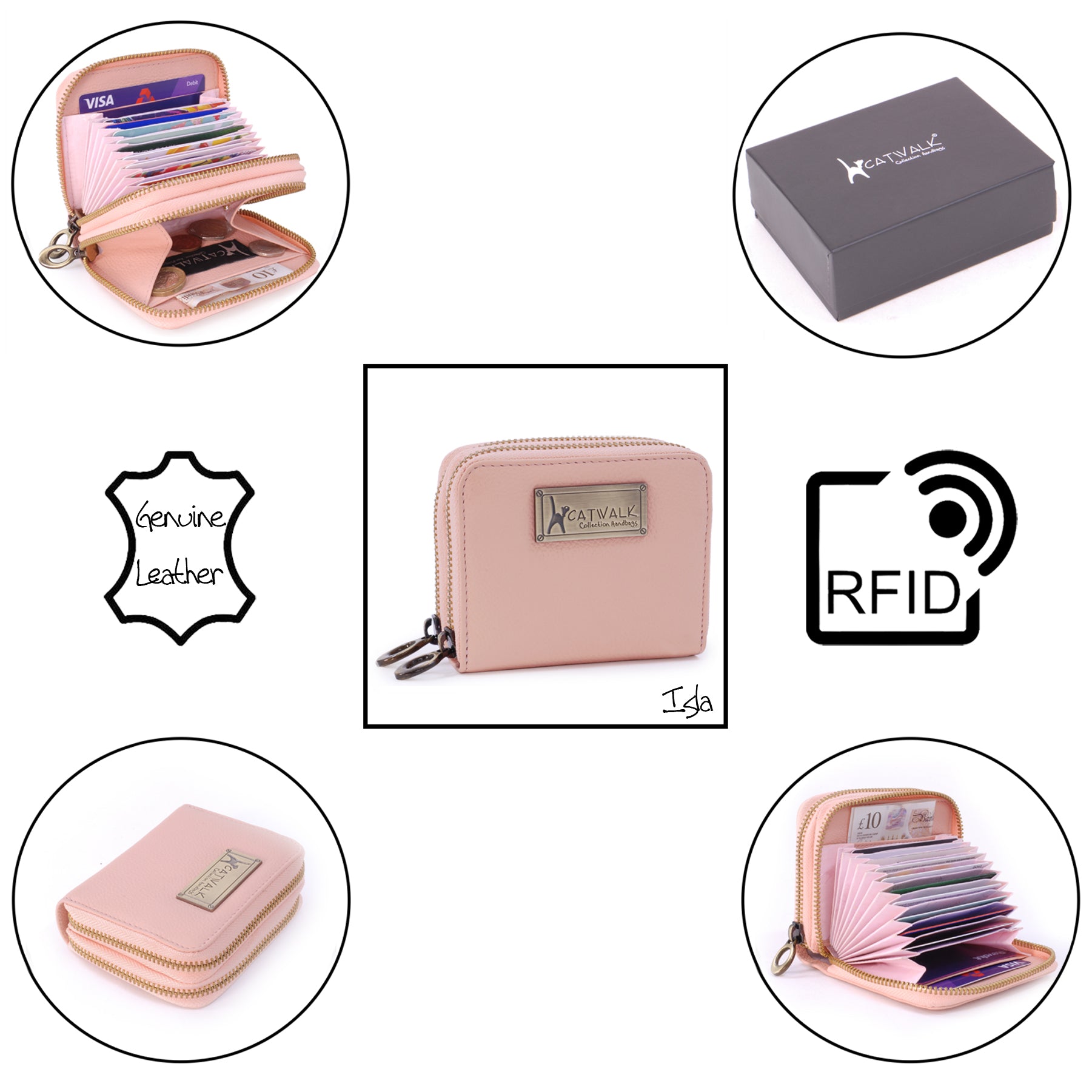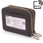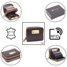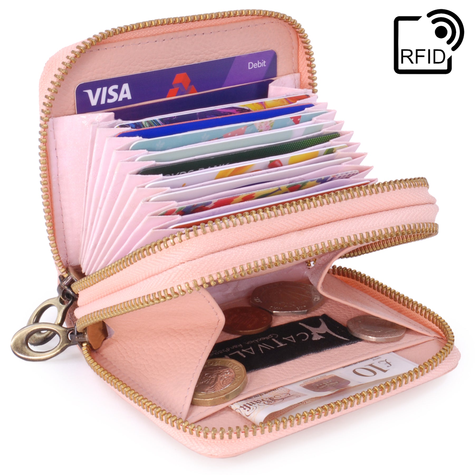 Pockets: 2 Main Compartments containing 12 Concertina Pockets for Cards + 1 Concertina Pocket for Coins + 4 Open Side Pockets for Notes + 1 Outer Rear Pocket for ID