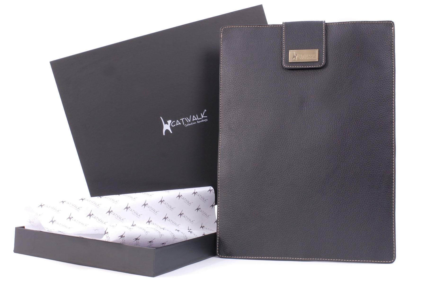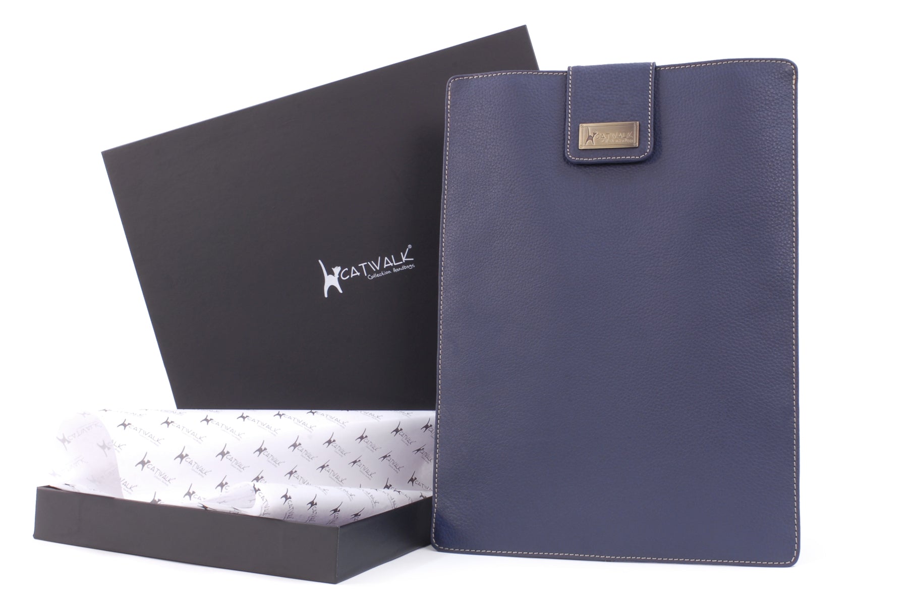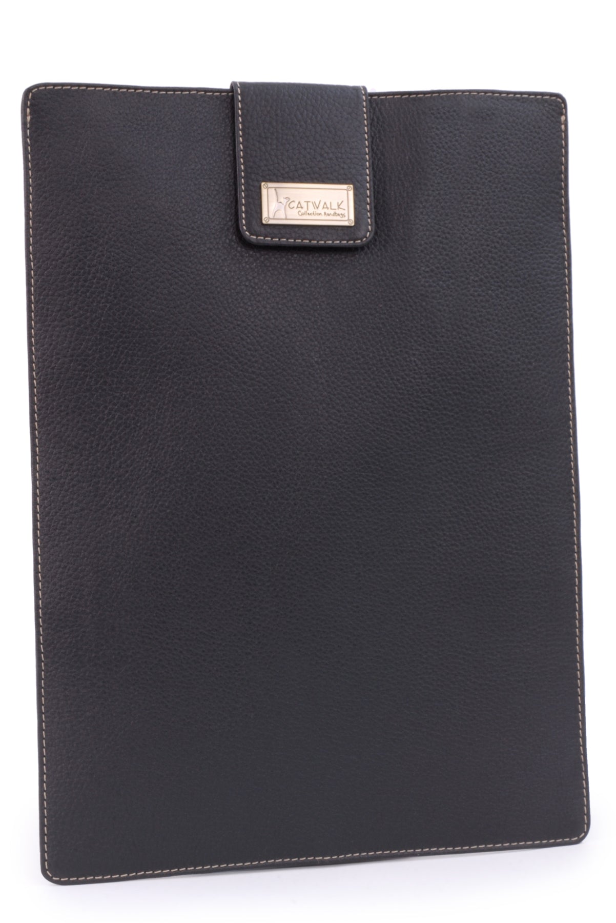 Contrast stitching highlights the fine features of the laptop sleeve. The Catwalk Collection Cat Logo is stylishly imprinted into a brass plate attached to the front panel.