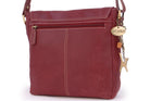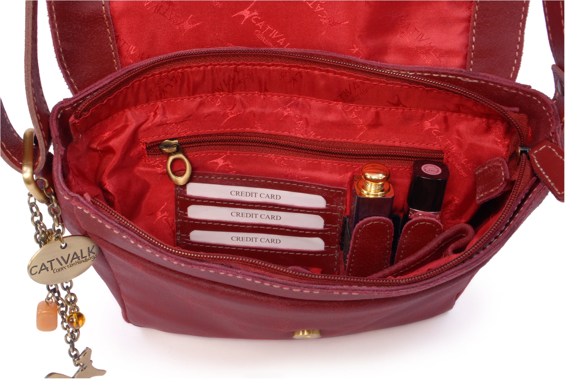 The long adjustable strap is made from leather; wear over the shoulder or hands free across the body.