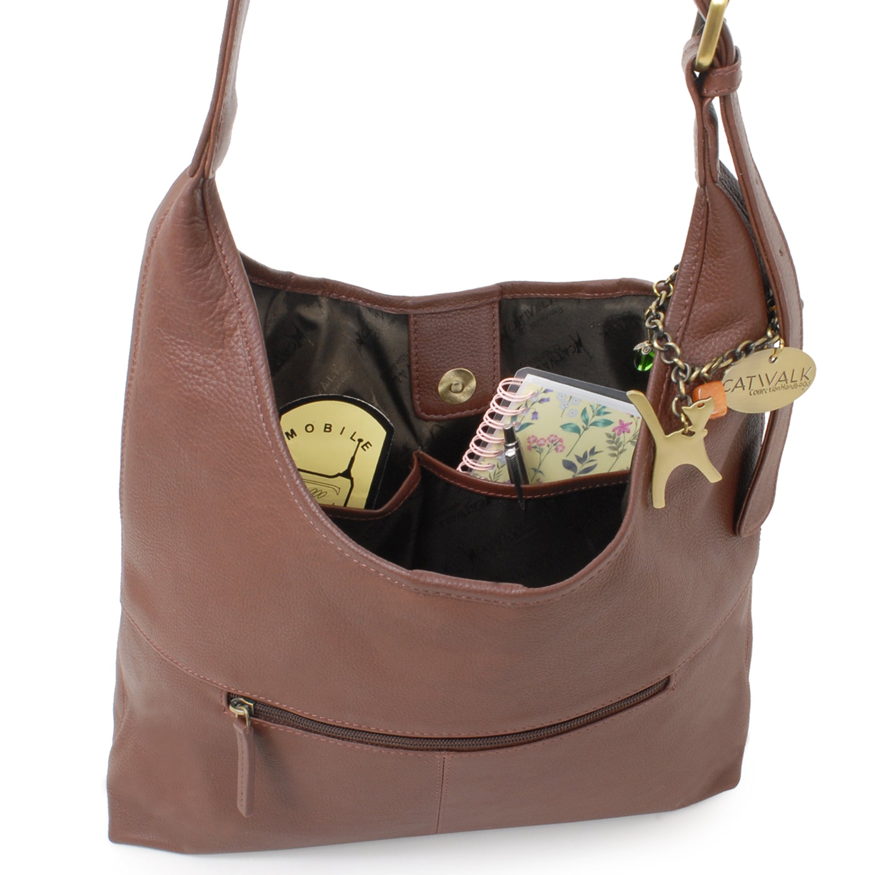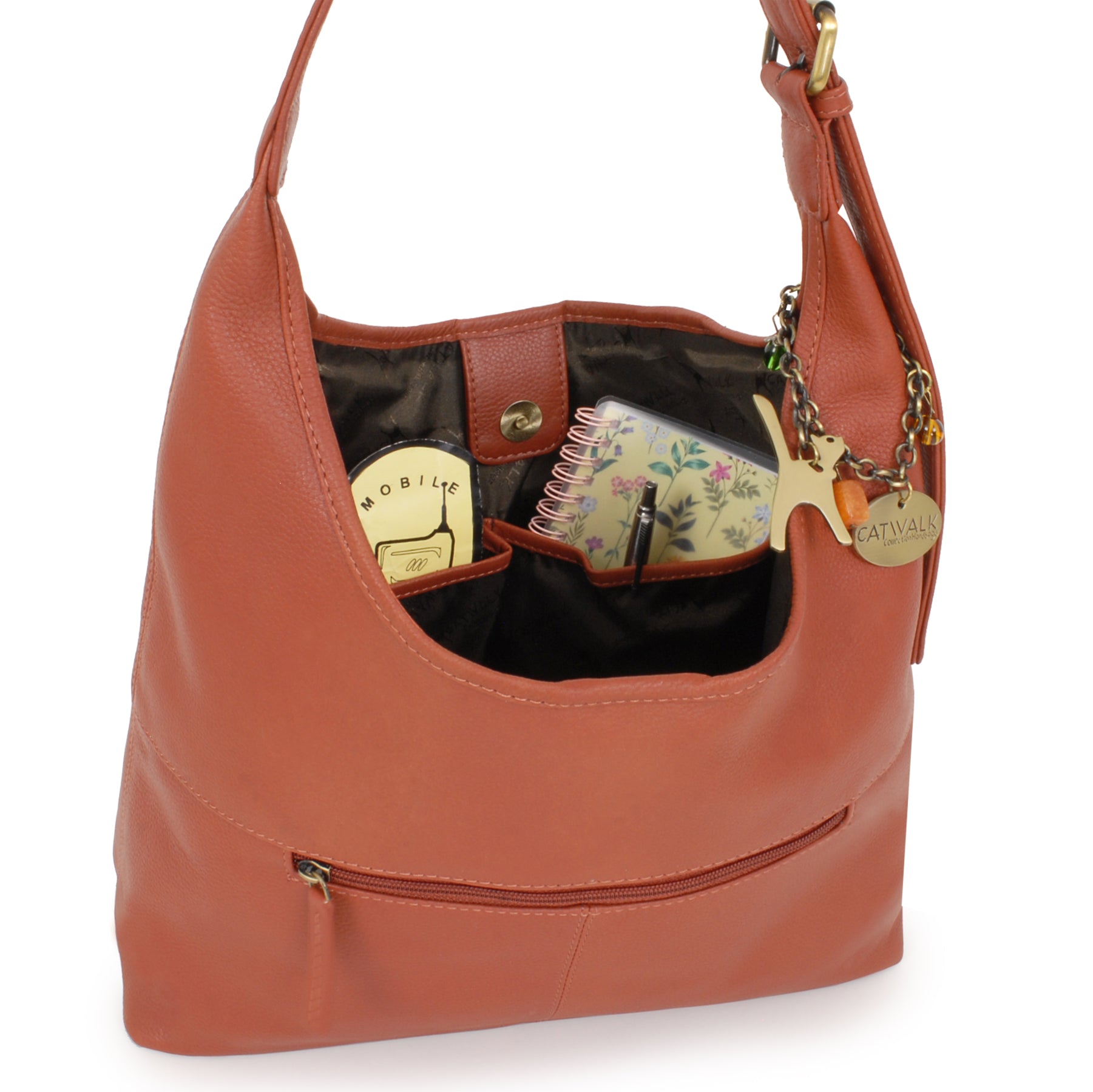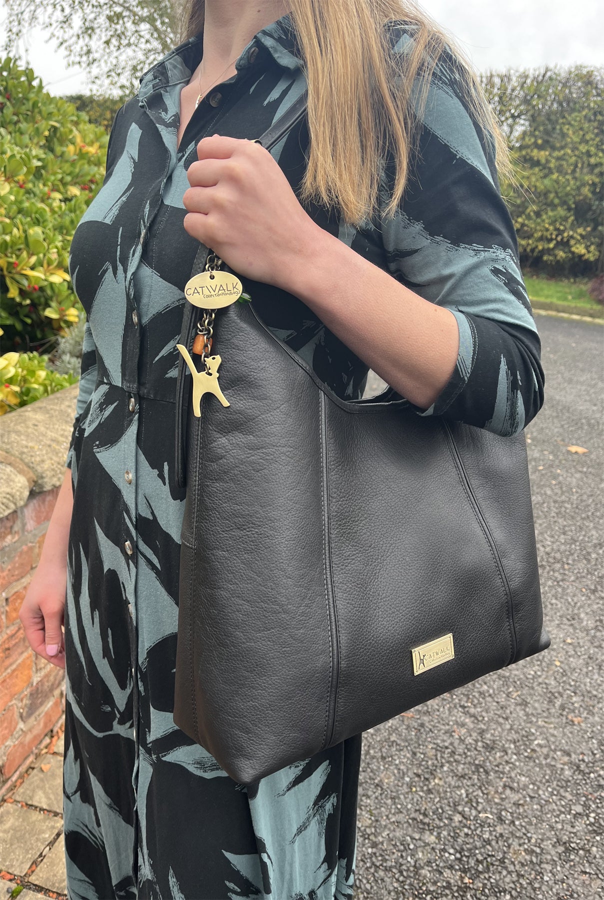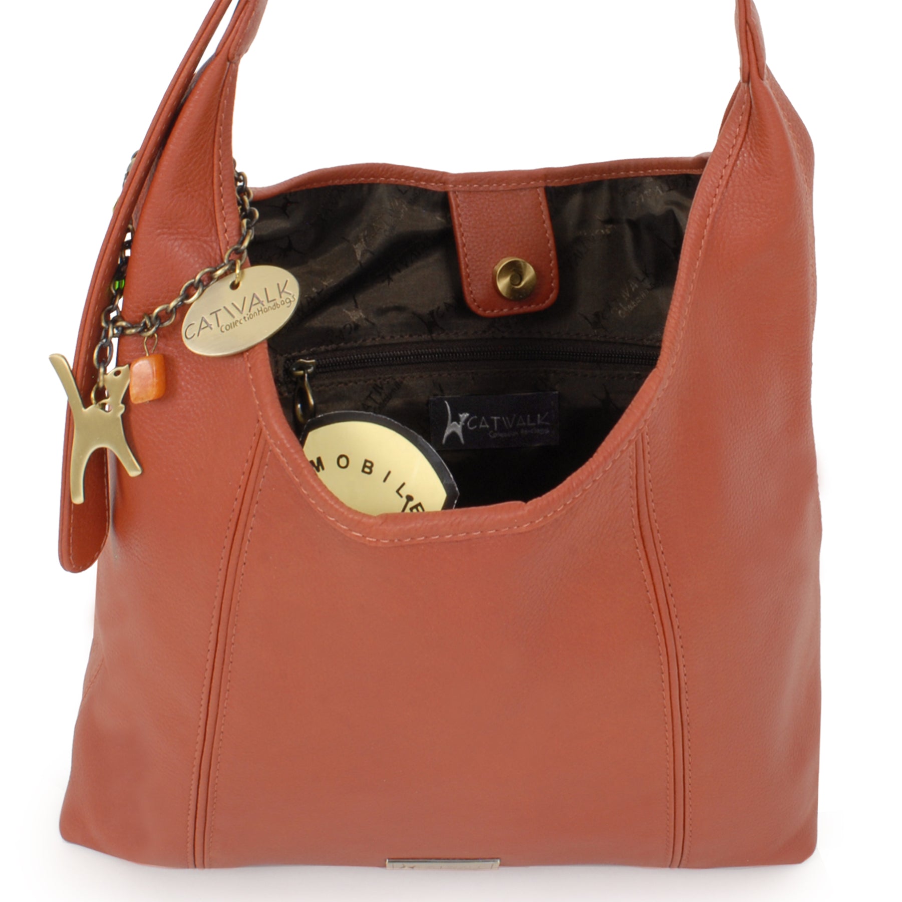 The spacious interior accommodates an A5 diary, purse, make-up case, and all your everyday essentials. Organisational features include an open pocket, a mobile phone pocket, and a zipped pocket for valuables. The interior is fully lined with signature fabric. The wide opening secures with a magnetic pop fastener for easy access, while a flat base ensures the bag stands upright. The Catwalk Collection cat logo is stylishly imprinted on a brass plate attached to the front panel, completing the elegant design.