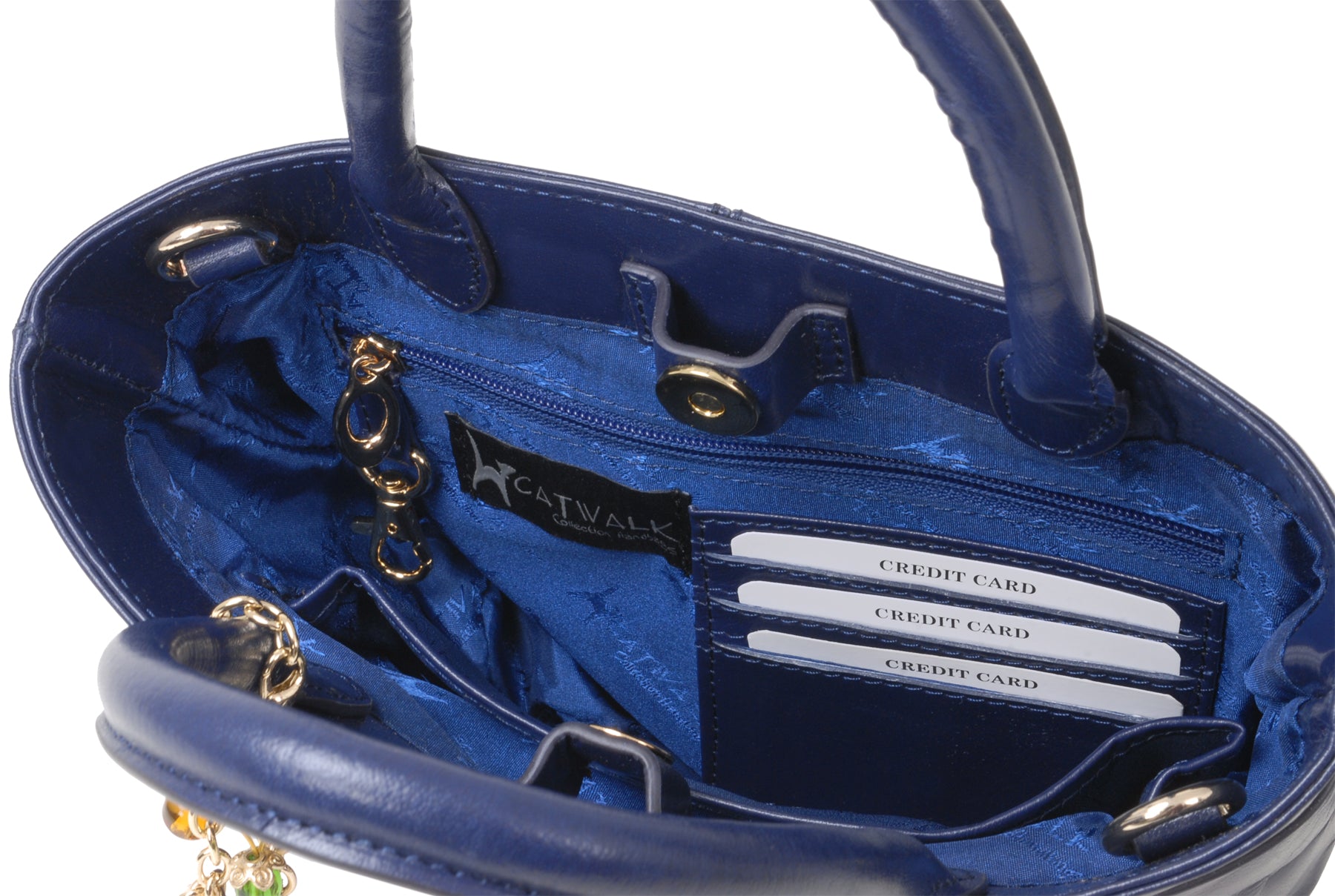 Pockets: 1 Main Compartment + 1 Interior Rear Zipped Pocket + 1 Leather topped Mobile Phone Holder + 3 Credit Card Holders + 1 Spring Clip Key Fob