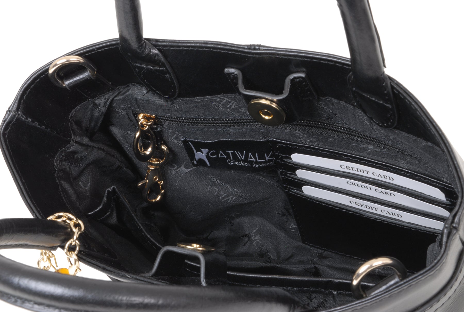 The interior is thoughtfully designed to keep belongings organised and accessible. It features three credit card slots, a mobile phone pocket that fits most smartphones, a zip compartment for valuables, and a built-in key clip. The bag opens wide for easy access and closes securely with a magnetic pop fastener, combining style with everyday functionality.