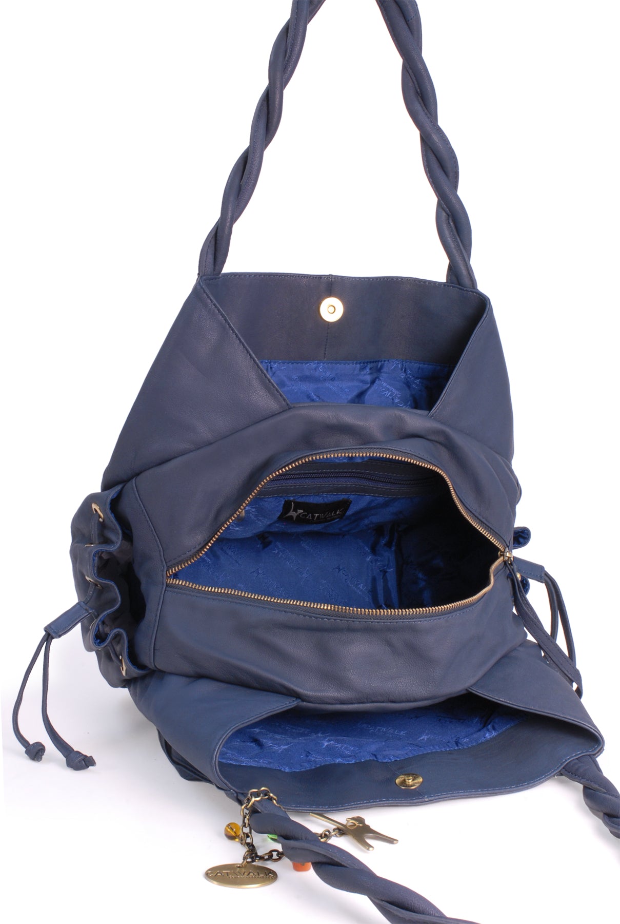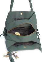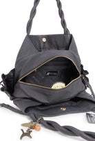 Pockets: 3 Compartments + 1 Interior Side Zipped Pocket + 1 Interior Leather Mobile Phone Holder + 1 Leather interior open pocket + 2 Outer Front Zipped Pockets + 2 Outer End Drawstring Pockets