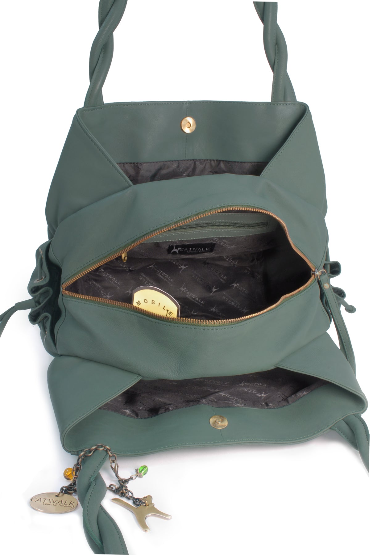 The central compartment fastens with a zip and the two sides snap together over the top with a magnetic snap for added security. The base of the bag is flat.