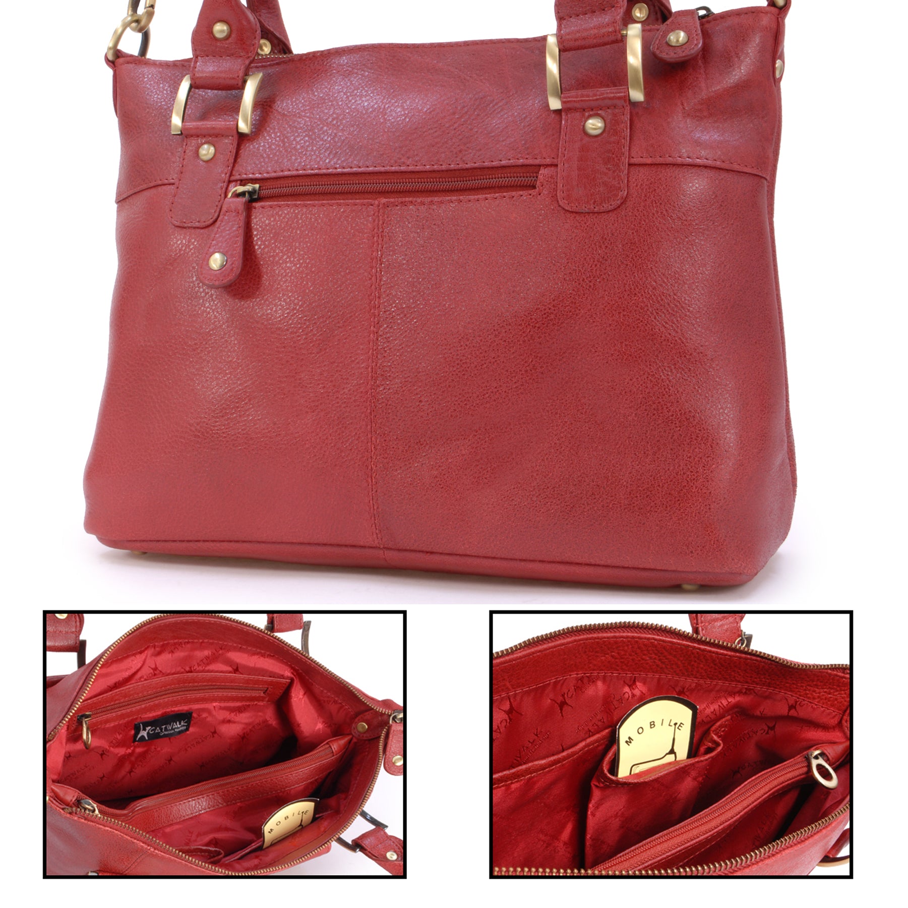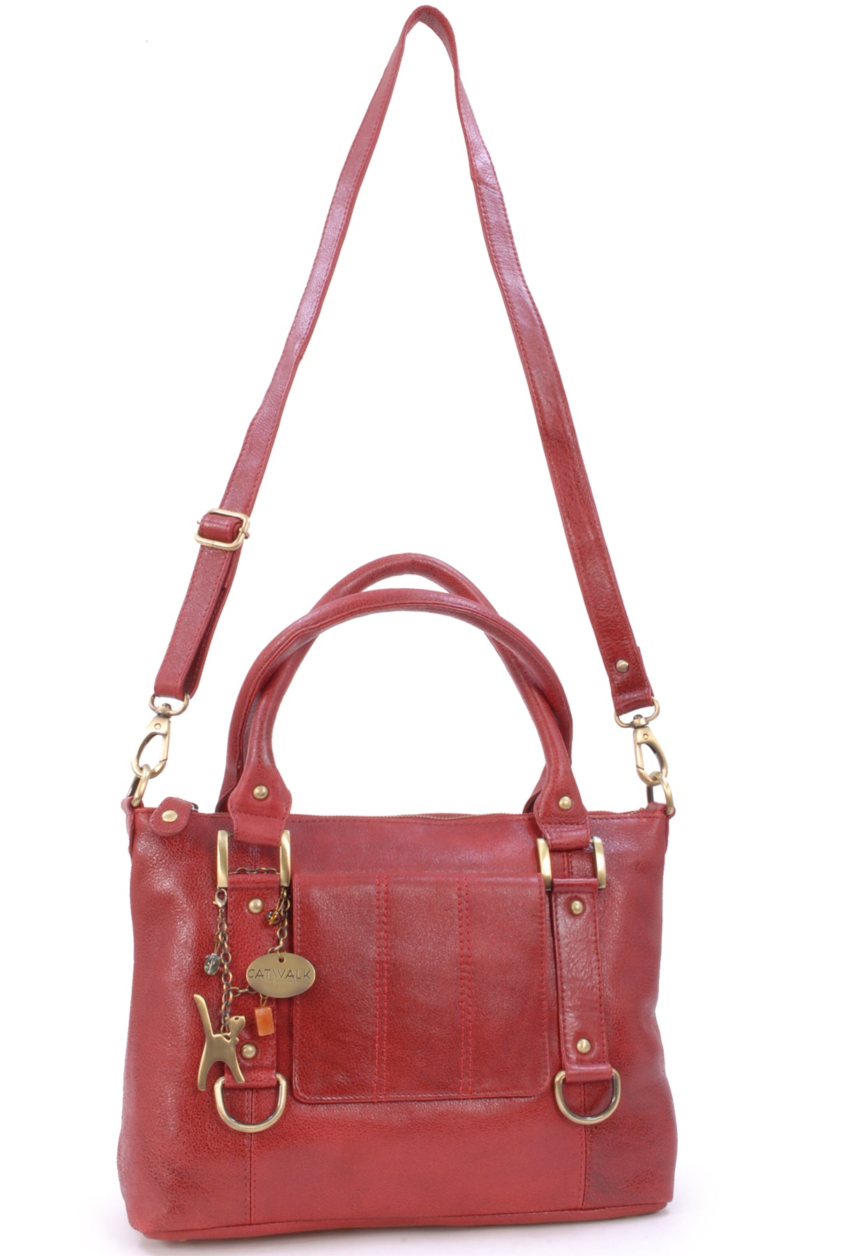 The long detachable, adjustable strap is made from leather; wear either over-the-shoulder or hands-free across-the-body.
