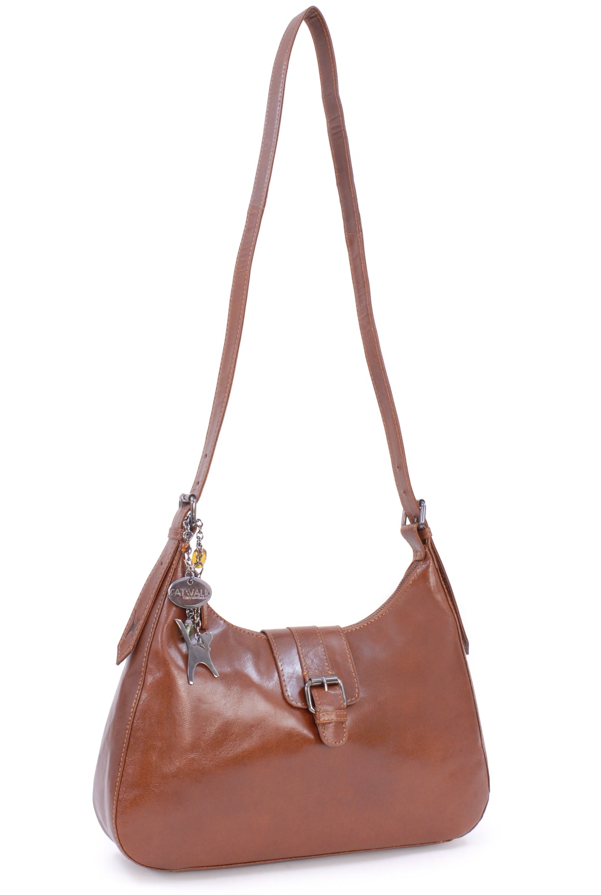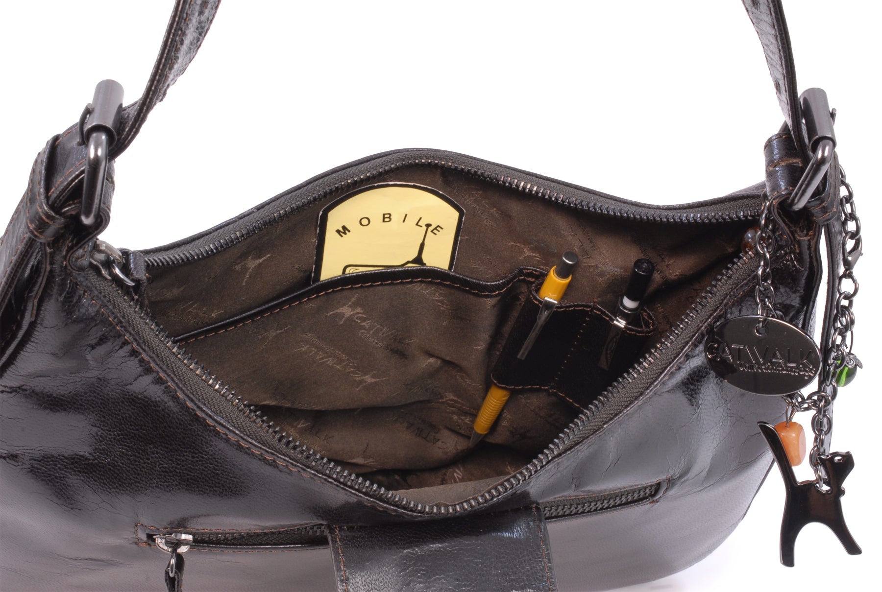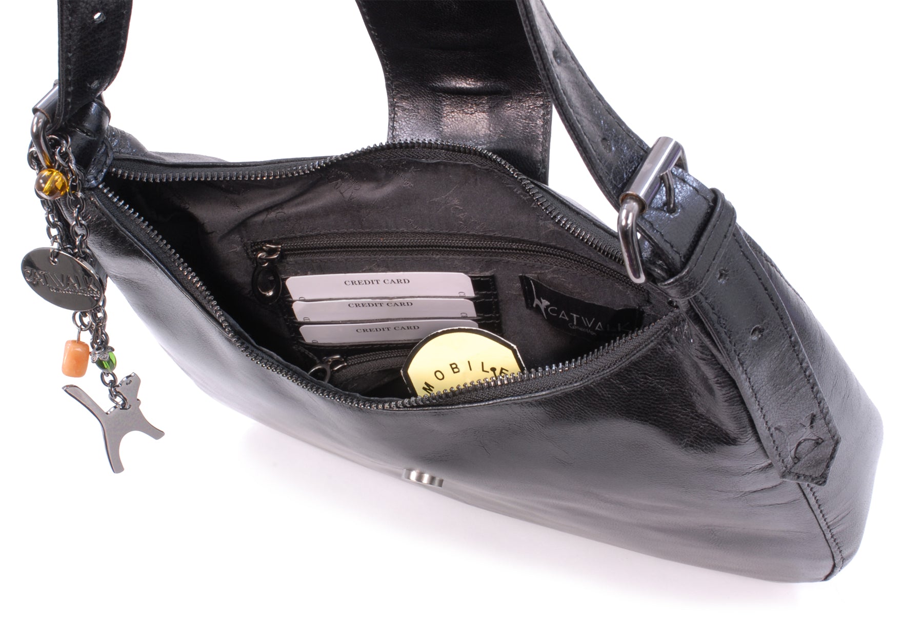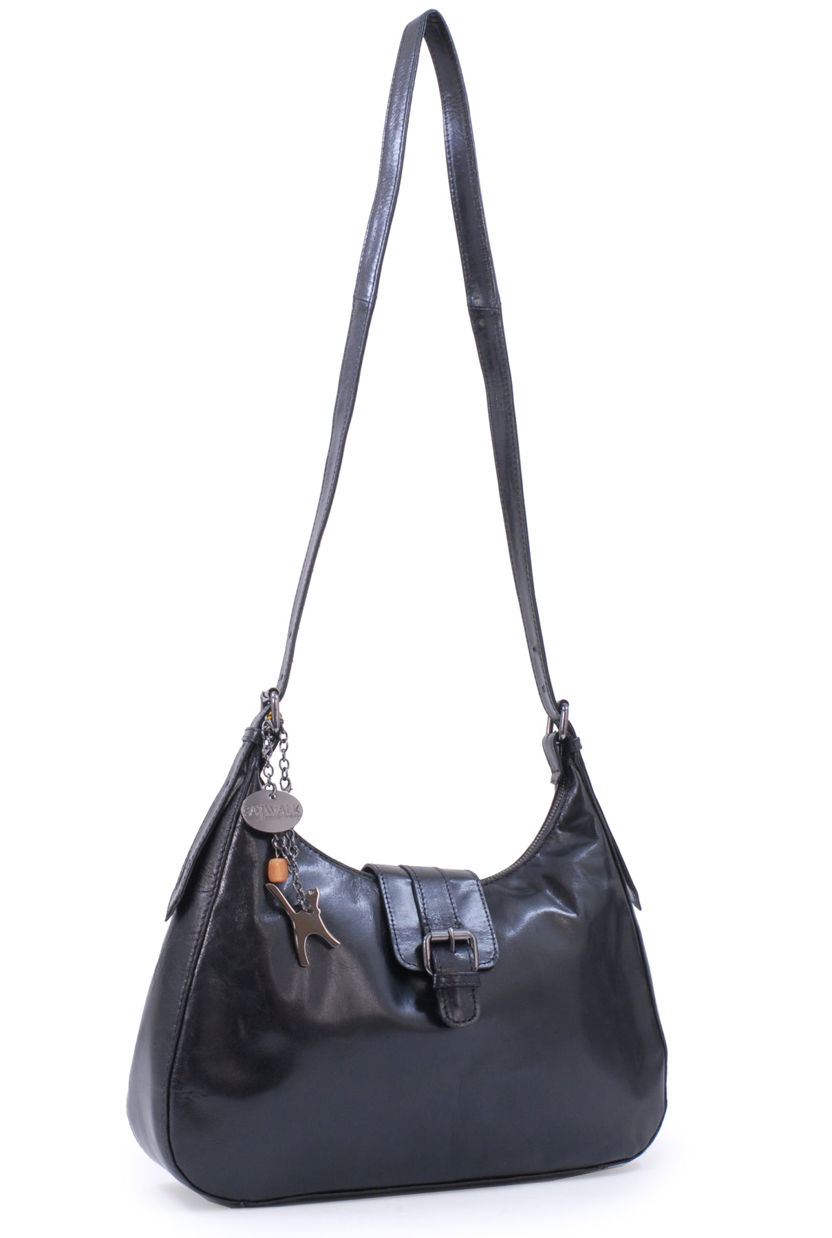 This is a mid-sized bag with plenty of compartments and pockets to organise contents. Fine tailoring and solid gun metal fittings give this impressive bag its unique character. The Catwalk Collection Cat Logo is stylishly imprinted onto the strap.