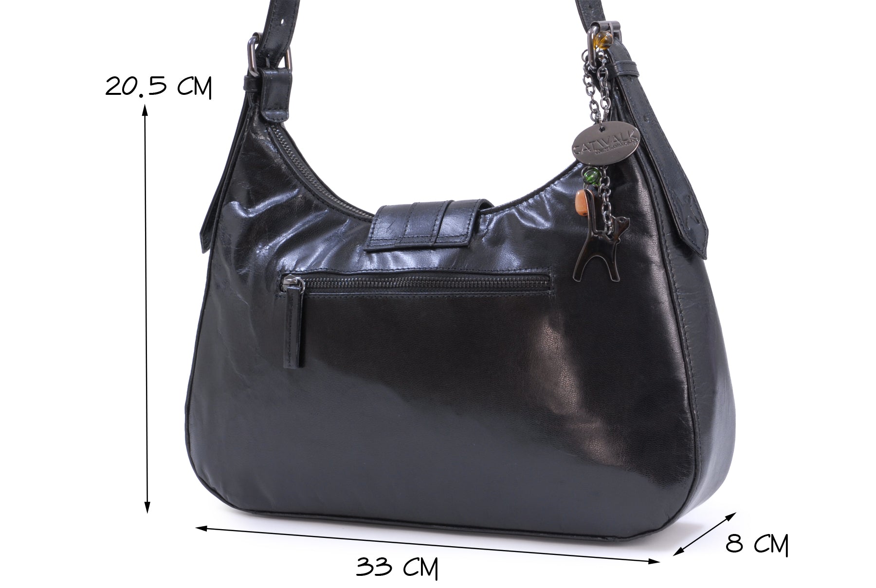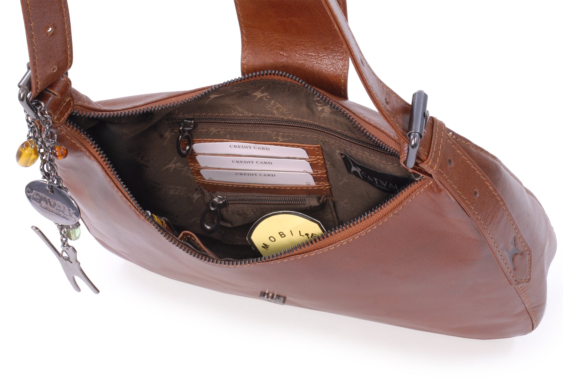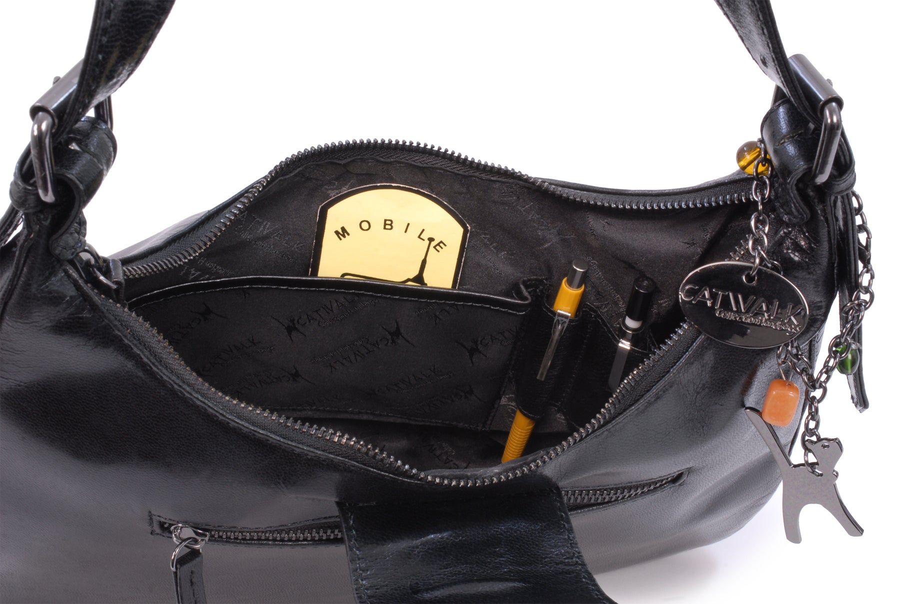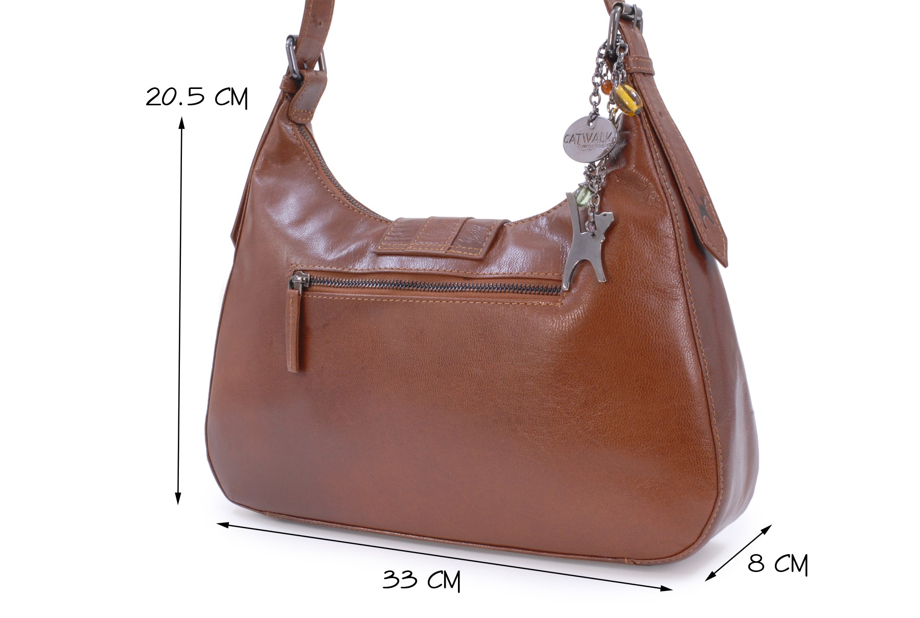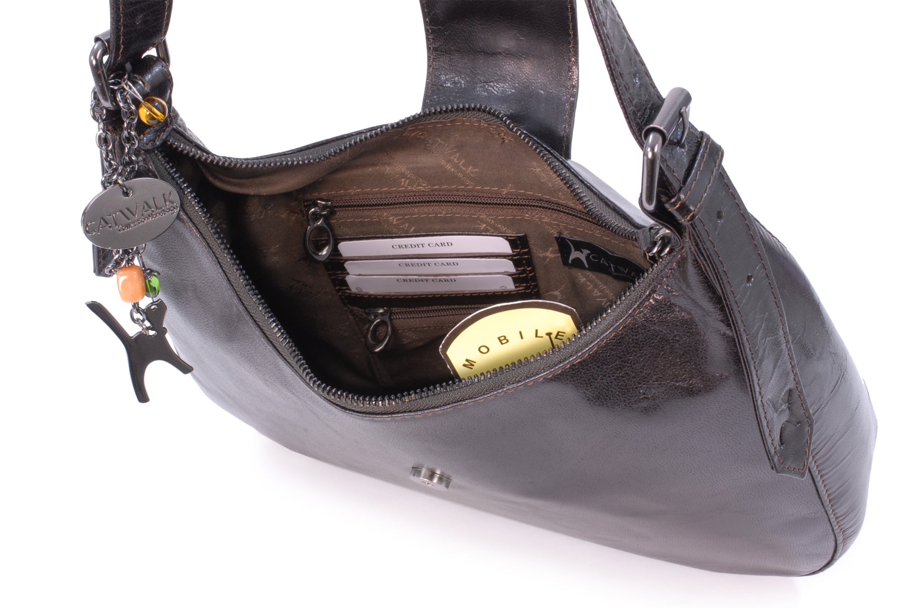 This is a mid-sized bag with plenty of compartments and pockets to organise contents. Fine tailoring and solid gun metal fittings give this impressive bag its unique character. The Catwalk Collection Cat Logo is stylishly imprinted onto the strap.