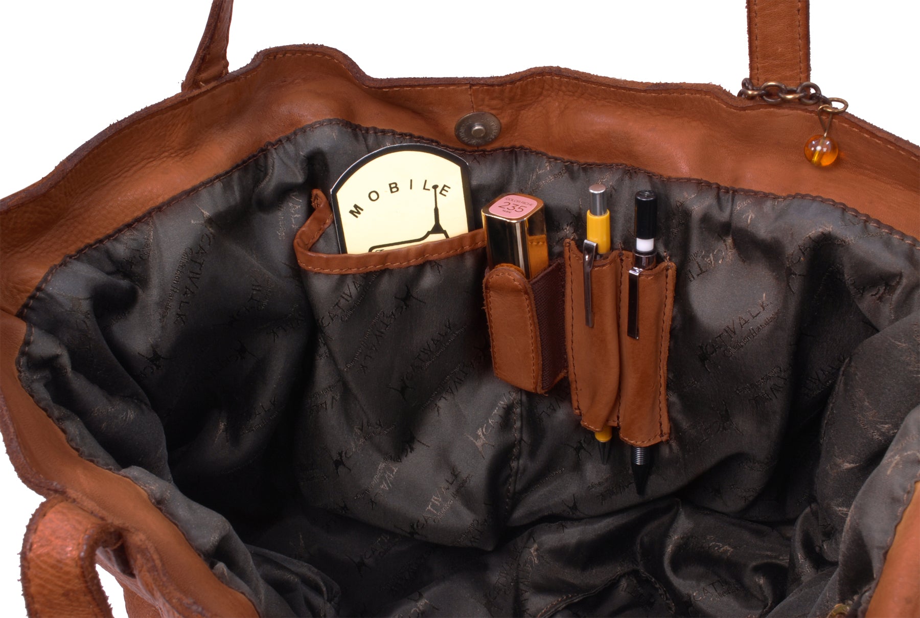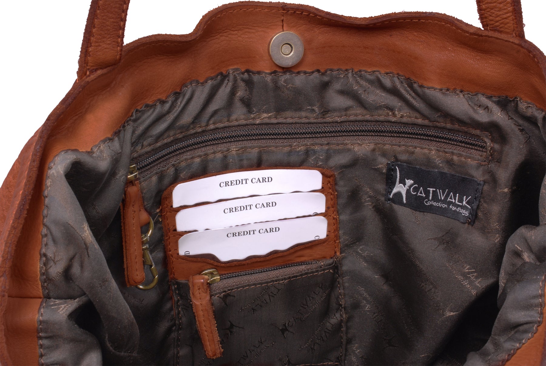 This large tote bag is crafted from washed leather, giving it a relaxed structure with a naturally distressed appearance. Designed for work, travel, and everyday use, the spacious interior offers sufficient capacity to hold a laptop, files, and folders up to A4 size. The shoulder bag opens wide for easy access and secures with a magnetic popper fastening, combining practicality with ease of use.